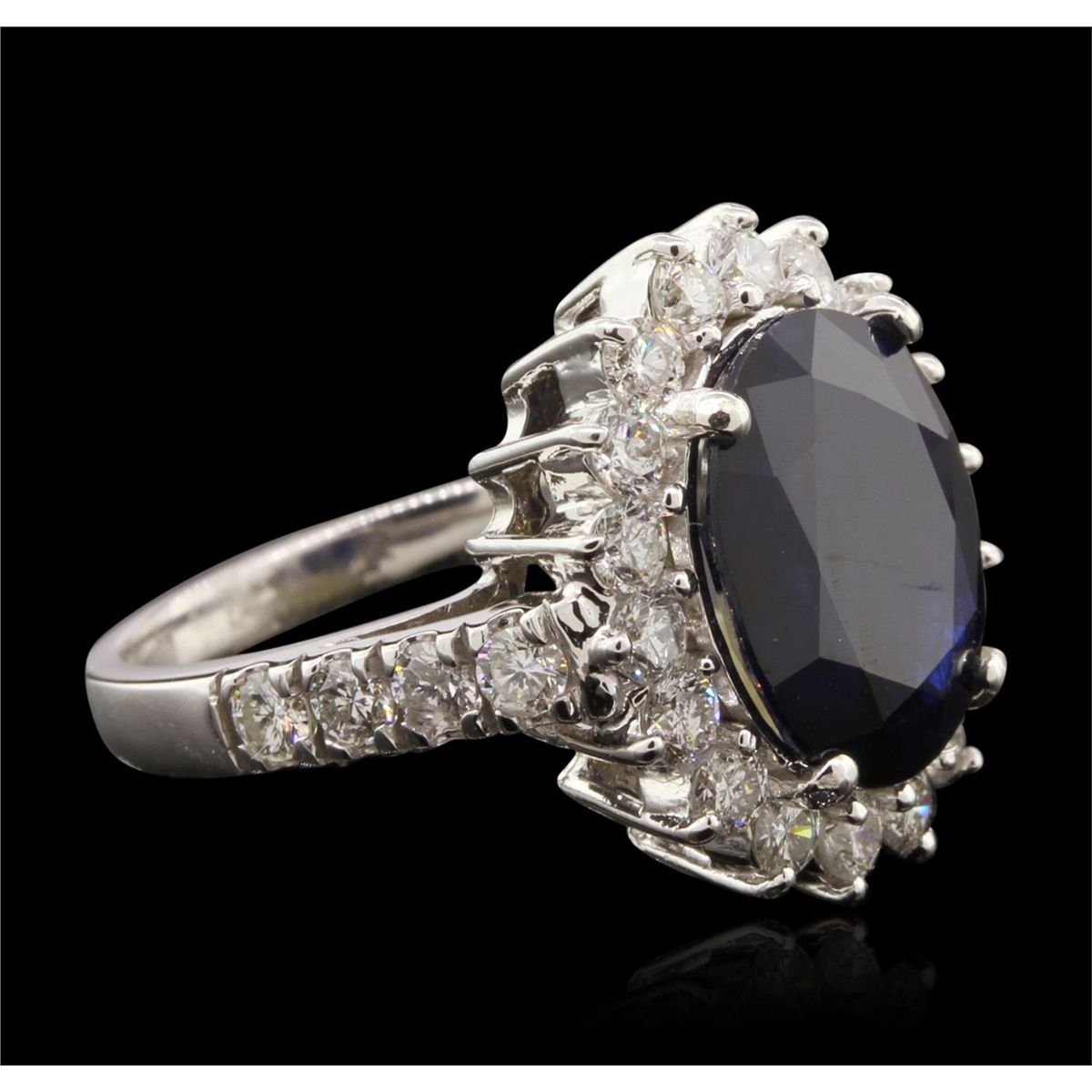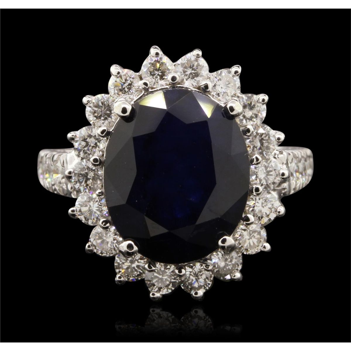 One electronically tested 14KT white gold ladies cast sapphire and diamond ring with a bright polish finish. The featured sapphire is set within a diamond bezel, supported by diamond set shoulders and completed by a two millimeter wide band. Identified with markings of "K14". Condition is new, good workmanship. Containing: One prong set oval mixed cut natural blue sapphire, measuring 12.90 x 10.50 x 5.30mm, approximate weight of 6.07ct., clarity is heavily included, type II, dark, strong, violetish blue color, (GIA vB 7/5), cut is good. Transmitting light very diffusely, opaque. Naturally occurring internal & external characteristics are present. Indications of multiple laboratory enhancements, including high temperature heat treatment. Colored Stone Grading Report attached. Graded in the setting. Twenty-Six prong set round brilliant cut diamonds, measuring 2.50 - 2.50 x 1.50mm (depth est.) approximate. Total Weight of 26 Stones = 1.55ct. Graded in the setting. Clarity: SI-2 to I-1 . Color: G - I. Total Weight of Colored Stones 6.07ct. Total Weight of Diamonds 1.55ct. AIG Appraised at $6,935.00.