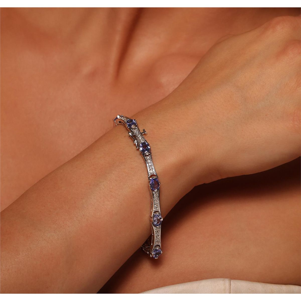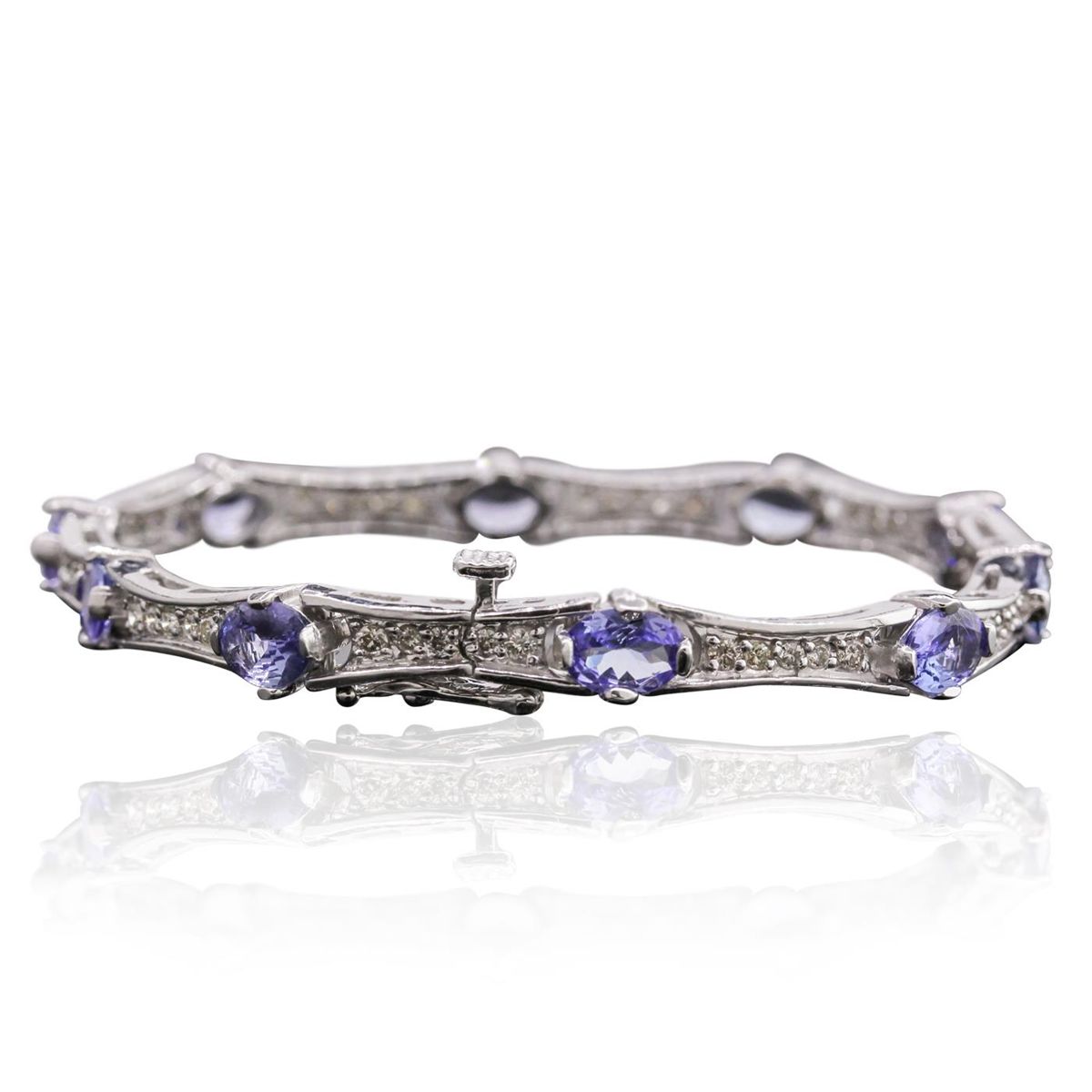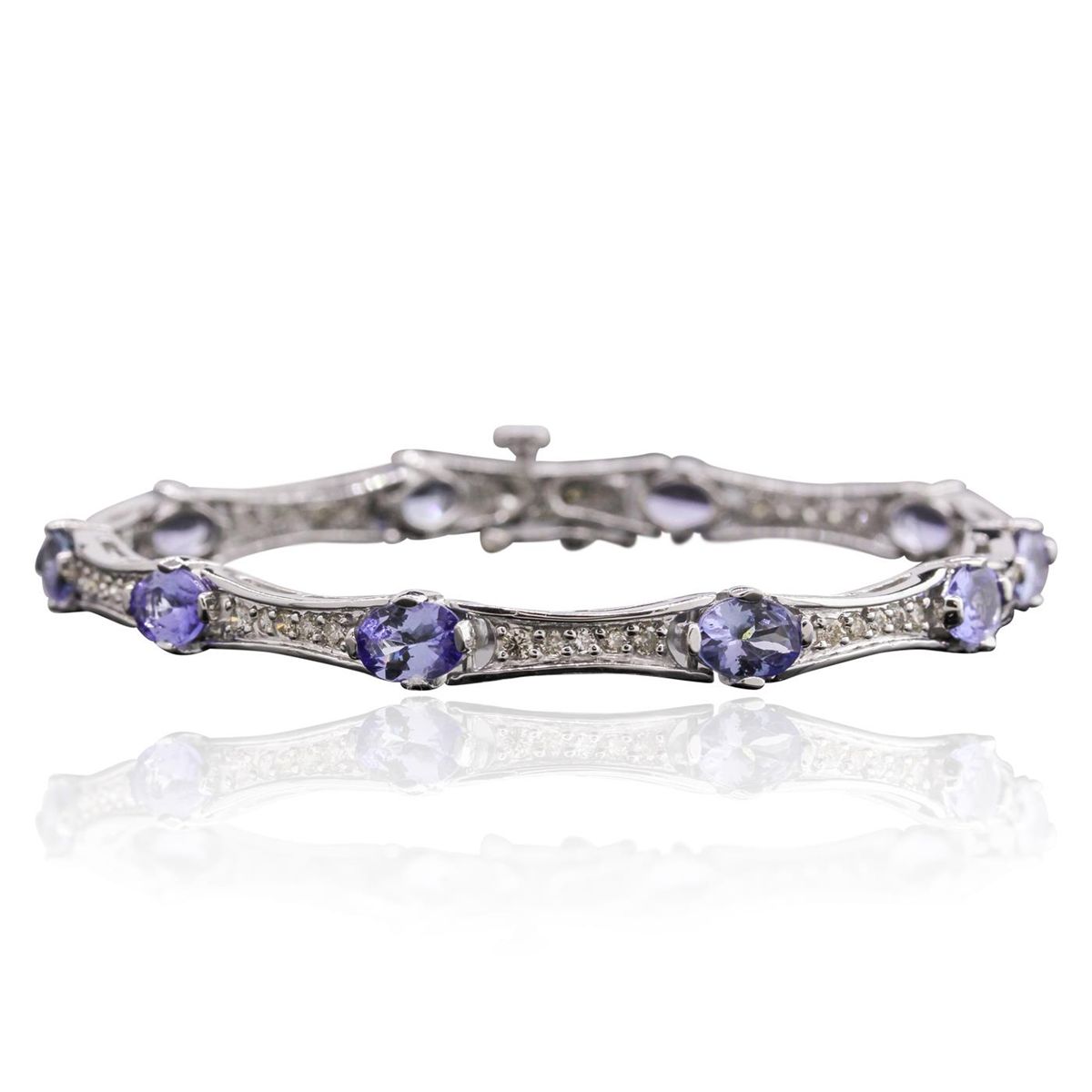 One electronically tested 14KT white gold Ladies combination cast & assembled bracelet with a hidden box clasp with a bright polish finish. Condition is new. Measurements: 7" in length. Identified with markings of "14K". Containing: Ten prong set oval modified brilliant cut natural tanzanites, measuring 7.42 x 6.05 x 3.33mm, approximate. Total Weight of 6.08ct., clarity is eye clean, type I, medium light, very slightly grayish, violet color, (GIA V 4/3), cut is very good. Colored gemstones are presumed to have been subjected to commonly used color/clarity enhancement processes. Fifty prong set round brilliant cut diamonds, measuring 2.00 - 2.00 x 1.20mm (depth est.) approximate. Total Weight of 50 Stones = 1.06ct. Clarity: I-1 to I-2. Color: J - K, Cut is Good. Total Weight of Colored Stones 6.08ct. Total Weight of Diamonds 1.06ct. Total Weight of Bracelet 15.50 grams. GGL Appraised at $12,745.00.