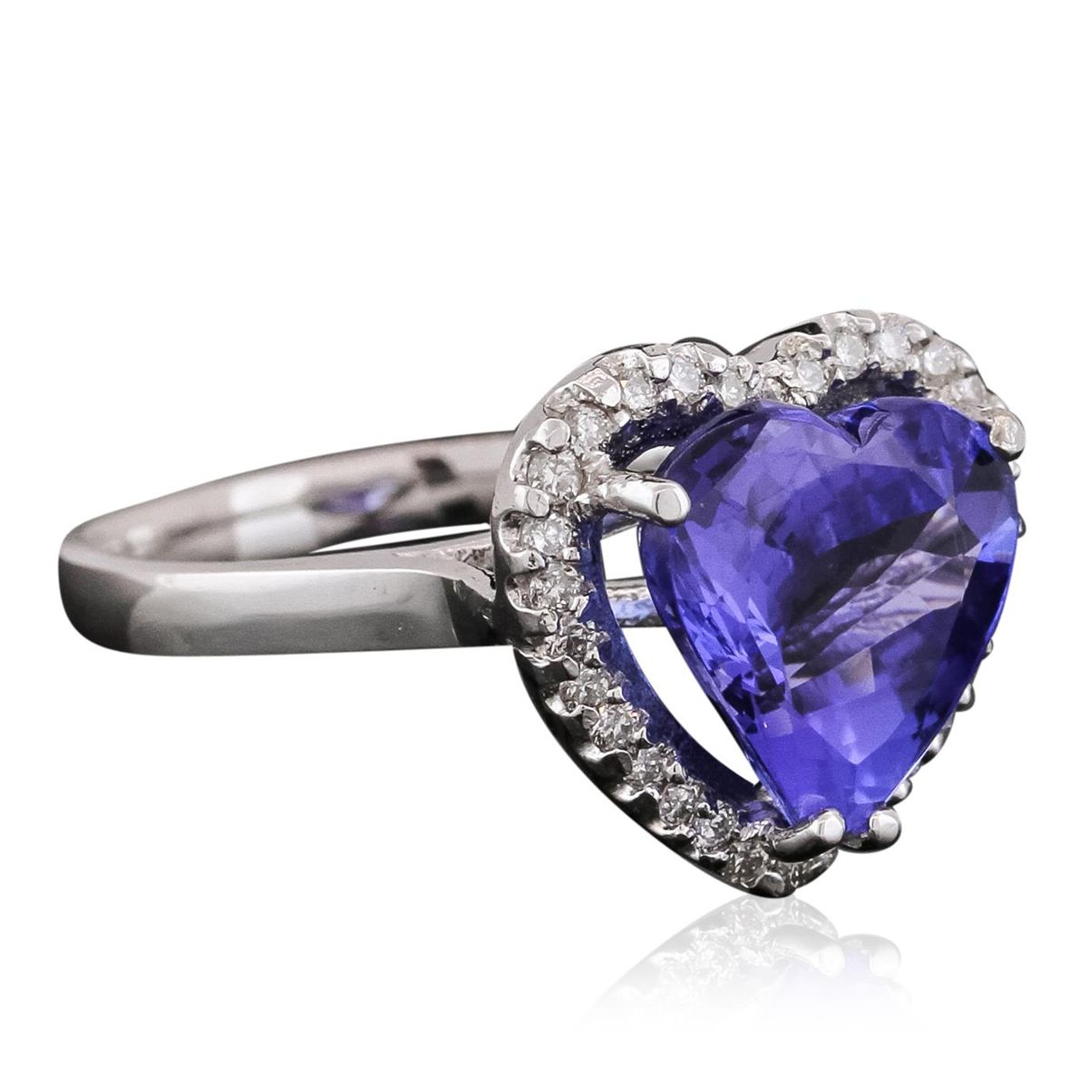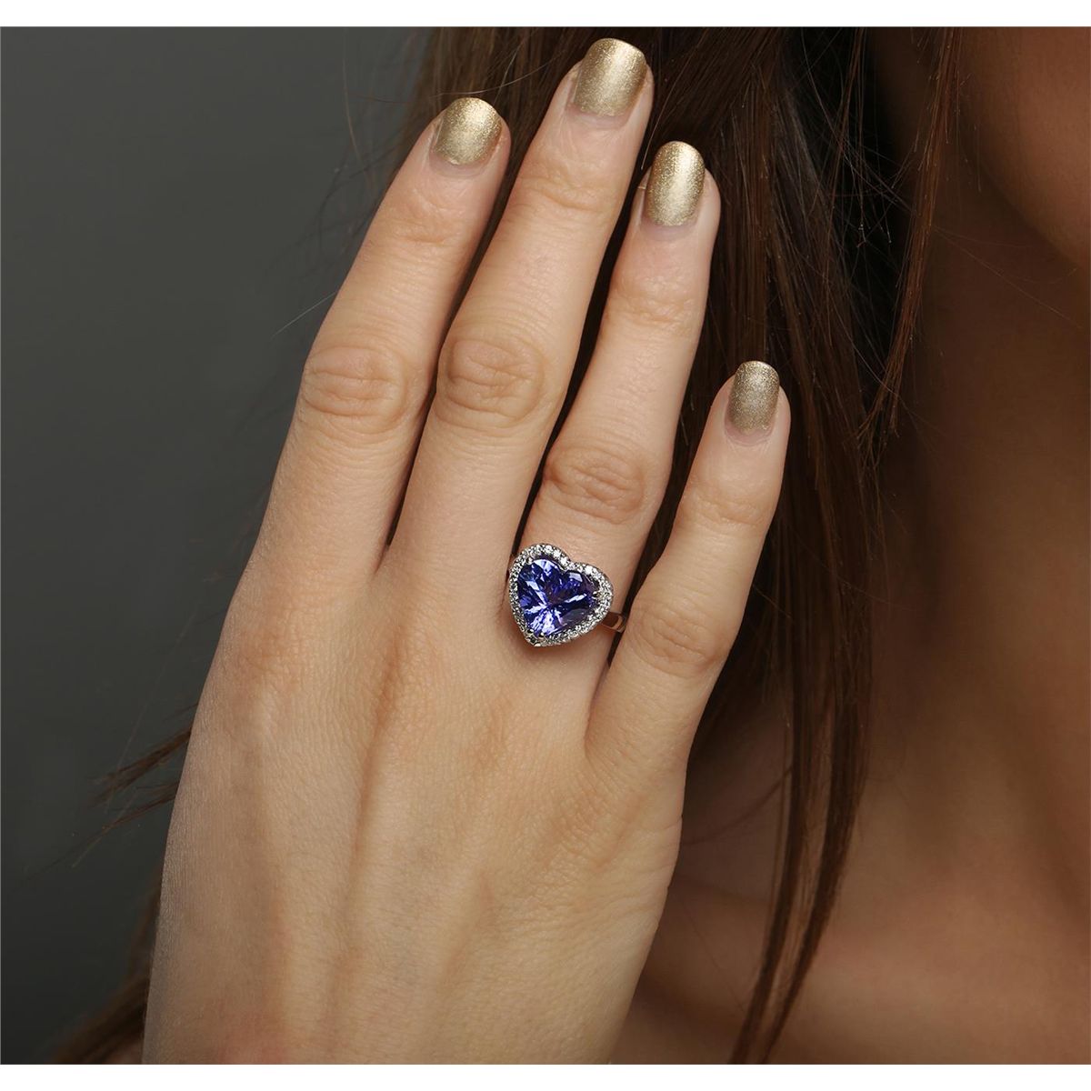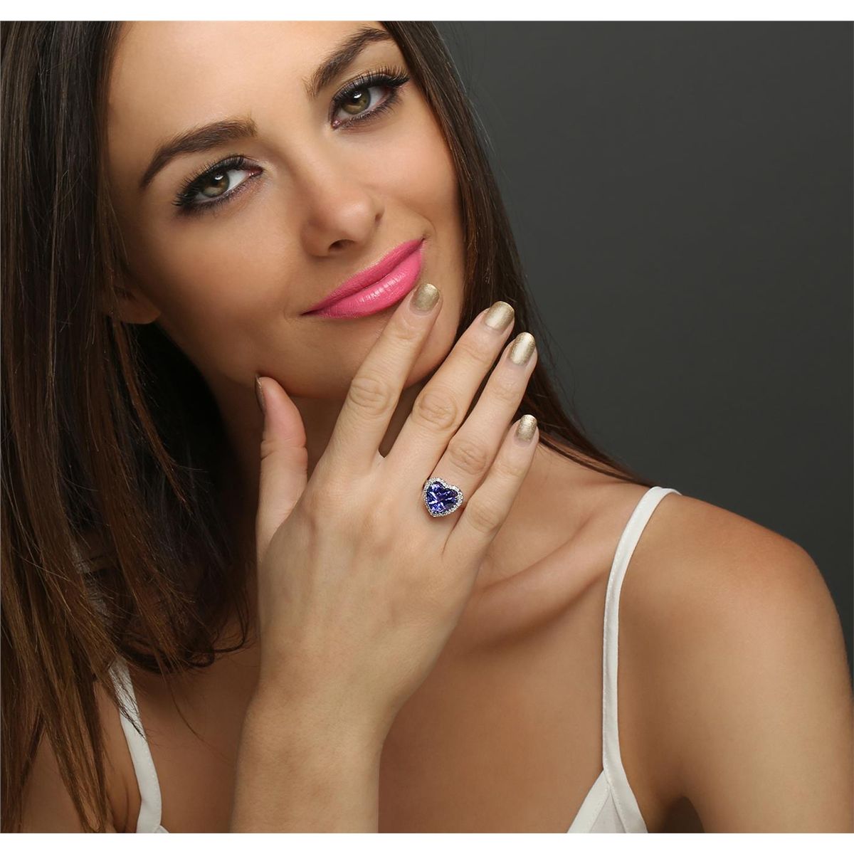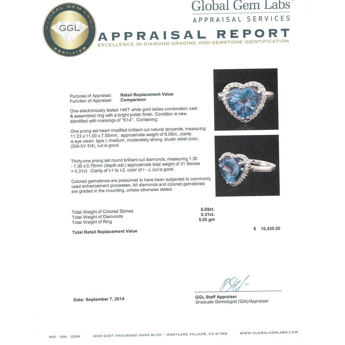 One electronically tested 14KT white gold ladies combination cast & assembled ring with a bright polish finish. Identified with markings of "K14". Condition is new. Containing: One prong set heart modified brilliant cut natural tanzanite, measuring 11.23 x 11.00 x 7.55mm, approximate weight of 6.09ct., clarity is eye clean, type I, medium, moderately strong, bluish violet color, (GIA bV 5/4), cut is good. Thirty-One prong set round brilliant cut diamonds, measuring 1.30 - 1.30 x 0.78mm (depth est.) approximate total weight of 31 Stones = 0.31ct. Clarity: I-1 to I-2. Color: I - J, Cut is Good. Colored gemstones are presumed to have been subjected to commonly used enhancement processes. All diamonds and colored gemstones are graded in the mounting, unless otherwise stated. Total Weight of Colored Stones 6.09ct. Total Weight of Diamonds 0.31ct. Total Weight of Ring 5.00 grams. GGL Appraised at $10,430.00.