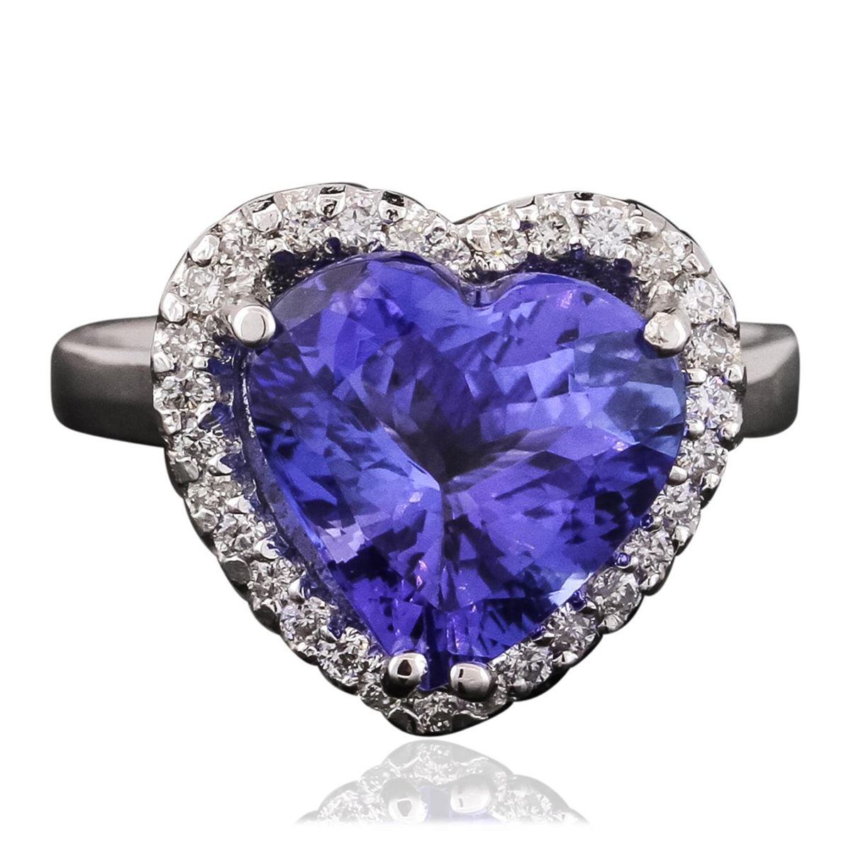 One electronically tested 14KT white gold ladies combination cast & assembled ring with a bright polish finish. Identified with markings of "K14". Condition is new. Containing: One prong set heart modified brilliant cut natural tanzanite, measuring 11.23 x 11.00 x 7.55mm, approximate weight of 6.09ct., clarity is eye clean, type I, medium, moderately strong, bluish violet color, (GIA bV 5/4), cut is good. Thirty-One prong set round brilliant cut diamonds, measuring 1.30 - 1.30 x 0.78mm (depth est.) approximate total weight of 31 Stones = 0.31ct. Clarity: I-1 to I-2. Color: I - J, Cut is Good. Colored gemstones are presumed to have been subjected to commonly used enhancement processes. All diamonds and colored gemstones are graded in the mounting, unless otherwise stated. Total Weight of Colored Stones 6.09ct. Total Weight of Diamonds 0.31ct. Total Weight of Ring 5.00 grams. GGL Appraised at $10,430.00.