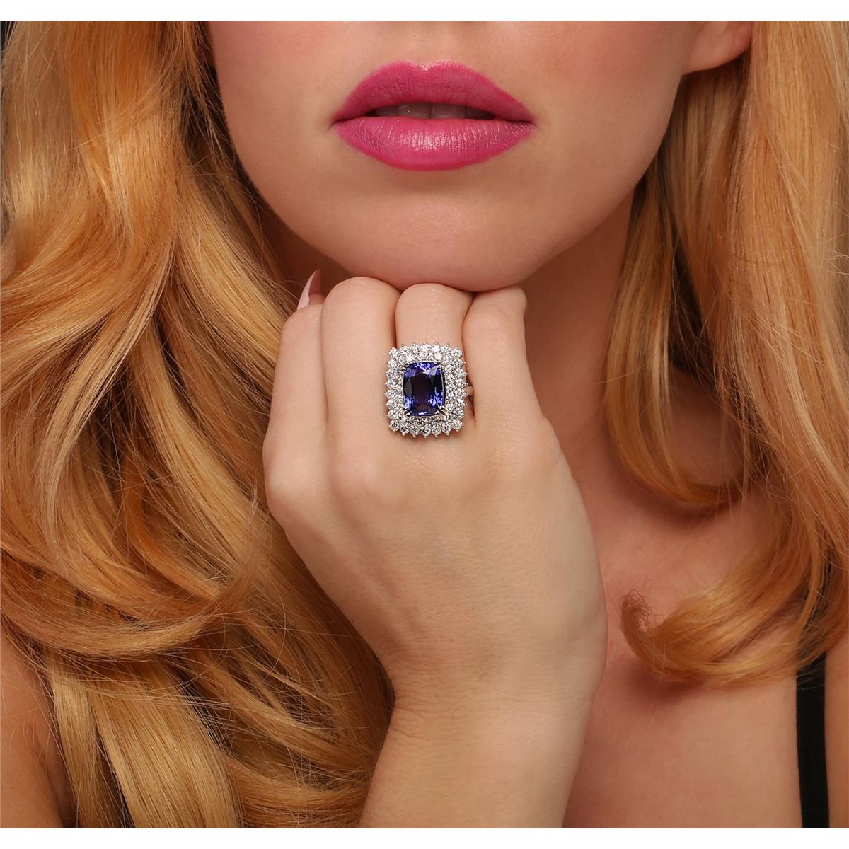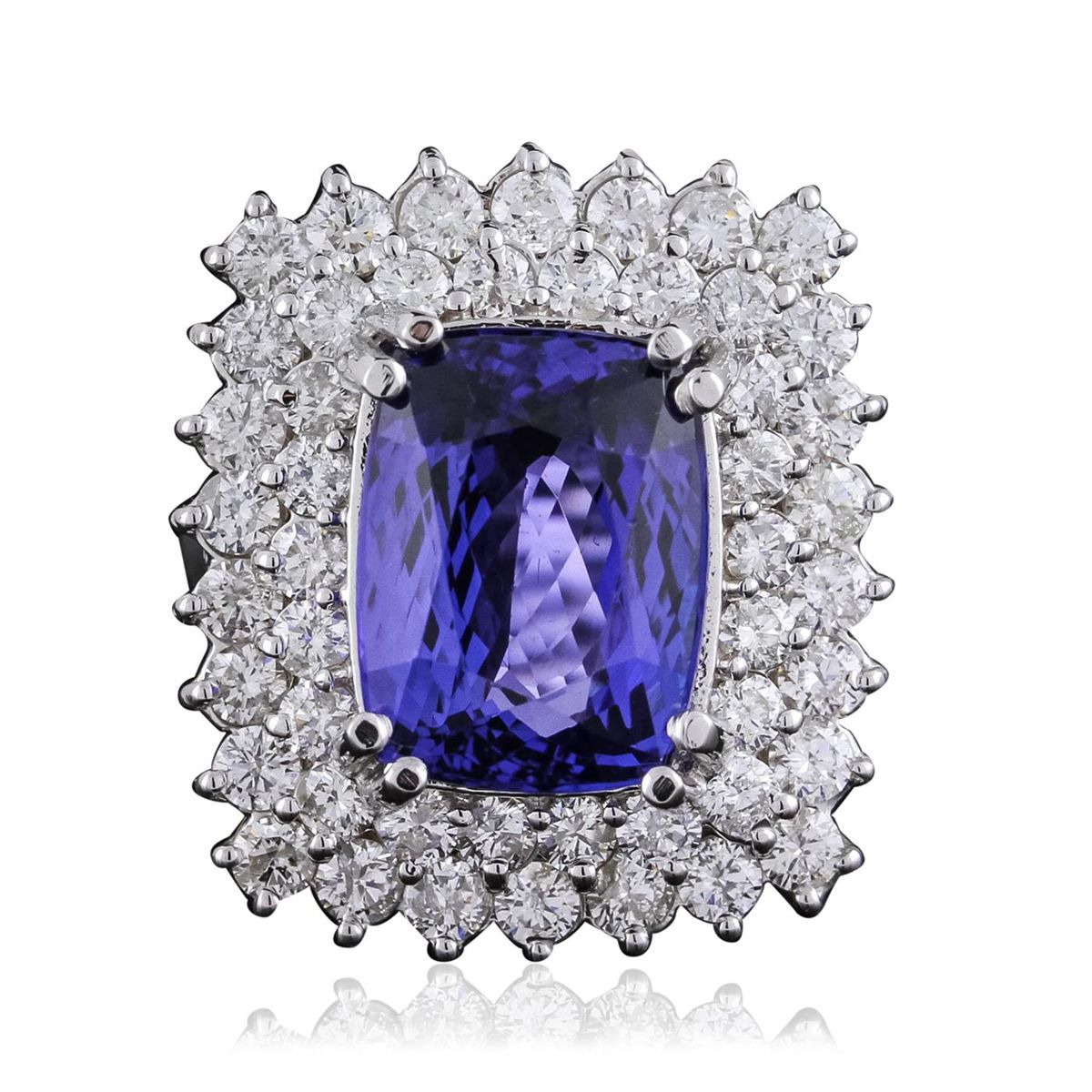 One electronically tested 14KT white gold ladies combination cast & assembled ring with a bright polish finish. Identified with markings of "K14". Condition is new. Containing: One prong set rectangular cushion modified brilliant cut natural tanzanite, measuring 12.28 x 9.70 x 6.50mm, approximate weight of 6.10ct., clarity is eye clean, type I, medium, moderately strong, violetish blue color, (GIA vB 5/4), cut is good. Forty-Eight prong set round brilliant cut diamonds, measuring 2.10 - 2.00 x 1.23mm (depth est.) approximate total weight of 48 Stones = 1.51ct. Clarity: SI-2 to I-1. Color: J - K, Cut is Good. Colored gemstones are presumed to have been subjected to commonly used enhancement processes. All diamonds and colored gemstones are graded in the mounting, unless otherwise stated. Total Weight of Colored Stones 6.10ct. Total Weight of Diamonds 1.51ct. Total Weight of Ring 10.40 grams. GGL Appraised at $14,750.00.