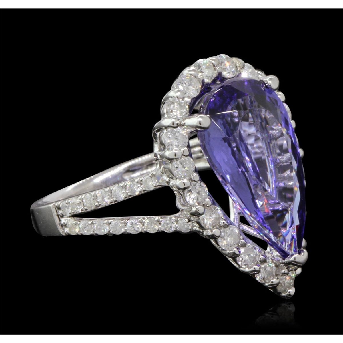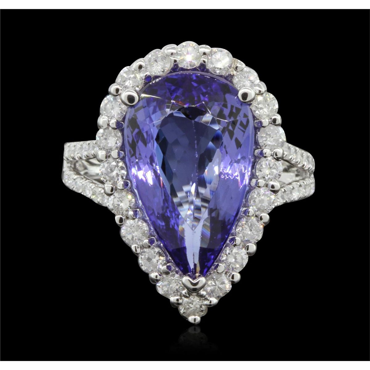 One electronically tested 14KT white gold Ladies combination cast & assembled ring with a bright polish finish. Condition is new. Identified with markings of "14K". Containing: One prong set pear modified brilliant cut natural tanzanite, measuring 16.00 x 10.00 x 5.70mm, approximate weight of 6.11ct., clarity is eye clean, type I, medium light, moderately strong, bluish violet color, (GIA bV 4/4), cut is good. Colored gemstones are presumed to have been subjected to commonly used and possible undetectable color/clarity enhancement processes. Twenty prong set round brilliant cut diamonds, measuring 2.00 - 2.00 x 1.20mm (depth est.) approximate total weight of 20 Stones = 0.58ct. Clarity of SI-1 to I-1, Color of H - I, Cut is Very Good. Thirty-Two bead set round brilliant cut diamonds, measuring 1.20 - 1.20 x 0.72mm (depth est.) approximate total weight of 32 Stones = 0.20ct. Clarity of I-1, Color of G - H, Cut is Good. Total Weight of Colored Stones 6.11 ct. Total Weight of Diamonds 0.79ct. Total Weight of Ring 5.90gm. GGL Appraised at $15,900.00.
