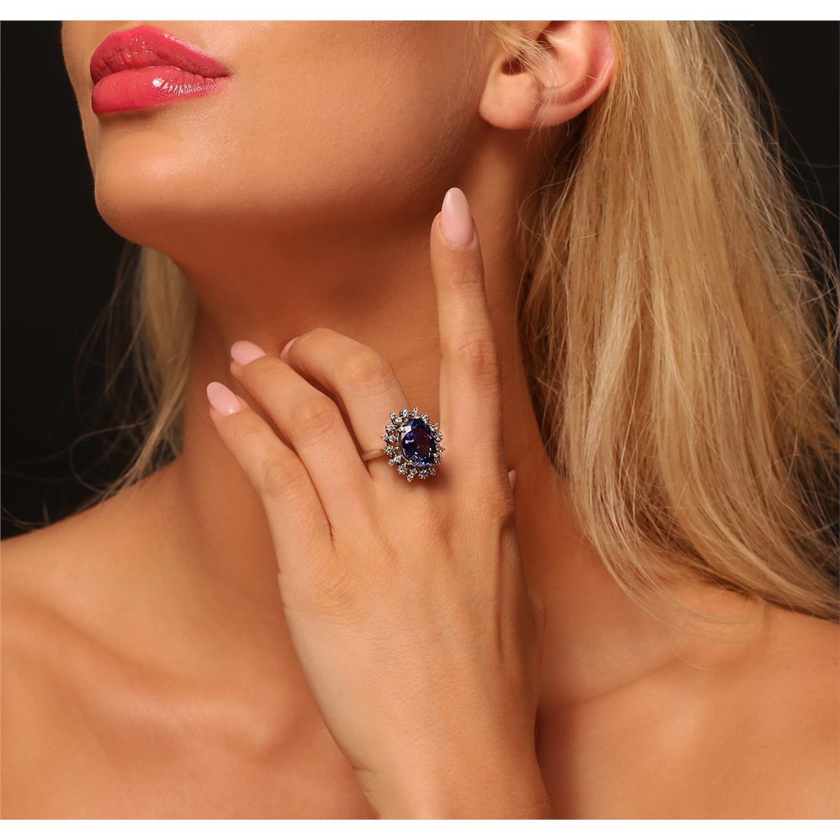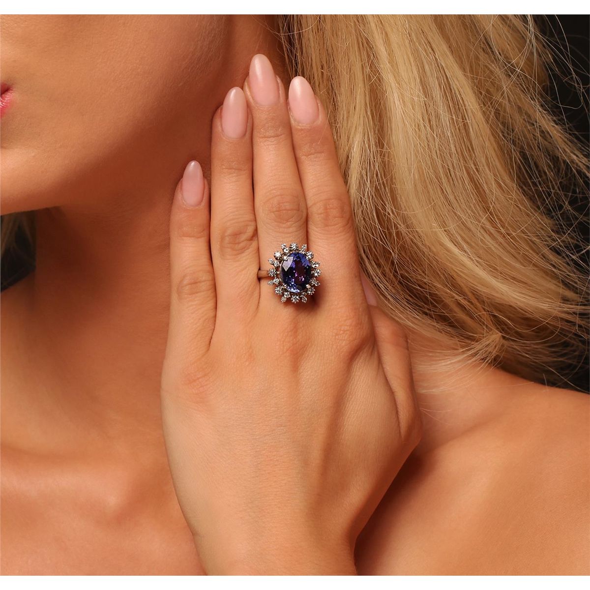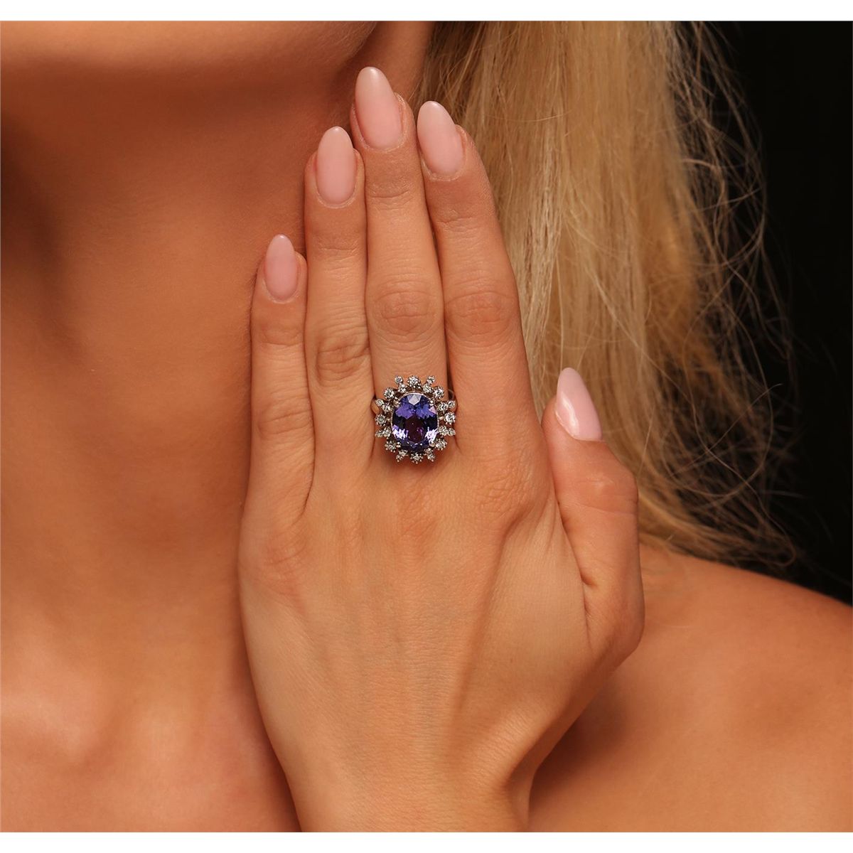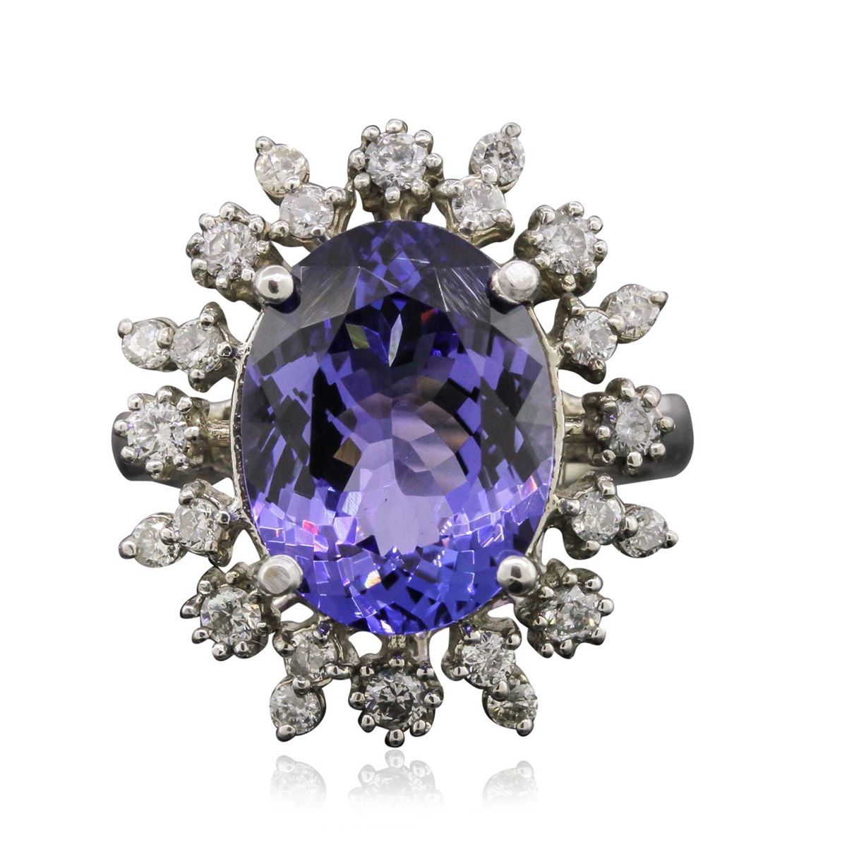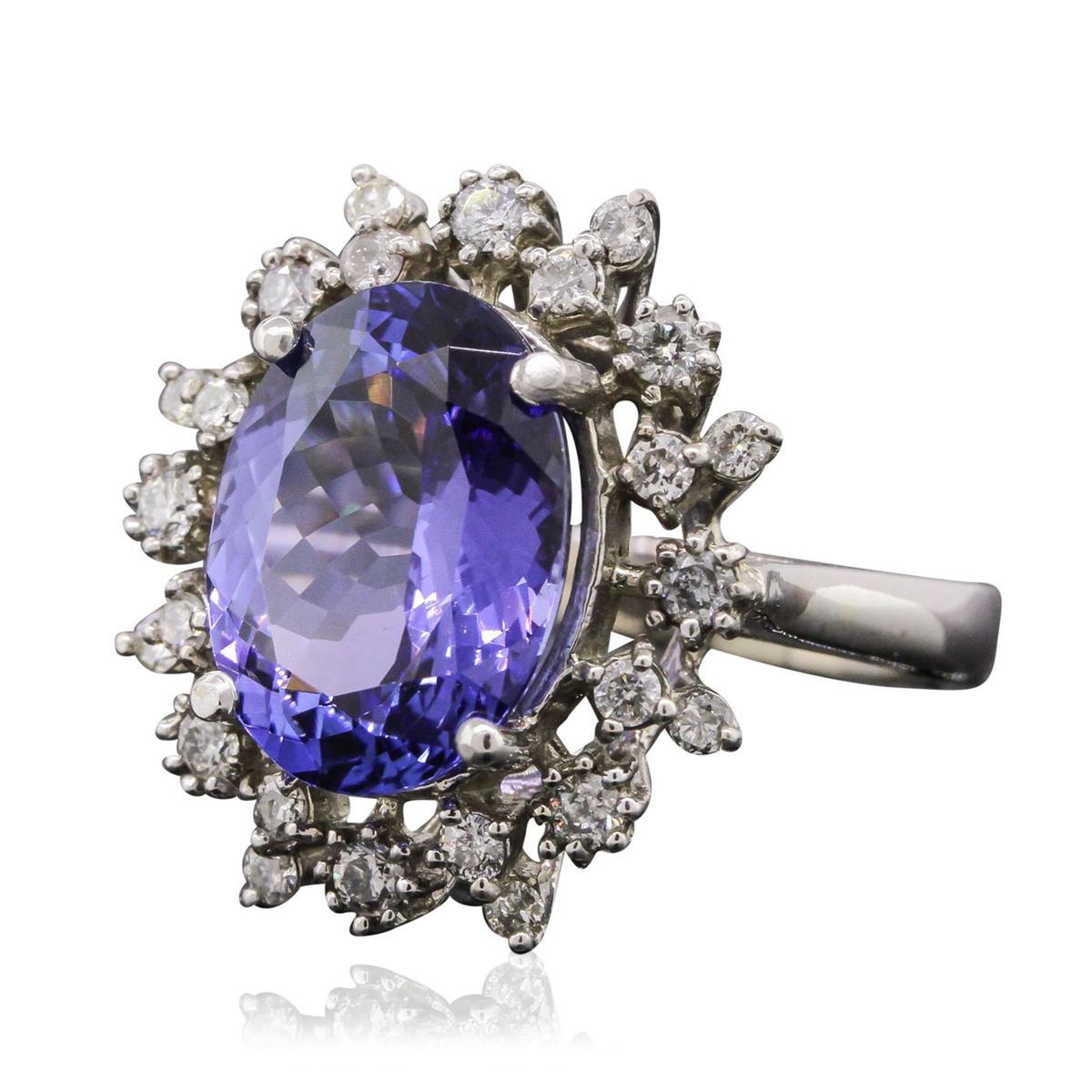 One electronically tested 14KT white gold ladies cast tanzanite and diamond ring with a bright polish finish. Condition is new, good workmanship. The featured tanzanite is set within a floret diamond bezel supported by tapering shoulders, completed by a three millimeter wide band. Identified with markings of "K14". Containing: One prong set oval mixed cut natural tanzanite, measuring 13.40 x 10.10 x 6.00mm, 10%. bulge factor, approximate weight of 6.11ct., clarity is eye clean, type I, medium dark, very slightly grayish, bluish violet color, (GIA bV 6/3), cut is good. Transmitting light with no distortion, transparent. Colored Stone Grading Report attached. Graded in the setting. Tanzanite is a very rare gemstone that is only found in the country of Tanzania. Originally discovered in 1967. Tiffany & Company, named the stone Tanzanite. It is found in the Usumburu Mountains that border the Umba Valley of northern Tanzania. Tanzanite occurs in gray, brown, violet, blue, reddish-purple, & green. The gem is interesting because of its exceptional pleochroism. Rotated in different directions a tanzanite will exhibit multiple changes of color. Tanzanite has a low tolerance to ultrasonic cleaning, and should not be cleaned using this method. Eight prong set round brilliant cut diamonds, measuring 2.10 - 2.00 x 1.23mm (depth est.) approximate. Total Weight of 8 Stones = 0.35ct. Graded in the setting. Clarity: SI-2 to I-2. Color: H - I Sixteen prong set round brilliant cut diamonds, measuring 1.80 - 1.70 x 1.05mm (depth est.) approximate. Total Weight of 16 Stones = 0.41ct. Graded in the setting. Clarity: SI-2 to I-2. Color: H - J. Total Weight of Colored Stones 6.11ct. Total Weight of Diamonds 0.76ct. Total Weight of Ring 7.07gm. AIG Appraised at $18,410.00.