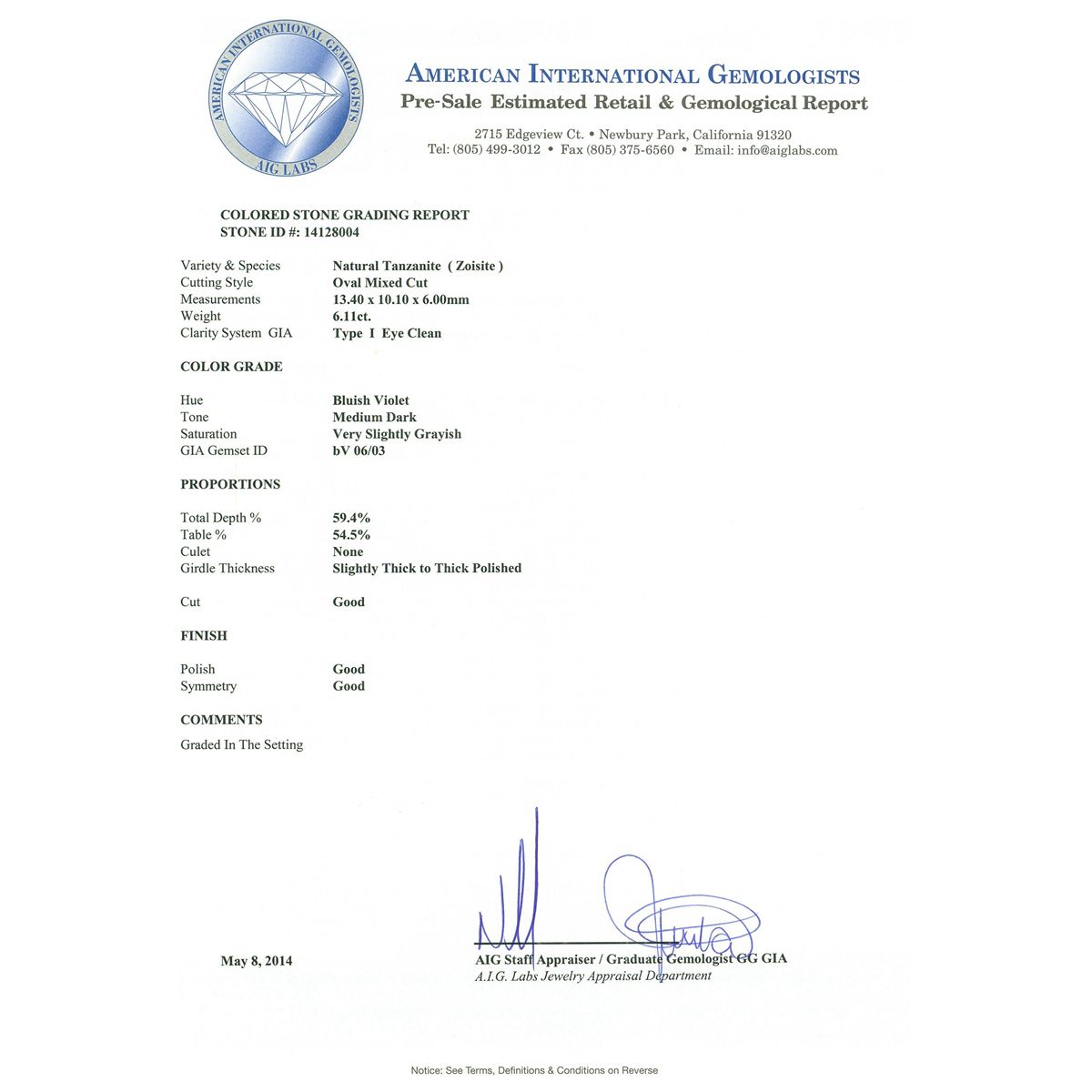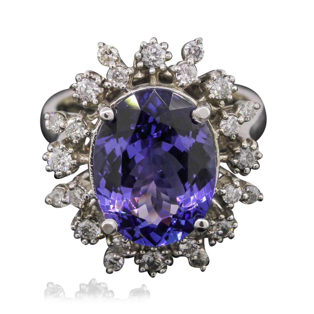 One electronically tested 14KT white gold ladies cast tanzanite and diamond ring with a bright polish finish. Condition is new, good workmanship. The featured tanzanite is set within a floret diamond bezel supported by tapering shoulders, completed by a three millimeter wide band. Identified with markings of "K14". Containing: One prong set oval mixed cut natural tanzanite, measuring 13.40 x 10.10 x 6.00mm, 10%. bulge factor, approximate weight of 6.11ct., clarity is eye clean, type I, medium dark, very slightly grayish, bluish violet color, (GIA bV 6/3), cut is good. Transmitting light with no distortion, transparent. Colored Stone Grading Report attached. Graded in the setting. Tanzanite is a very rare gemstone that is only found in the country of Tanzania. Originally discovered in 1967. Tiffany & Company, named the stone Tanzanite. It is found in the Usumburu Mountains that border the Umba Valley of northern Tanzania. Tanzanite occurs in gray, brown, violet, blue, reddish-purple, & green. The gem is interesting because of its exceptional pleochroism. Rotated in different directions a tanzanite will exhibit multiple changes of color. Tanzanite has a low tolerance to ultrasonic cleaning, and should not be cleaned using this method. Eight prong set round brilliant cut diamonds, measuring 2.10 - 2.00 x 1.23mm (depth est.) approximate. Total Weight of 8 Stones = 0.35ct. Graded in the setting. Clarity: SI-2 to I-2. Color: H - I Sixteen prong set round brilliant cut diamonds, measuring 1.80 - 1.70 x 1.05mm (depth est.) approximate. Total Weight of 16 Stones = 0.41ct. Graded in the setting. Clarity: SI-2 to I-2. Color: H - J. Total Weight of Colored Stones 6.11ct. Total Weight of Diamonds 0.76ct. Total Weight of Ring 7.07gm. AIG Appraised at $18,410.00.