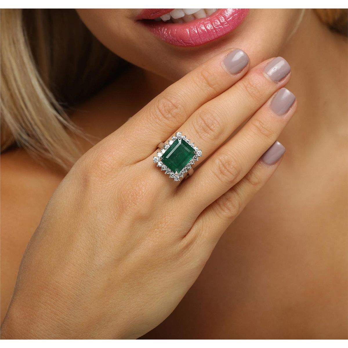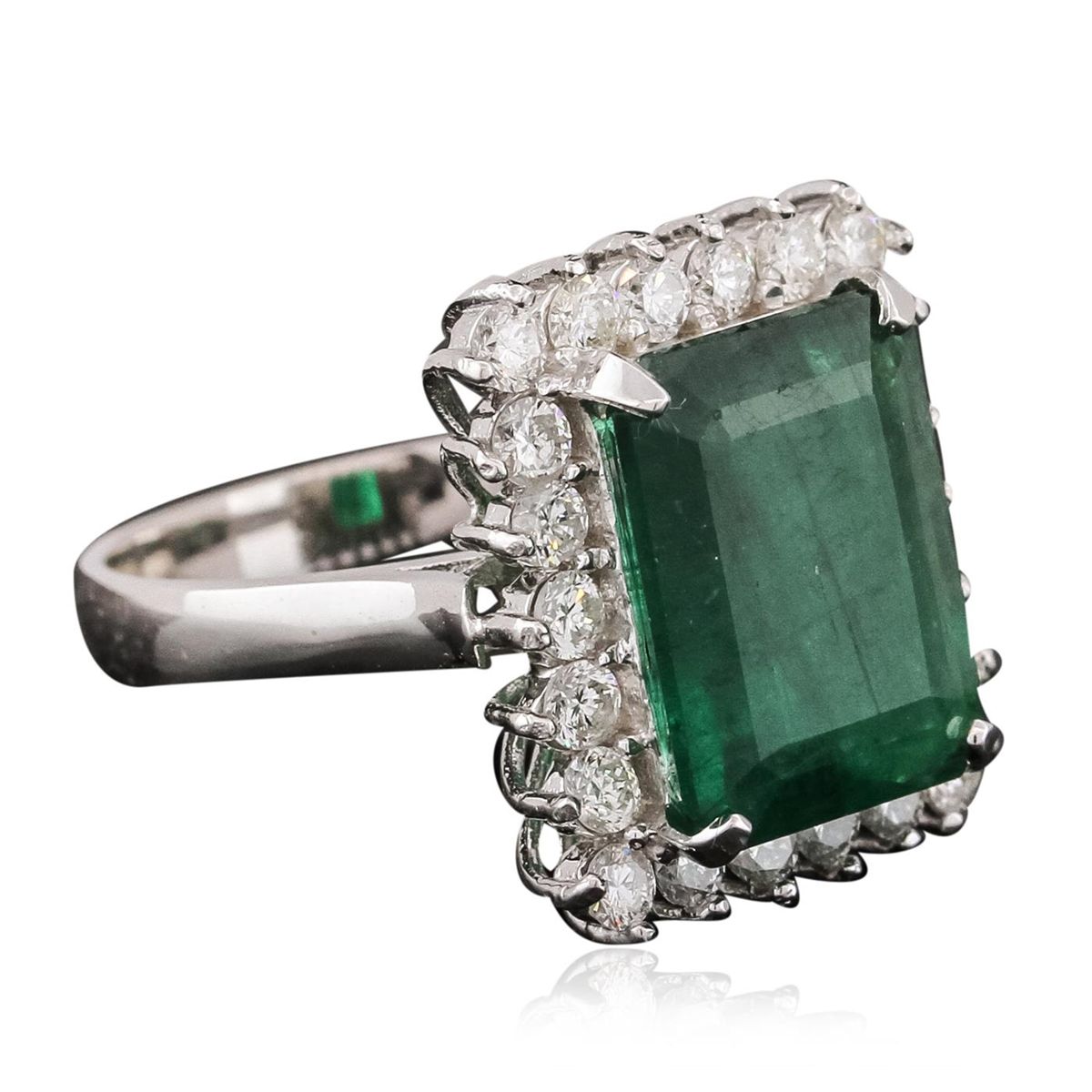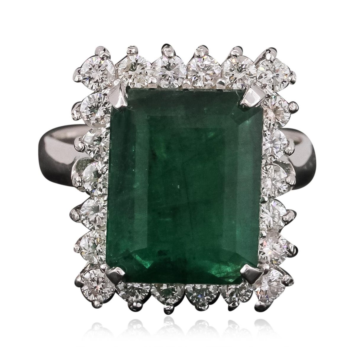One electronically tested 14KT white gold ladies combination cast & assembled ring with a bright polish finish. Identified with markings of "K14". Condition is new. Containing: One prong set emerald standard step cut natural emerald, measuring 13.28 x 10.45 x 6.00mm, approximate weight of 6.12ct., clarity is heavily included, type III, medium dark, moderately strong, green color, (GIA G 6/4), cut is good. Twenty-Four prong set round brilliant cut diamonds, measuring 1.80 - 1.70 x 1.05mm (depth est.) approximate total weight of 24 Stones = 0.47ct. Clarity: I-1 to I-2. Color: I - J, Cut is Good. Colored gemstones are presumed to have been subjected to commonly used enhancement processes. All diamonds and colored gemstones are graded in the mounting, unless otherwise stated. Total Weight of Colored Stones 6.12ct. Total Weight of Diamonds 0.47ct. Total Weight of Ring 6.90 grams. GGL Appraised at $13,030.00.