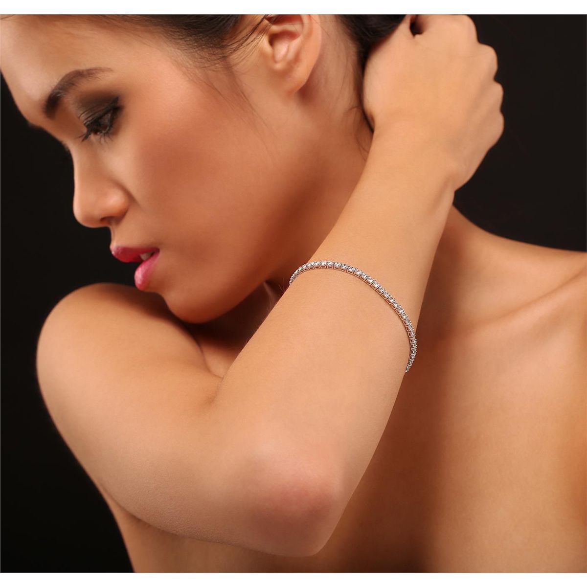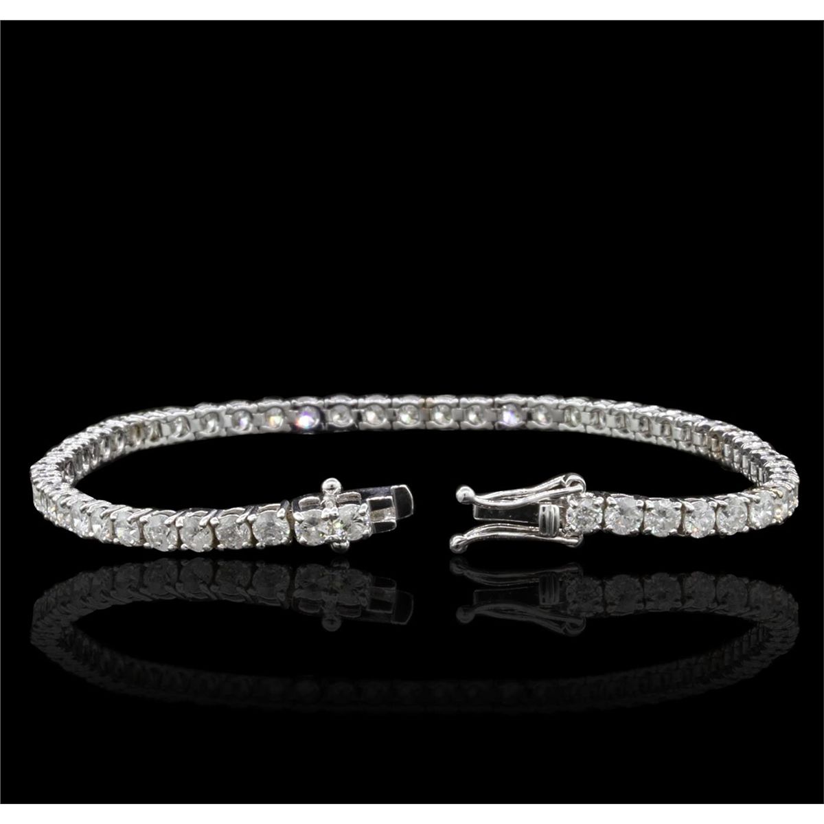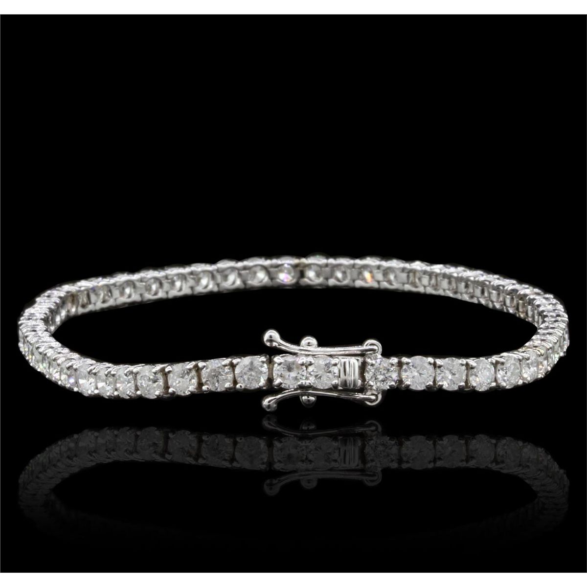One electronically tested 14KT white gold ladies cast & assembled diamond tennis bracelet with a bright polish finish. Seven and one-half inch length bracelet composed of a flexible ribbon of diamonds, terminating in a concealed clasp with twin safeties. Identified with markings of "14KT". Condition is new, good workmanship. Tennis bracelets & necklaces got their unusual name from an incident involving the U.S. professional tennis player Chris Evert during a tennis match in the 1980's. Evert had been wearing an expensive diamond bracelet, an inline string of individually-set diamonds. Previously these bracelets were known as eternity bracelets. When the clasp snapped during play, she asked the officials to stop the tennis match until the bracelet could be found. Since that day, bracelets and necklaces featuring an inline string of diamonds have been called tennis bracelets and tennis necklaces. Containing: Fifty-Eight prong set round brilliant cut diamonds, measuring 3.10 - 3.00 x 1.83mm (depth est.) approximate. Total Weight of 58 Stones = 6.12ct. Graded in the setting. Clarity: I-1 to I-2. Color: H - J. Total Weight of Diamonds 6.12ct. Total Weight of Tennis Bracelet 8.36 grams. AIG Appraised at $14,350.00.
