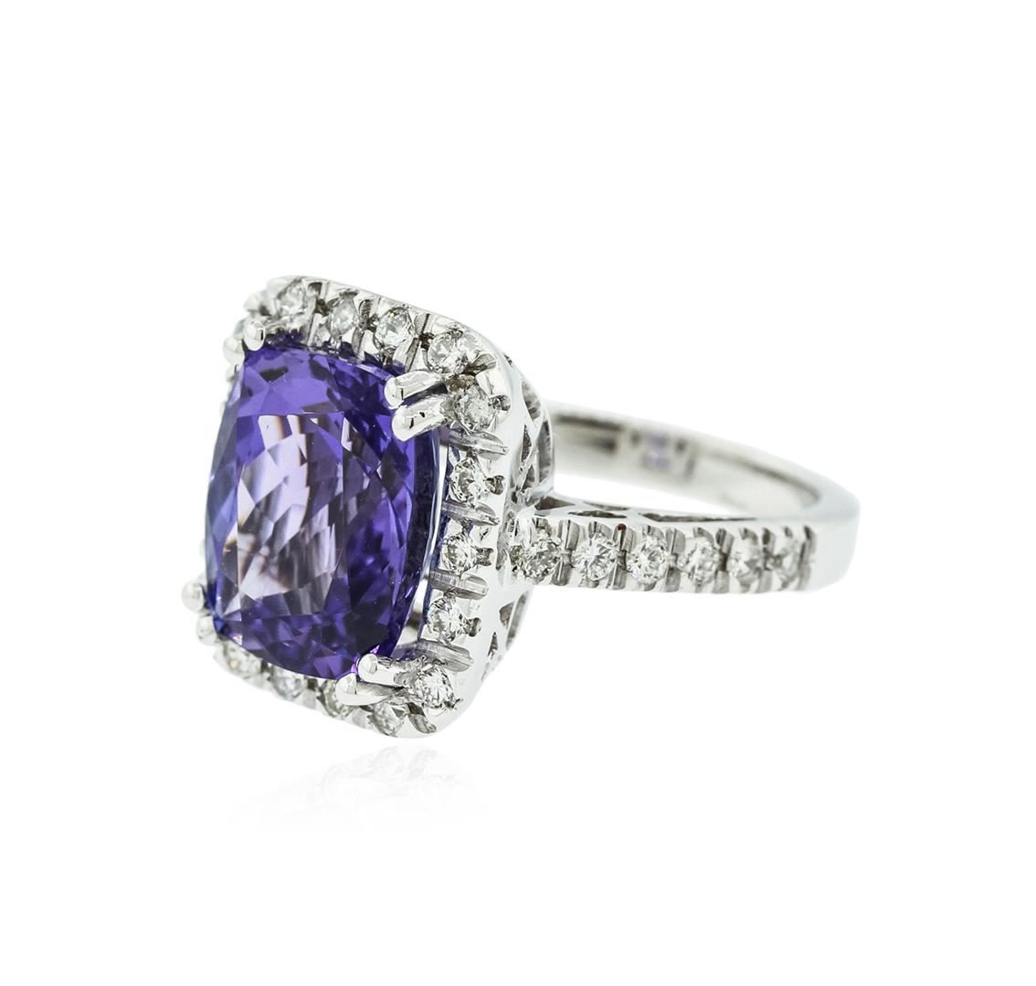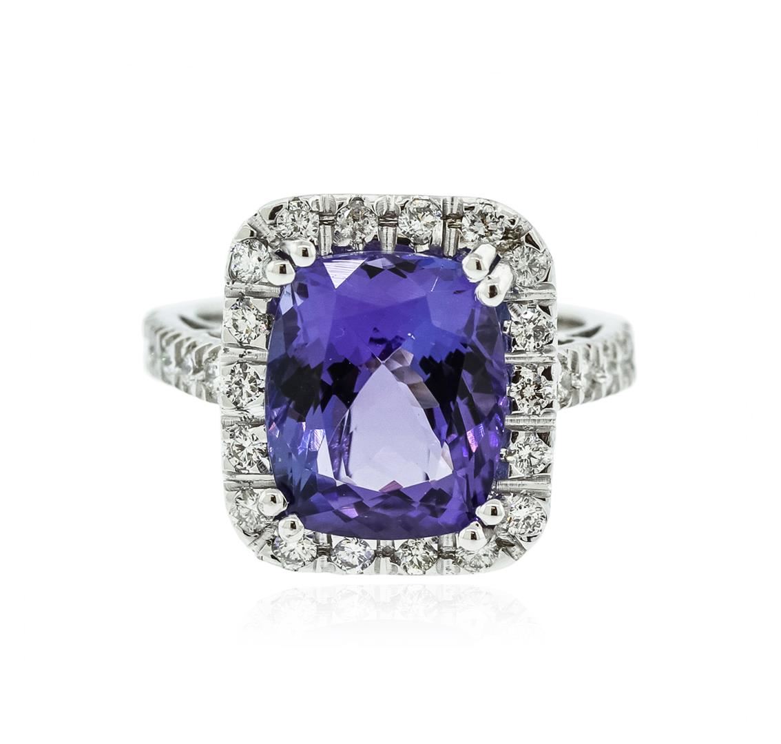 One electronically tested 14KT white gold ladies cast tanzanite and diamond ring with a bright polish finish. Identified with markings of "14K". Condition is new. Containing: One prong set rectangular cushion modified brilliant cut natural tanzanite, measuring 12.00 x 10.00 x 6.50mm, approximate weight of 6.14ct., clarity is eye clean, type I, medium, moderately strong, bluish violet color, (GIA bV 5/4), cut is good. Thirty prong set round brilliant cut diamonds, measuring 1.60 - 1.60 x 0.96mm (depth est.) approximate total weight of 30 Stones = 0.45ct. . Clarity: SI-1 to SI-2. Color: I - J, Cut is Good. Colored gemstones are presumed to have been subjected to commonly used enhancement processes. All diamonds and colored gemstones are graded in the mounting, unless otherwise stated.. Total Weight of Colored Stones 6.14ct.. Total Weight of Diamonds 0.45ct.. Total Weight of Ring 8.90 grams. GGL Appraised at $6,995.00.