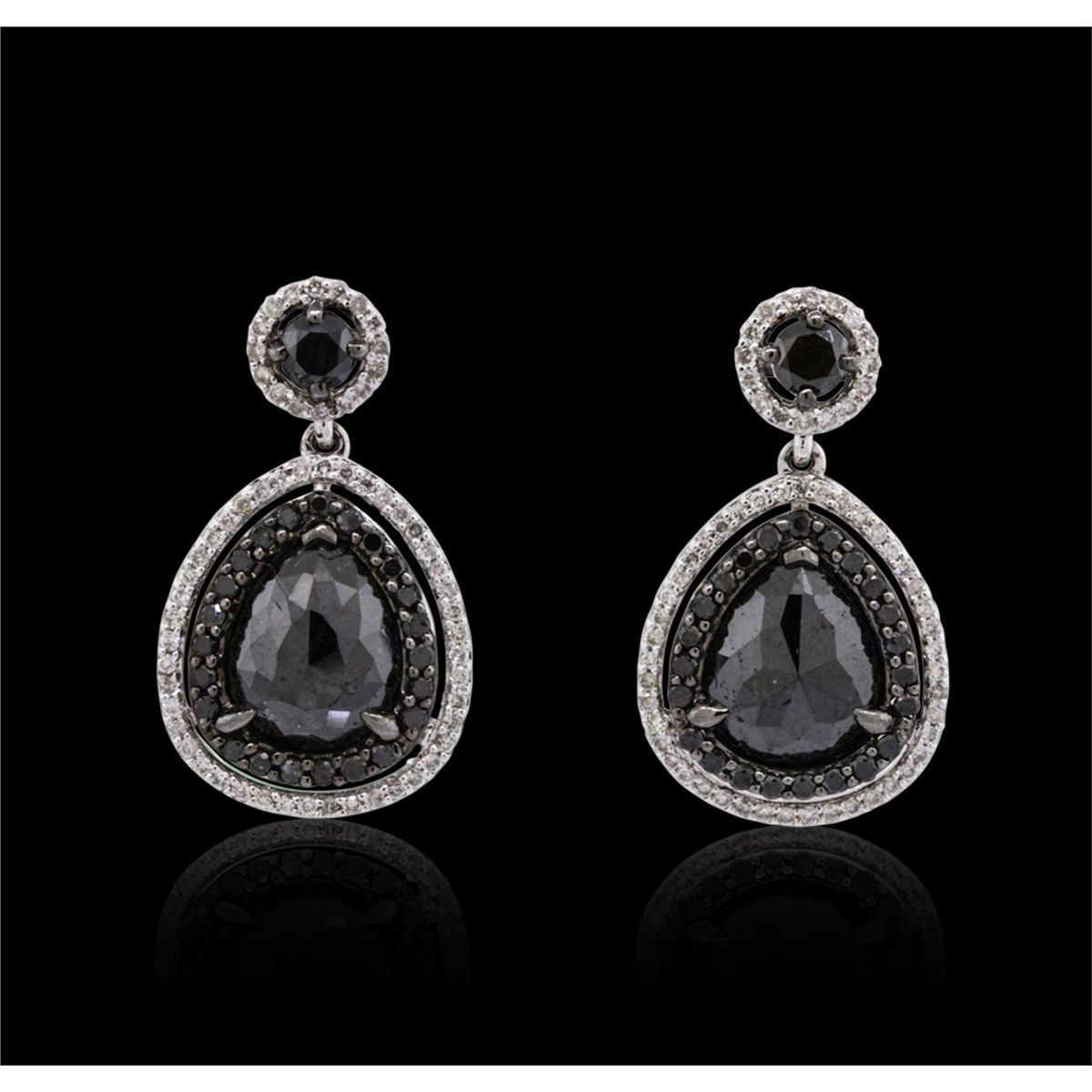 One pair of 14KT white gold earrings containing natural pear rose cut fancy black diamonds, enhanced for color, with a total weight of 5.13ct. The earrings also contain black side stones: fancy black (color enhanced), and white side stone: G-H / SI3-I1 weighing 0.49ct and 0.53ct respectively. Total weight of the earrings is 5.00 grams. EGL Appraised at $5,250.00.