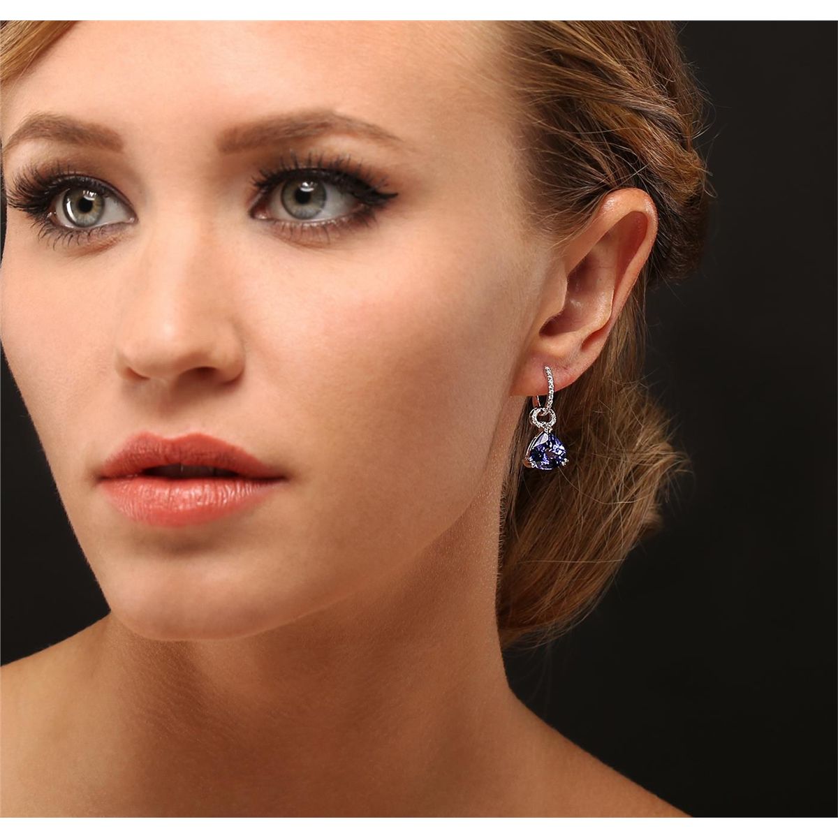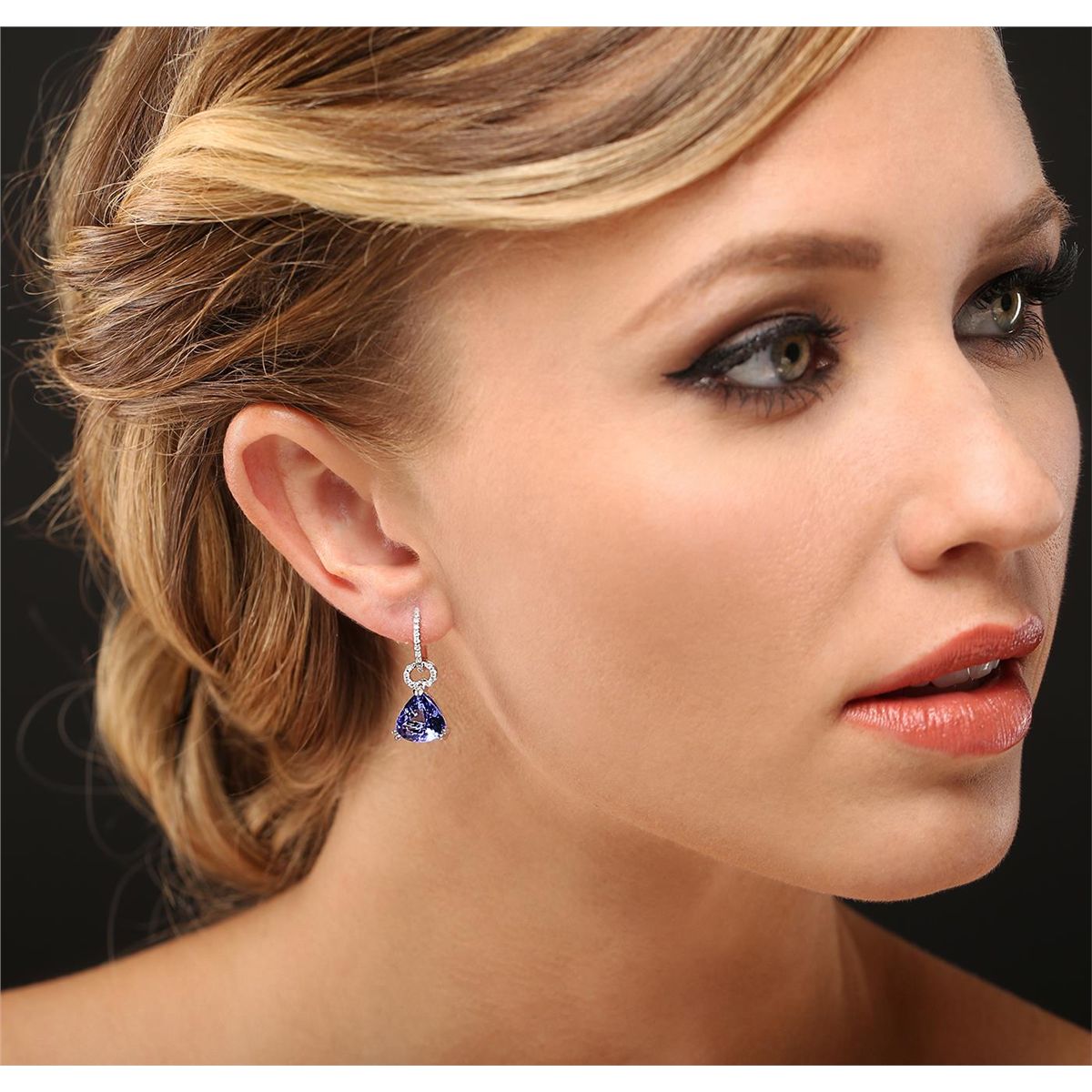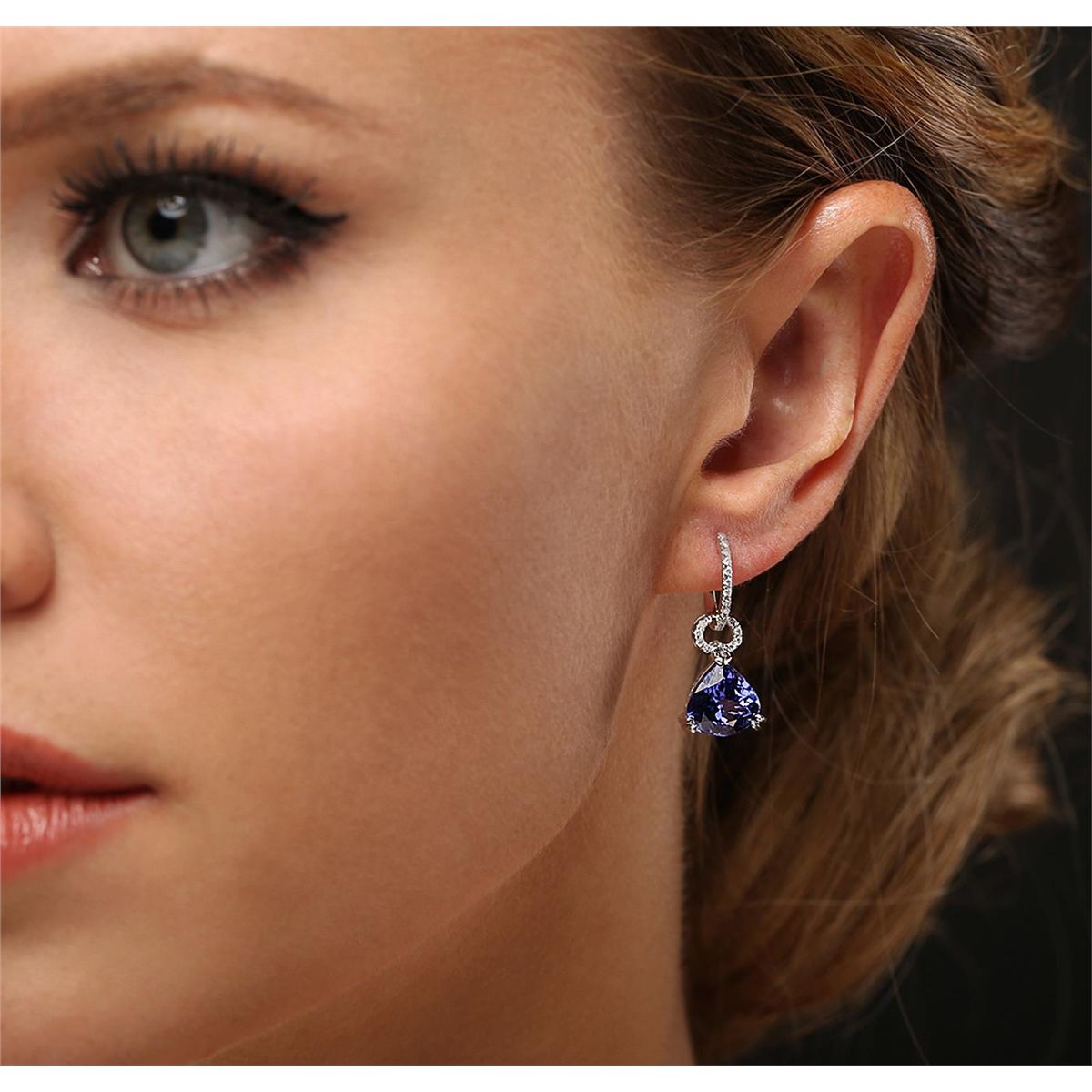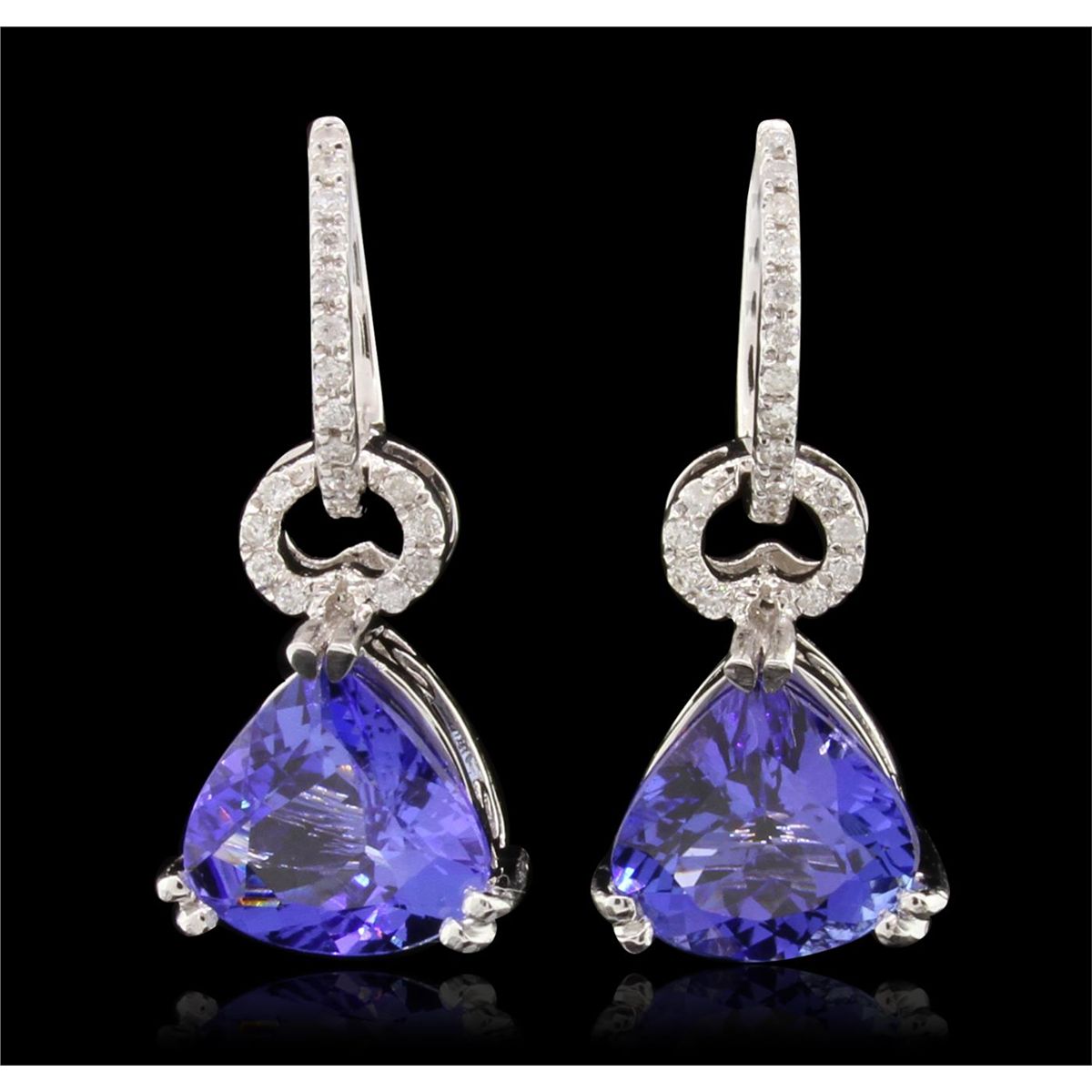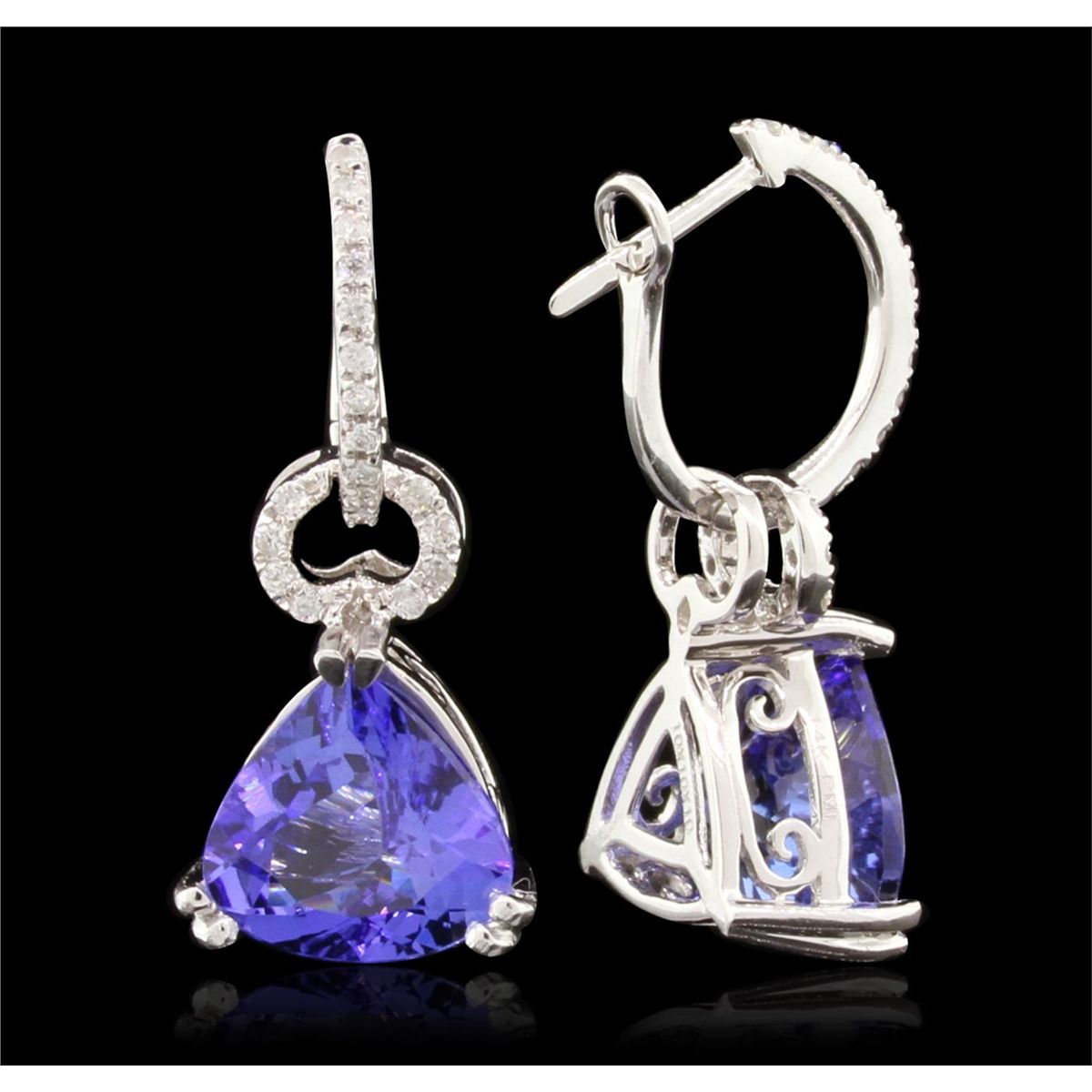 One pair electronically tested 14KT white gold Ladies combination cast & assembled dangle earrings with lever backs with a bright polish finish. Identified with markings of "14K". Condition is excellent. Containing: Two prong set pear modified brilliant cut natural tanzanites, measuring 10.00 x 10.00 x 4.70mm, approximate total weight of 6.16ct., clarity is eye clean, type I, medium light, moderately strong, violetish blue color, (GIA vB 4/4), cut is good. Colored gemstones are presumed to have been subjected to commonly used and possible undetectable color/clarity enhancement processes. Forty prong set round brilliant cut diamonds, measuring 1.10 - 1.10 x 0.66mm (depth est.) approximate total weight of 40 Stones = 0.22ct. Clarity of I-1 to I-3, Color of H - I, Cut is Fair. Total Weight of Colored Stones 6.16ct. Total Weight of Diamonds 0.22ct. Total Weight of Earrings 5.60gm. GGL Appraised at $11,555.00.