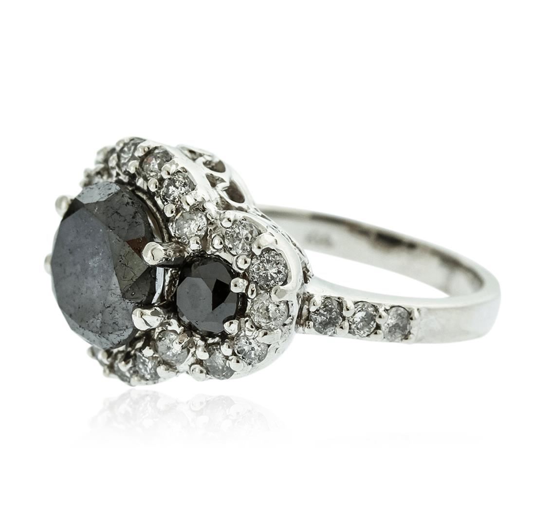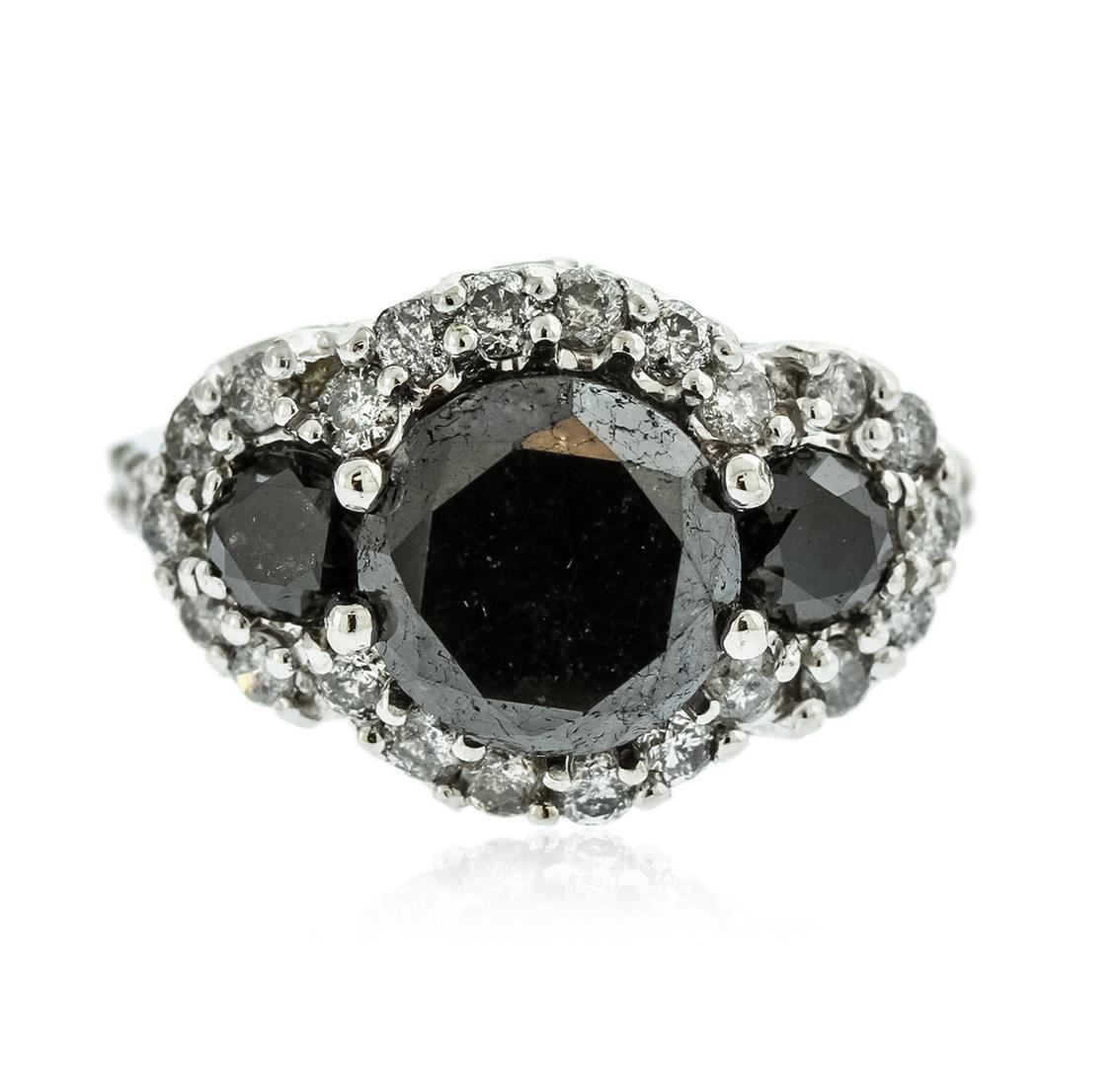 One electronically tested 14KT white gold ladies cast black and white diamond ring with a bright polish finish. The featured black diamonds trio supported by white diamond set shoulders and completed by a two and one-half millimeter wide band. Identified with markings of "K14". Condition is new, good workmanship. Containing: One prong set round brilliant cut diamond, measuring 10.20 - 10.20 x 5.65mm (depth est.) approximate weight of 3.98ct. Indications of multiple laboratory enhancements. Graded in the setting. Clarity Déclassé‚. Color: Fancy Black; Irradiated. Two prong set round brilliant cut diamonds, measuring 4.50 - 4.40 x 2.89mm (depth est.) approximate. Total Weight of 2 Stones = 0.79ct. Indications of multiple laboratory enhancements. Graded in the setting. Clarity Déclassé‚. Color: Fancy Black; Irradiated. Twenty-Eight prong set round brilliant cut diamonds, measuring 2.30 - 2.10 x 1.32mm (depth est.) approximate. Total Weight of 28 Stones = 1.40ct. Faint brown secondary color throughout. Graded in the setting. Clarity: I-1 to I-3. Color: I - K. Total Weight of Diamonds 6.17ct. Total Weight of Ring 7.50gm. AIG Appraised at $8,365.00.