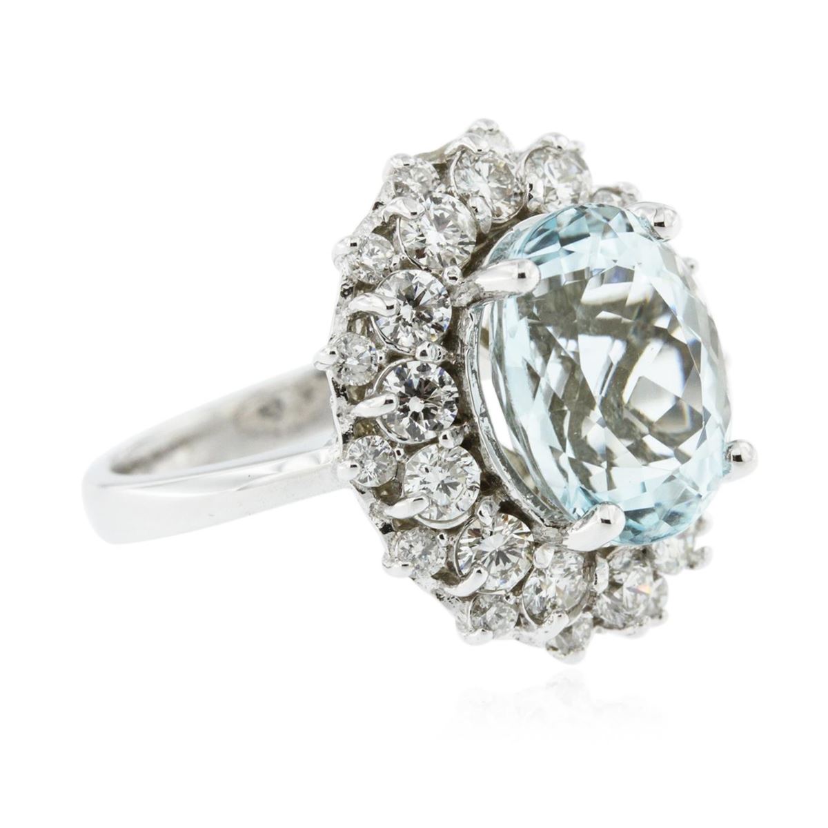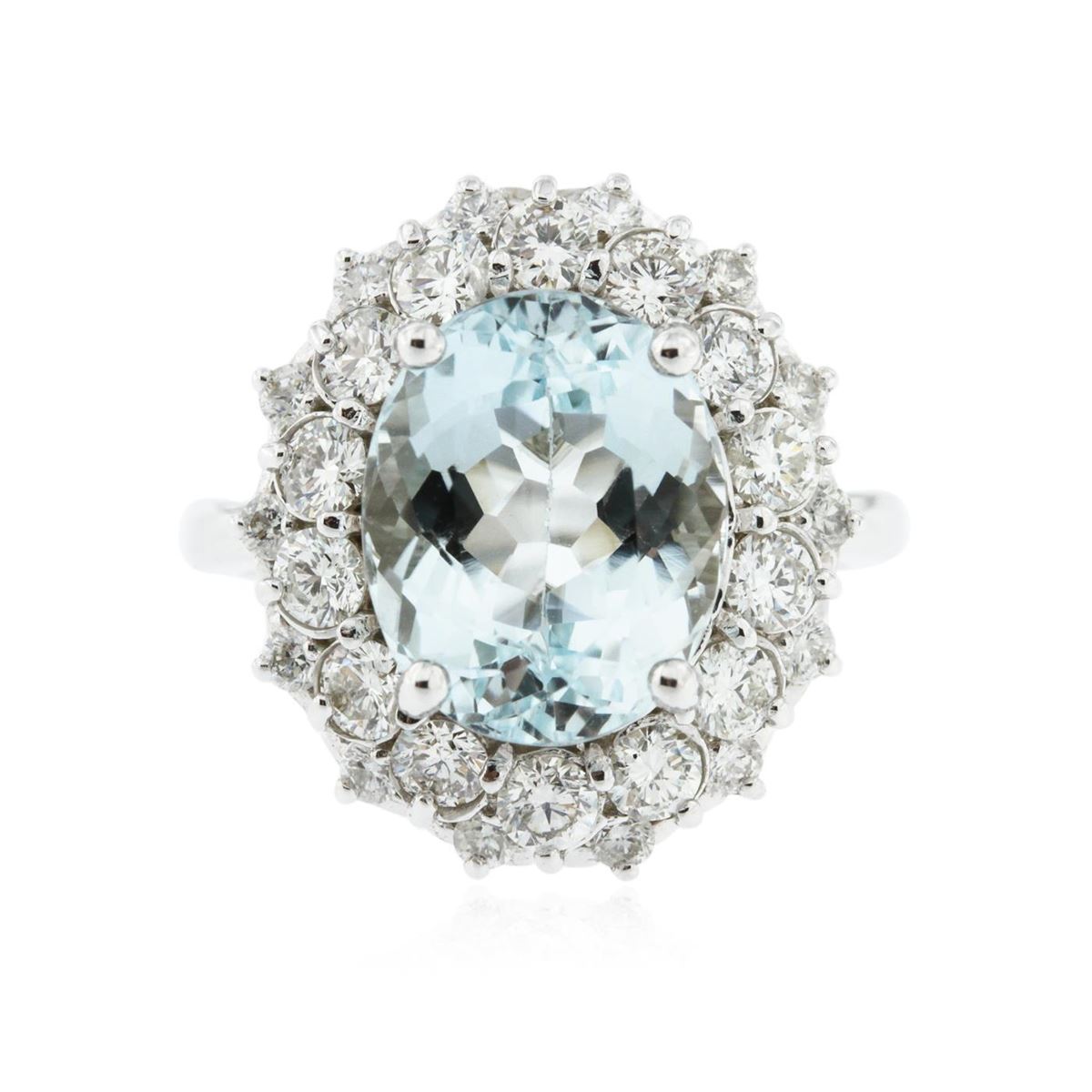 One electronically tested 14KT white gold ladies cast blue topaz and diamond ring with a bright polish finish. Condition is new, good workmanship. The featured blue topaz is set within a stylized tiered diamond bezel, completed by a two and one-half millimeter wide band. Identified with markings of "K14". Containing: One prong set oval mixed cut natural blue topaz, measuring 12.40 x 9.80 x 6.70mm, 6% bulge factor, approximate weight of 6.18ct, clarity is eye clean, type I, medium light, very slightly grayish, very slightly greenish blue color, (GIA vslgB 4/3), cut is good. Transmitting light with no distortion, transparent. Colored Stone Grading Report attached. Refractive index testing results of 1.61 to 1.62. This is a conclusive result for topaz. Graded in the setting. Fourteen prong set round brilliant cut diamonds, measuring 2.90 - 2.80 x 1.71mm (depth est.) approximate. Total Weight of 14 Stones = 1.28ct. Graded in the setting. Clarity: SI-1 to I-1. Color: G - I Fourteen prong set round brilliant cut diamonds, measuring 2.00 - 1.90 x 1.17mm (depth est.) approximate. Total Weight of 14 Stones = 0.47ct. Graded in the setting. Clarity: SI-1 to I-1. Color: G - I. Total Weight of Colored Stones 6.18ct. Total Weight of Diamonds 1.75ct. Total Weight of Ring 7.77 grams. AIG Appraised at $6,565.00.