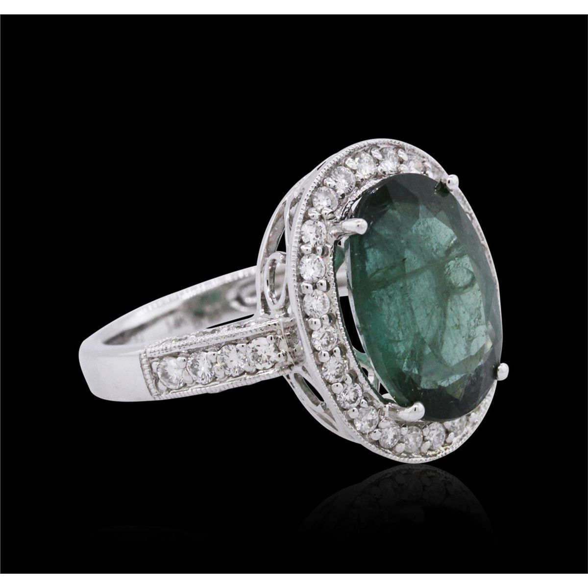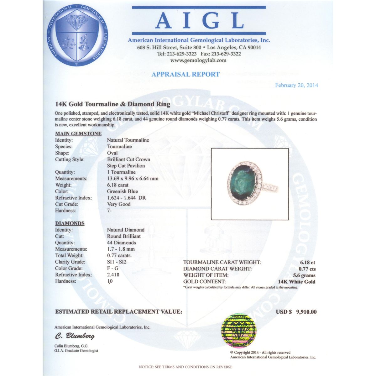 One polished, stamped, and electronically tested solid 14KT white gold Michael Christoff designer ring mounted with: 1 genuine tourmaline center stone weighing 6.18ct, and 44 genuine round diamonds weighing 0.77ct. This item weighs 5.60 grams, condition i