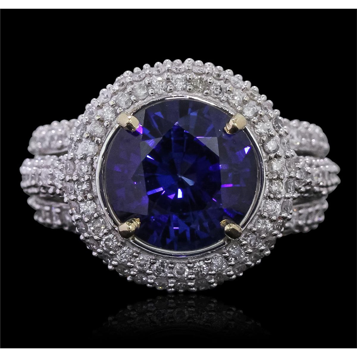 One electronically tested 14KT white gold ladies cast sapphire and diamond ring with a bright polish finish. The featured sapphire is set within an inner yellow gold basket and an outer tiered diamond bezel supported by diamond set three-way split shoulders, completed by a four millimeter wide band. Trademark is Orianne. Identified with markings of "14K". Condition is new, good workmanship. Containing: One prong set round mixed cut natural blue sapphire, measuring 10.99 - 10.94 x 6.79 mm, approximate weight of 6.19ct., clarity is eye clean, type II, medium dark, moderately strong, blue color, (GIA B 6/4), cut is good. Transmitting light with no distortion, transparent. Indications of laboratory high temperature diffusion treatment. EGL Report attached. Graded in the EGL Laboratory Report #US 64863405C.Two Hundred Eighteen prong set round brilliant cut diamonds, measuring 1.50 - 1.20 x 0.81mm (depth est.) approximate. Total Weight of 218 Stones = 2.10ct. Graded in the EGL Laboratory Report #US 64863405C. Clarity: SI-3 to I-1 . Color: F - G. Total Weight of Colored Stones 6.19ct. Total Weight of Diamonds 2.10ct. Total Weight of Ring 11.00.gm. AIG Appraised at $10,825.00.