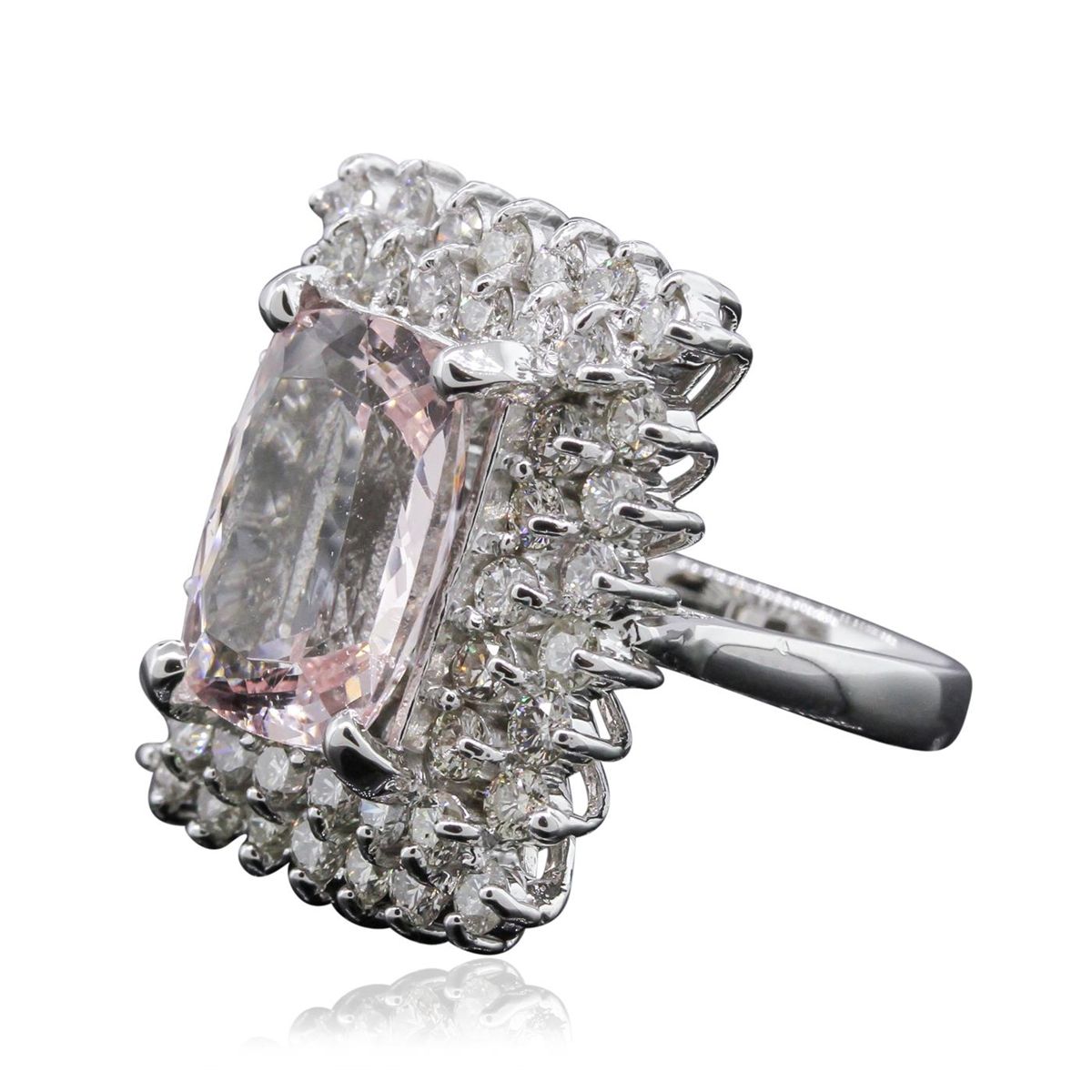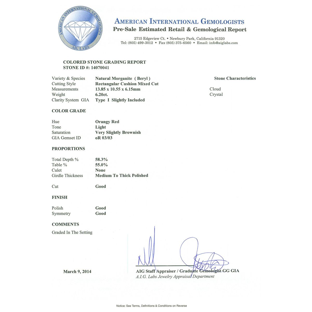 One electronically tested 14KT white gold ladies cast morganite and diamond ring with a bright polish finish. Condition is new, good workmanship. The featured morganite is set within two tiered diamond bezels supported by tapering shoulders, completed by a two and one-half millimeter wide band. Identified with markings of "K14". Containing: One prong set rectangular cushion mixed cut natural morganite, measuring 13.85 x 10.55 x 6.15mm, 8%. bulge factor, approximate weight of 6.20ct., clarity is slightly included, type I, light, very slightly brownish, orangy red color, (GIA oR 3/3), cut is good. Transmitting light with a minimum of distortion, transparent. Naturally occurring internal & external characteristics are present. Graded in the setting. Forty-Eight prong set round brilliant cut diamonds, measuring 2.20 - 2.10 x 1.29mm (depth est.) approximate. Total Weight of 48 Stones = 1.84ct. Graded in the setting. Clarity: SI-1 to I-1. Color: H - J. Total Weight of Colored Stones 6.20ct. Total Weight of Diamonds 1.84ct. Total Weight of Ring 11.00 grams. AIG Appraised at $11,320.00.