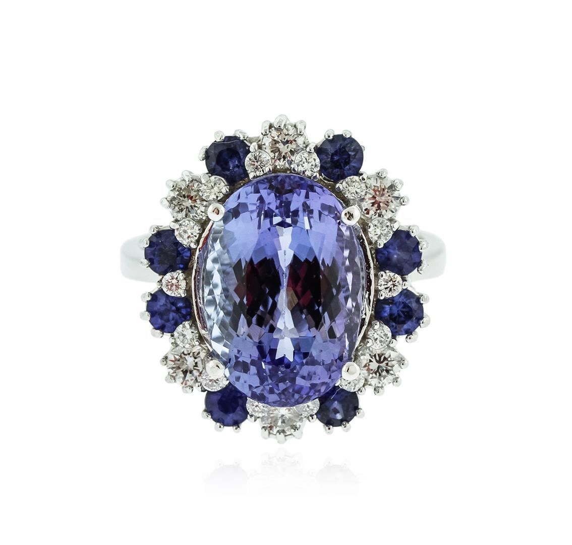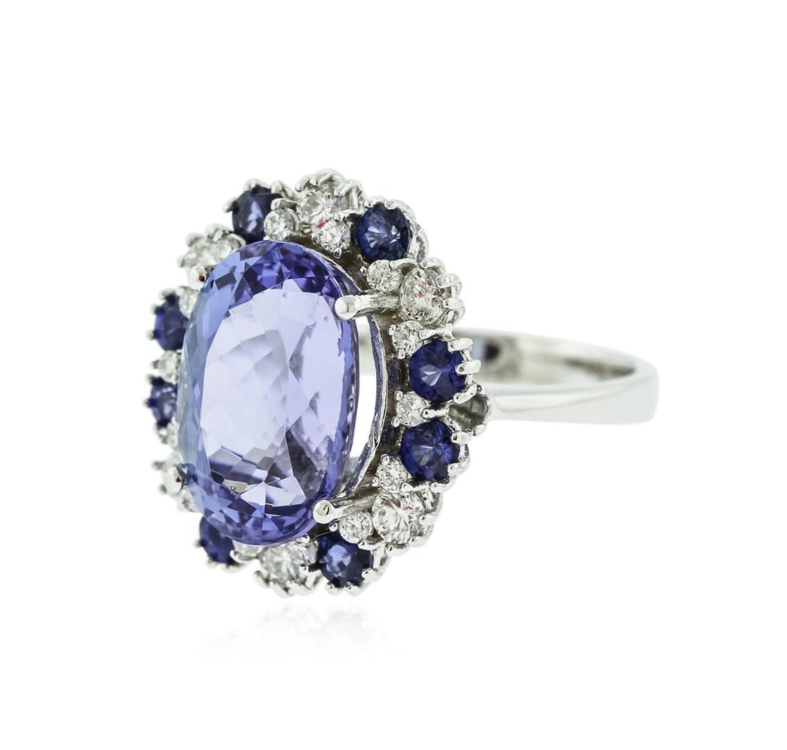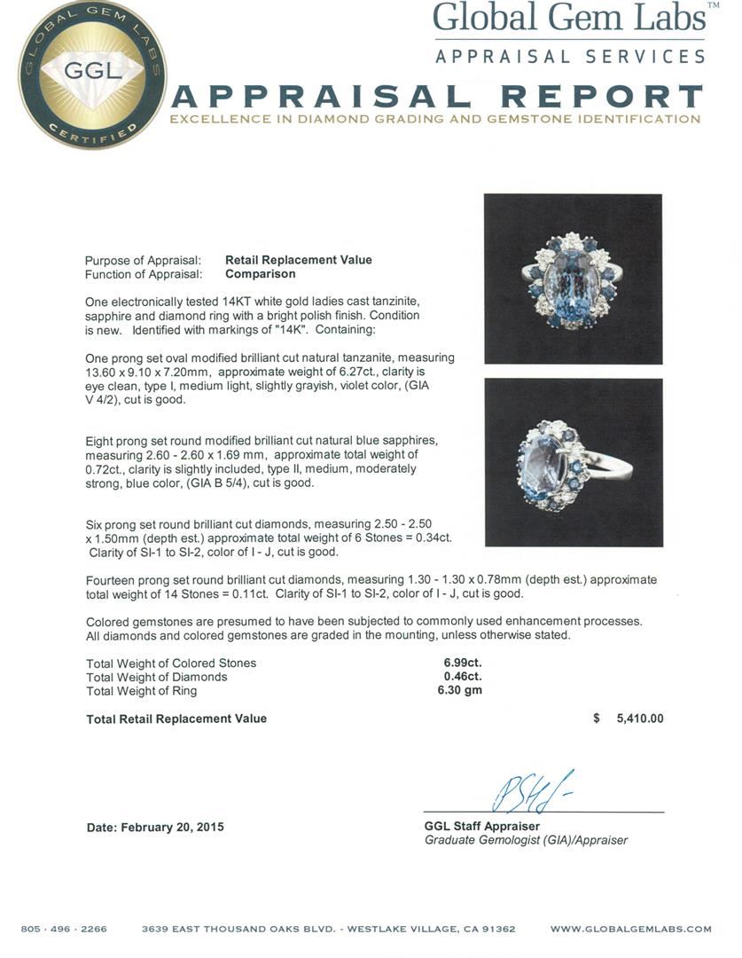 One electronically tested 14KT white gold ladies cast tanzanite, sapphire and diamond ring with a bright polish finish. Identified with markings of "14K". Condition is new. Containing: One prong set oval modified brilliant cut natural tanzanite, measuring 13.60 x 9.10 x 7.20mm, approximate weight of 6.27ct., clarity is eye clean, type I, medium light, slightly grayish, violet color, (GIA V 4/2), cut is good. Eight prong set round modified brilliant cut natural blue sapphires, measuring 2.60 - 2.60 x 1.69 mm, approximate total weight of 0.72ct., clarity is slightly included, type II, medium, moderately strong, blue color, (GIA B 5/4), cut is good. Six prong set round brilliant cut diamonds, measuring 2.50 - 2.50 x 1.50mm (depth est.) approximate total weight of 6 Stones = 0.34ct. Clarity: SI-1 to SI-2. Color: I - J, Cut is Good. Fourteen prong set round brilliant cut diamonds, measuring 1.30 - 1.30 x 0.78mm (depth est.) approximate total weight of 14 Stones = 0.11ct. Clarity: SI-1 to SI-2. Color: I - J, Cut is Good. Colored gemstones are presumed to have been subjected to commonly used enhancement processes. All diamonds and colored gemstones are graded in the mounting, unless otherwise stated. Total Weight of Colored Stones 6.99ct. Total Weight of Diamonds 0.46ct. Total Weight of Ring 6.30 grams. GGL Appraised at $5,410.00.