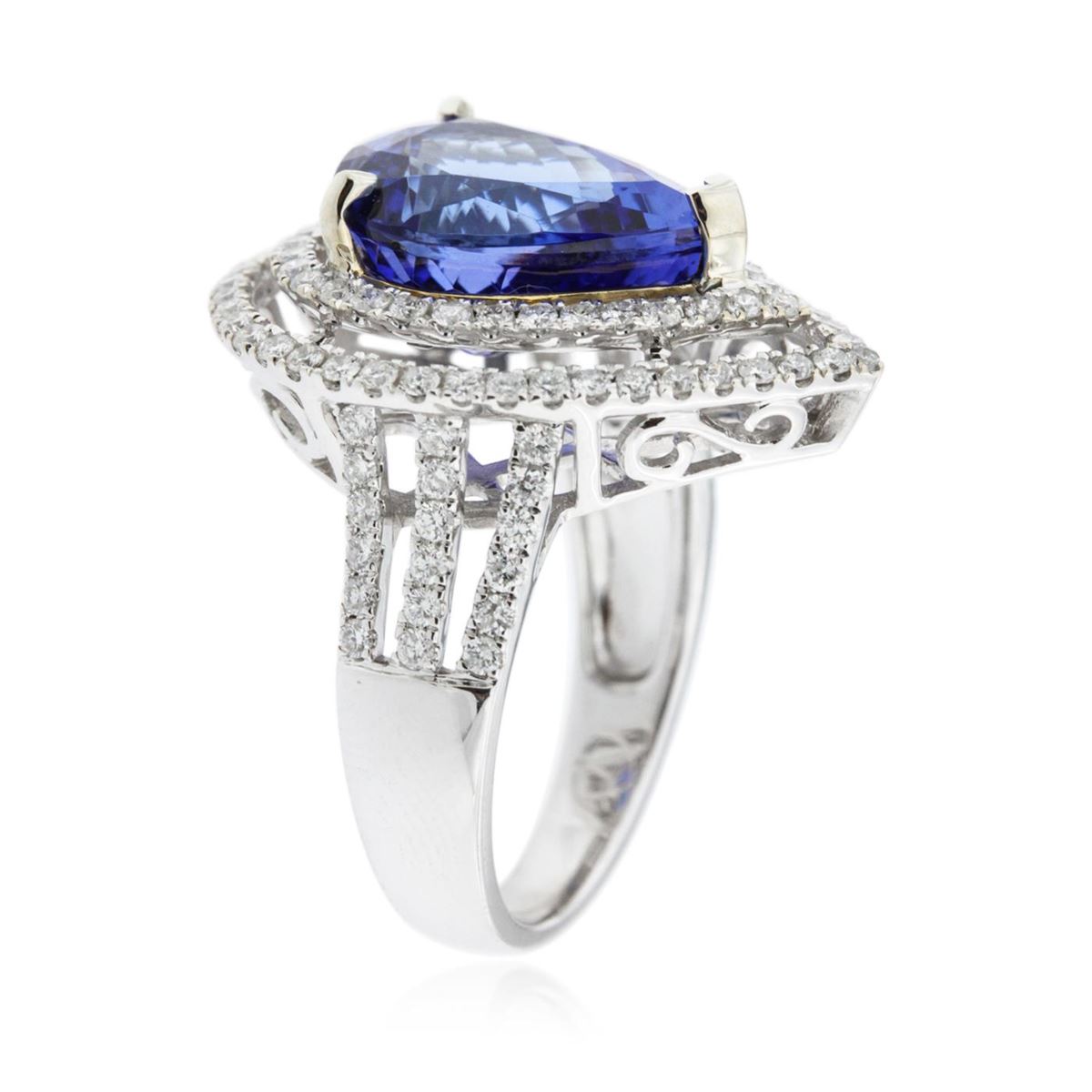 One electronically tested 14KT white gold Ladies combination cast & assembled ring with a bright polish finish. Condition is new. Identified with markings of "14K". Containing: One prong set pear modified brilliant cut natural tanzanite, measuring 14.00 x 9.00 x 5.85mm, approximate weight of 6.27ct., clarity is eye clean, type I, medium, moderately strong, bluish violet color, (GIA bV 5/4), cut is very good. Colored gemstones are presumed to have been subjected to commonly used color/clarity enhancement processes. One Hundred Ten prong set round brilliant cut diamonds, measuring 1.30 - 1.30 x 0.78mm (depth est.) approximate. Total Weight of 110 Stones = 1.12ct. Clarity: I-1 to I-2. Color: I - J, Cut is Good. Total Weight of Colored Stones 6.27ct. Total Weight of Diamonds 1.12ct. Total Weight of Ring 8.00 grams. GGL Appraised at $10,635.00.