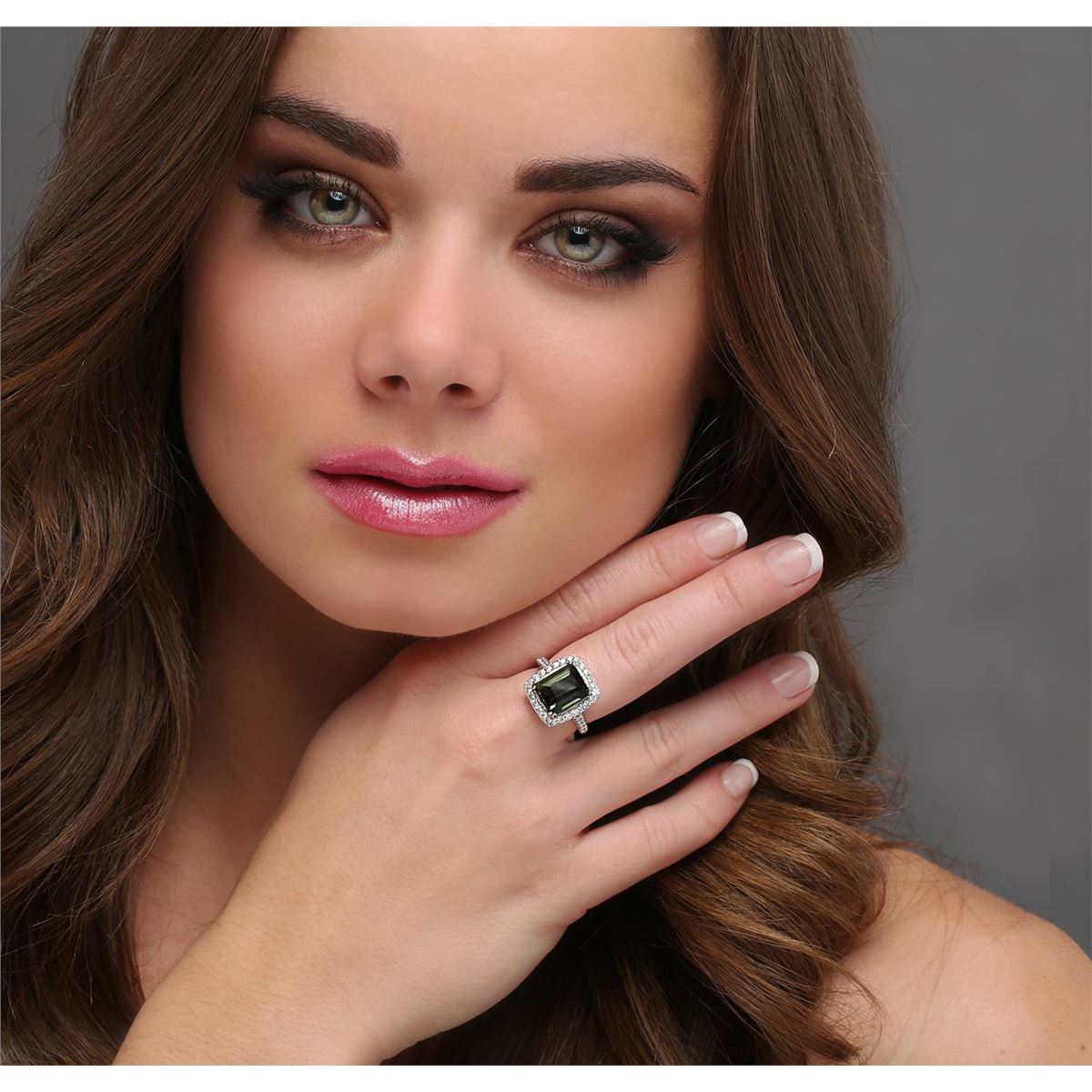 One electronically tested 14KT white gold ladies cast green tourmaline and diamond ring with a bright polish finish. The featured green tourmaline is set within a diamond bezel supported by diamond set shoulders, completed by a two and one-half millimeter wide band. Identified with markings of "K14". Condition is new, good workmanship. Containing: One prong set rectangular step cut natural green tourmaline, measuring 10.50 x 8.80 x 7.00mm, 6% bulge factor, approximate weight of 6.29ct., clarity is slightly included, type I, dark, slightly grayish, slightly yellowish green color, (GIA slyG 7/2), cut is good. Transmitting light with a minimum of distortion, transparent. Naturally occurring internal & external characteristics are present. Colored Stone Grading Report attached. Graded in the setting. Thirty-Six prong set round brilliant cut diamonds, measuring 1.80 - 1.70 x 1.05mm (depth est.) approximate total weight of 36 Stones = 0.80ct. Graded in the setting. Clarity SI-2 to I-1. Color G - I. Total Weight of Colored Stones 6.29ct. Total Weight of Diamonds 0.80ct. Total Weight of Ring 7.32 grams. AIG Appraised at $4,675.00.