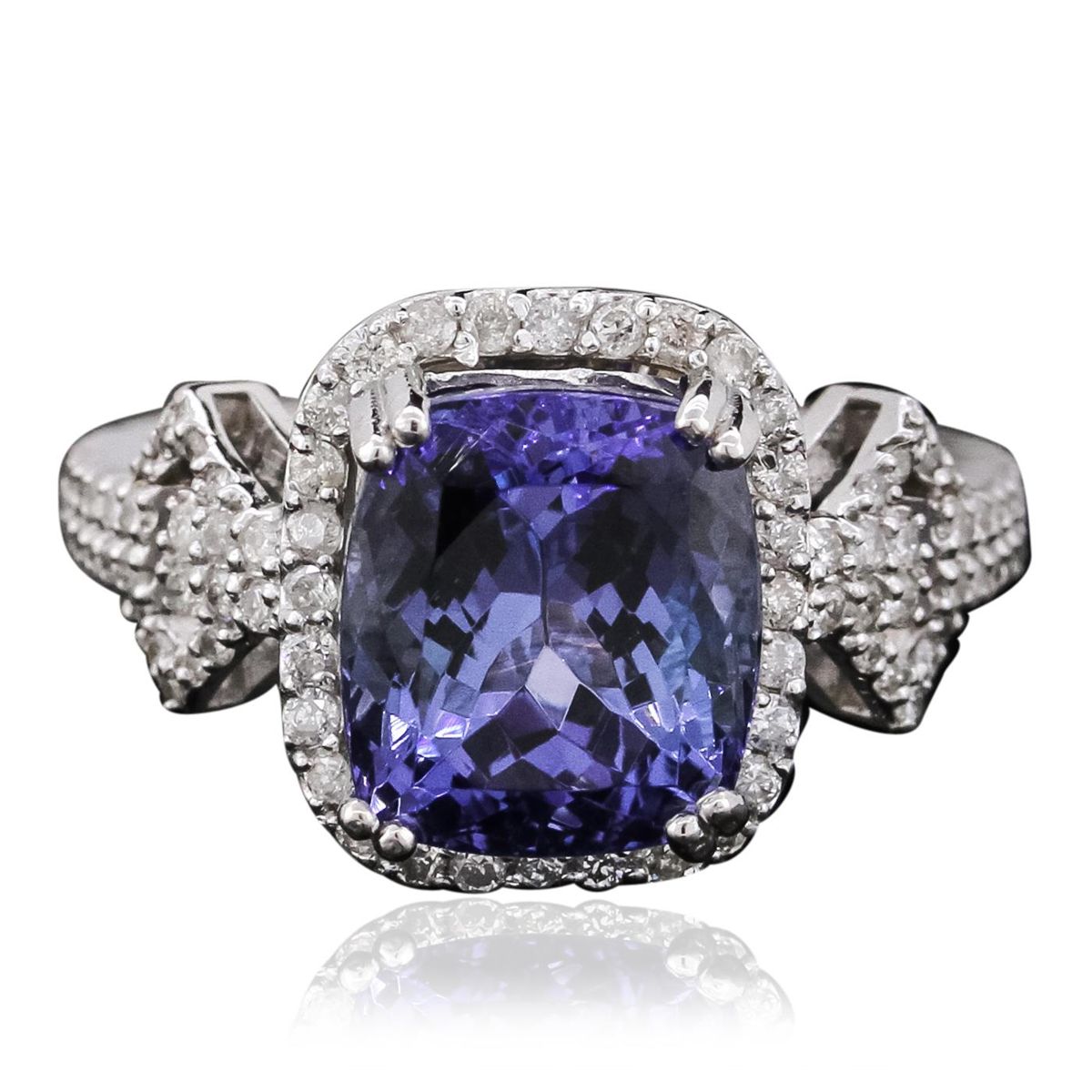 One electronically tested 14KT white gold ladies cast tanzanite & diamond ring with a bright finish. The featured tanzanite is set within a diamond bezel, supported by an elaborate under gallery and diamond set shoulders, completed by a two millimeter wide band. Identified with markings of "K14". Condition is new, good workmanship. Containing: One prong set rectangular cushion mixed cut natural tanzanite, measuring 10.00 x 9.00 x 7.80mm, 14% bulge factor, approximate weight of 6.30ct., clarity is eye clean, type I, medium dark, slightly grayish, violetish blue color, (GIA vB 6/2), cut is good. Transmitting light with no distortion, transparent. Colored Stone Grading Report attached. Graded in the setting. Tanzanite is a very rare gemstone that is only found in the country of Tanzania. Originally discovered in 1967. Tiffany & Company, named the stone Tanzanite. It is found in the Usumburu Mountains that border the Umba Valley of northern Tanzania. Tanzanite occurs in gray, brown, violet, blue, reddish-purple, & green. The gem is interesting because of its exceptional pleochroism. Rotated in different directions a tanzanite will exhibit multiple changes of color. Tanzanite has a low tolerance to ultrasonic cleaning, and should not be cleaned using this method. Eighty-Four prong set round brilliant cut diamonds, measuring 1.30 - 0.90 x 0.66mm (depth est.) approximate total weight of 84 Stones = 0.42ct. Graded in the setting. Clarity: SI-2 to I-2. Color: H - J. Total Weight of Colored Stones 6.30ct. Total Weight of Diamonds 0.42ct. Total Weight of Ring 6.49 grams. AIG Appraised at $14,800.00.