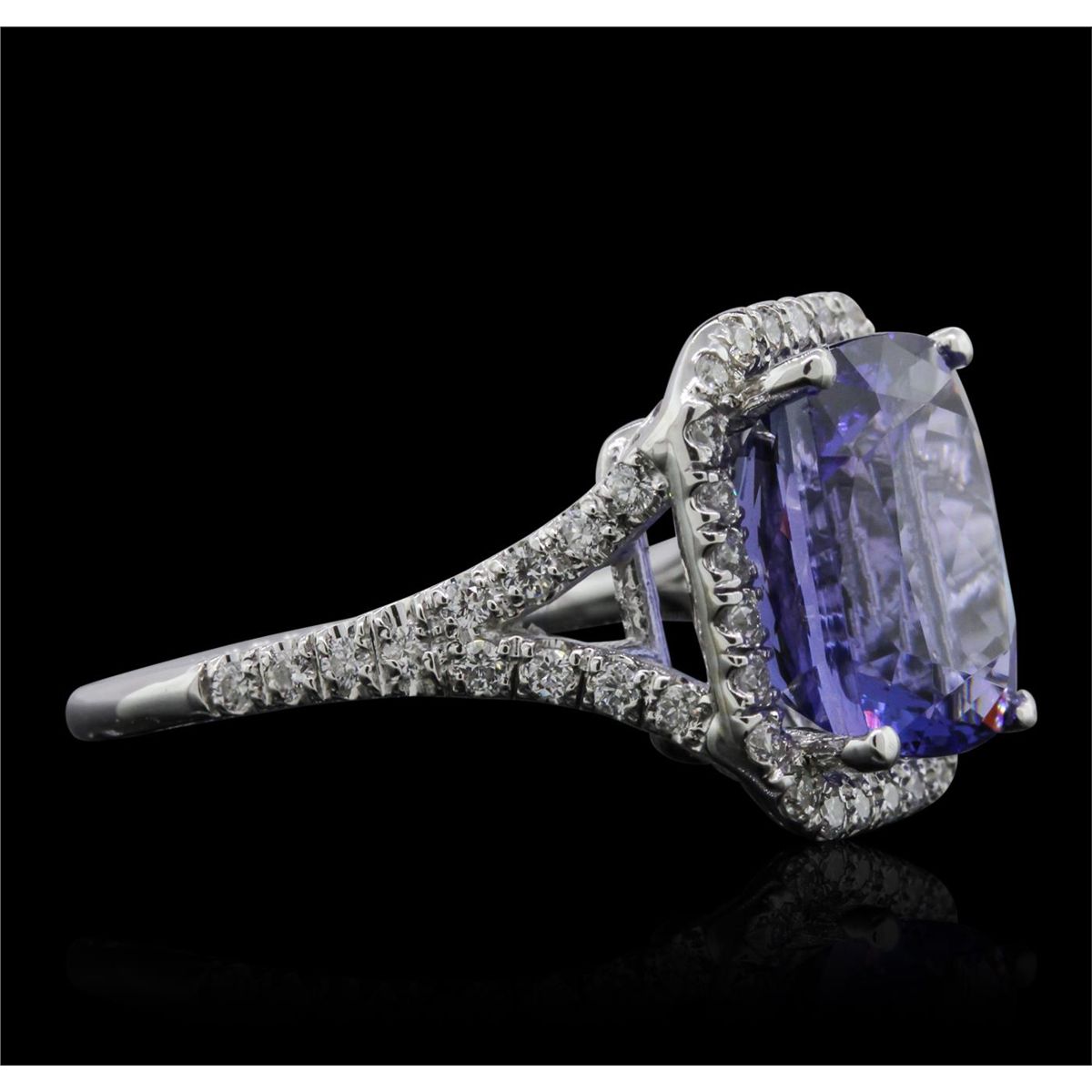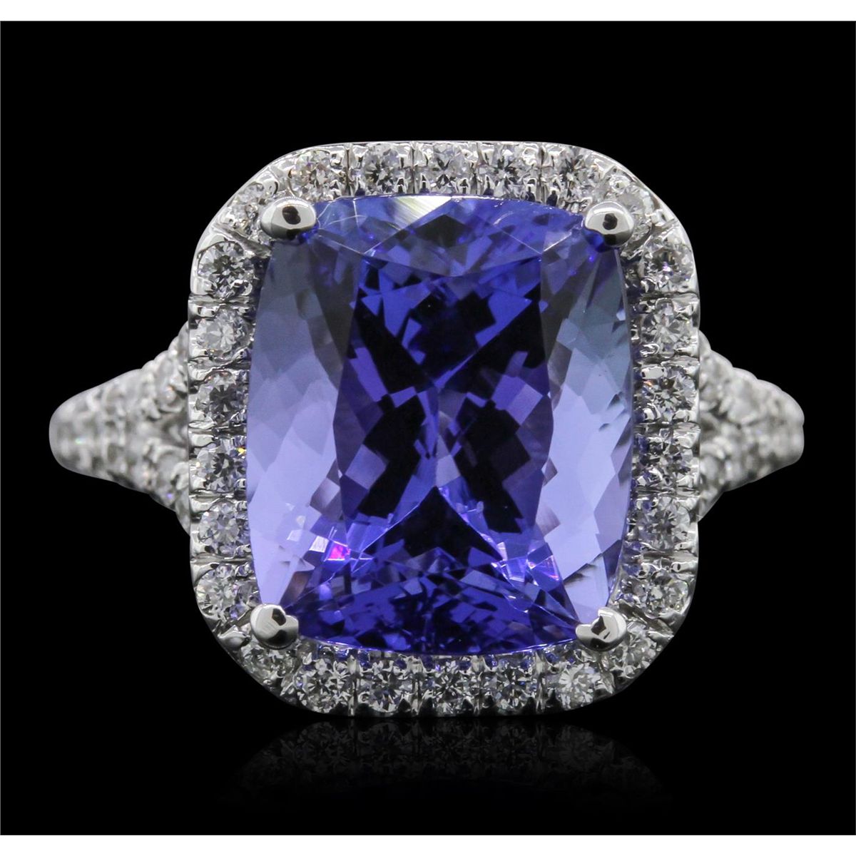 One electronically tested 14KT white gold ladies cast tanzanite and diamond ring with a bright polish finish. Condition is new, good workmanship. The featured tanzanite is set within a diamond bezel supported by diamond set split shoulders, completed by a one and one-half millimeter wide band. Identified with markings of "14K". Containing: One prong set rectangular cushion mixed cut natural tanzanite, measuring 11.40 x 9.30 x 7.20mm, 5%. bulge factor, approximate weight of 6.31ct., clarity is eye clean, type I, medium dark, very slightly grayish, bluish violet color, (GIA bV 6/3), cut is good. Transmitting light with no distortion, transparent. Colored Stone Grading Report attached. Graded in the setting. Tanzanite is a very rare gemstone that is only found in the country of Tanzania. Originally discovered in 1967. Tiffany & Company, named the stone Tanzanite. It is found in the Usumburu Mountains that border the Umba Valley of northern Tanzania. Tanzanite occurs in gray, brown, violet, blue, reddish-purple, & green. The gem is interesting because of its exceptional pleochroism. Rotated in different directions a tanzanite will exhibit multiple changes of color. Tanzanite has a low tolerance to ultrasonic cleaning, and should not be cleaned using this method. Fifty prong set round brilliant cut diamonds, measuring 1.40 - 1.30 x 0.81mm (depth est.) approximate. Total Weight of 50 Stones = 0.58ct. Graded in the setting. Clarity: SI-1 to SI-2. Color: G - I. Total Weight of Colored Stones 6.31ct. Total Weight of Diamonds 0.58ct. Total Weight of Ring 5.22 grams. AIG Appraised at $18,710.00.