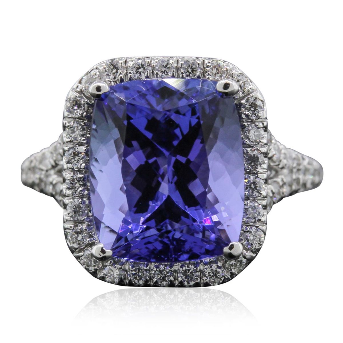 One electronically tested 14KT white gold ladies cast tanzanite and diamond ring with a bright polish finish. Condition is new, good workmanship. The featured tanzanite is set within a diamond bezel supported by diamond set split shoulders, completed by a one and one-half millimeter wide band. Identified with markings of "14K". Containing: One prong set rectangular cushion mixed cut natural tanzanite, measuring 11.40 x 9.30 x 7.20mm, 5%. bulge factor, approximate weight of 6.31ct., clarity is eye clean, type I, medium dark, very slightly grayish, bluish violet color, (GIA bV 6/3), cut is good. Transmitting light with no distortion, transparent. Colored Stone Grading Report attached. Graded in the setting. Tanzanite is a very rare gemstone that is only found in the country of Tanzania. Originally discovered in 1967. Tiffany & Company, named the stone Tanzanite. It is found in the Usumburu Mountains that border the Umba Valley of northern Tanzania. Tanzanite occurs in gray, brown, violet, blue, reddish-purple, & green. The gem is interesting because of its exceptional pleochroism. Rotated in different directions a tanzanite will exhibit multiple changes of color. Tanzanite has a low tolerance to ultrasonic cleaning, and should not be cleaned using this method. Fifty prong set round brilliant cut diamonds, measuring 1.40 - 1.30 x 0.81mm (depth est.) approximate. Total Weight of 50 Stones = 0.58ct. Graded in the setting. Clarity: SI-1 to SI-2. Color: G - I. Total Weight of Colored Stones 6.31ct. Total Weight of Diamonds 0.58ct. Total Weight of Ring 5.22 grams. AIG Appraised at $18,710.00.