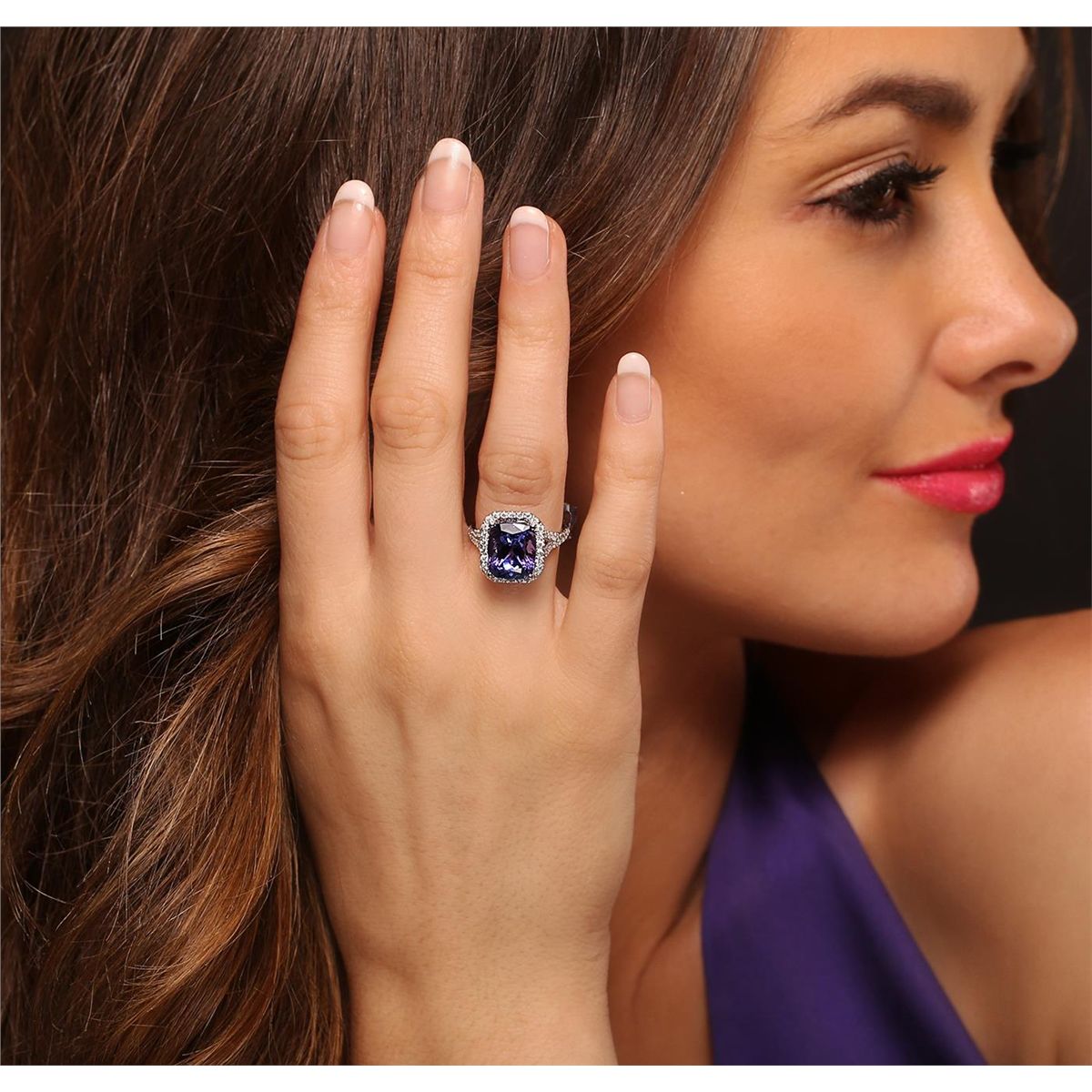 One electronically tested 14KT white gold ladies cast tanzanite and diamond ring with a bright polish finish. Condition is new, good workmanship. The featured tanzanite is set within a diamond bezel supported by diamond set split shoulders, completed by a one and one-half millimeter wide band. Identified with markings of "14K". Containing: One prong set rectangular cushion mixed cut natural tanzanite, measuring 11.40 x 9.30 x 7.20mm, 5%. bulge factor, approximate weight of 6.31ct., clarity is eye clean, type I, medium dark, very slightly grayish, bluish violet color, (GIA bV 6/3), cut is good. Transmitting light with no distortion, transparent. Colored Stone Grading Report attached. Graded in the setting. Tanzanite is a very rare gemstone that is only found in the country of Tanzania. Originally discovered in 1967. Tiffany & Company, named the stone Tanzanite. It is found in the Usumburu Mountains that border the Umba Valley of northern Tanzania. Tanzanite occurs in gray, brown, violet, blue, reddish-purple, & green. The gem is interesting because of its exceptional pleochroism. Rotated in different directions a tanzanite will exhibit multiple changes of color. Tanzanite has a low tolerance to ultrasonic cleaning, and should not be cleaned using this method. Fifty prong set round brilliant cut diamonds, measuring 1.40 - 1.30 x 0.81mm (depth est.) approximate. Total Weight of 50 Stones = 0.58ct. Graded in the setting. Clarity: SI-1 to SI-2. Color: G - I. Total Weight of Colored Stones 6.31ct. Total Weight of Diamonds 0.58ct. Total Weight of Ring 5.22 grams. AIG Appraised at $18,710.00.