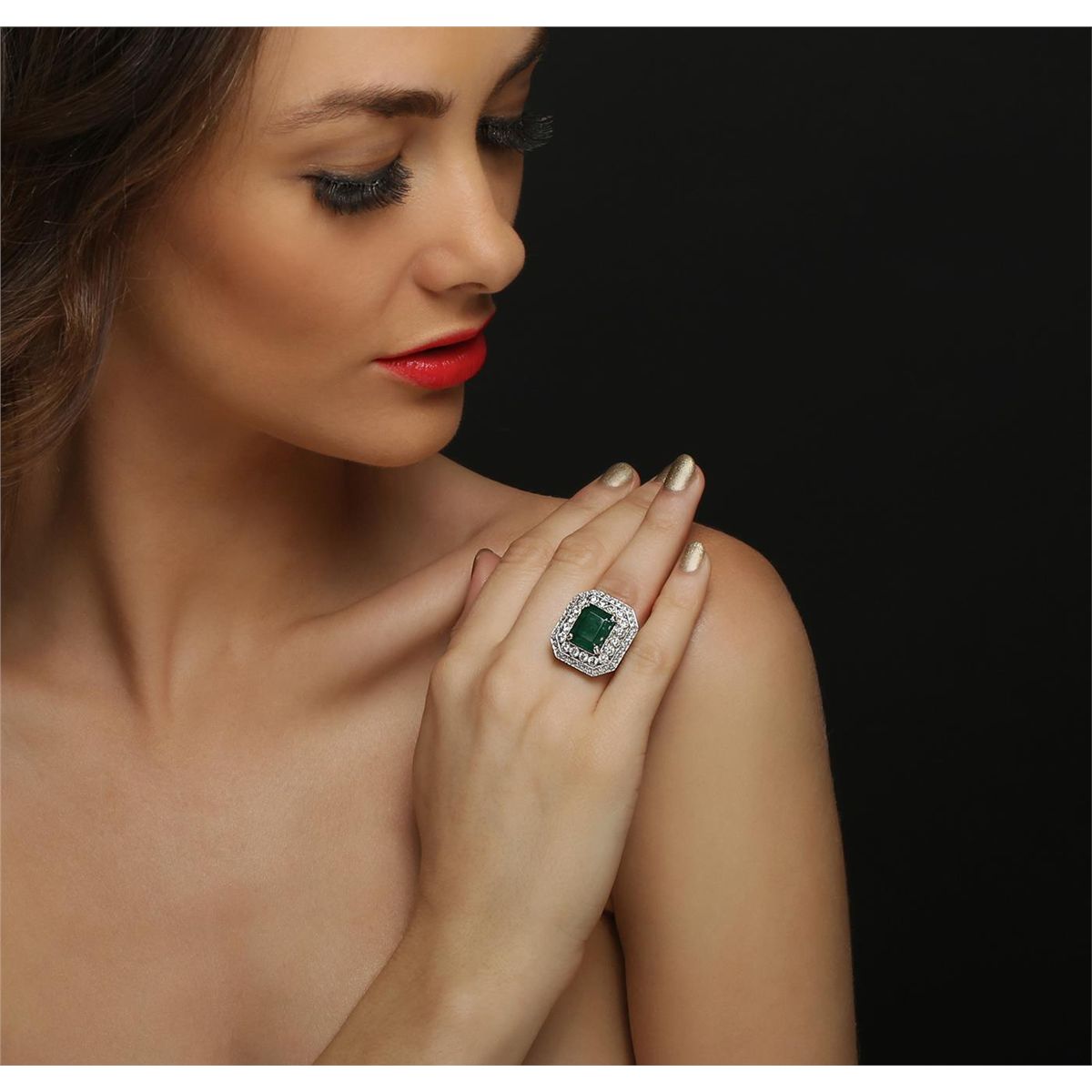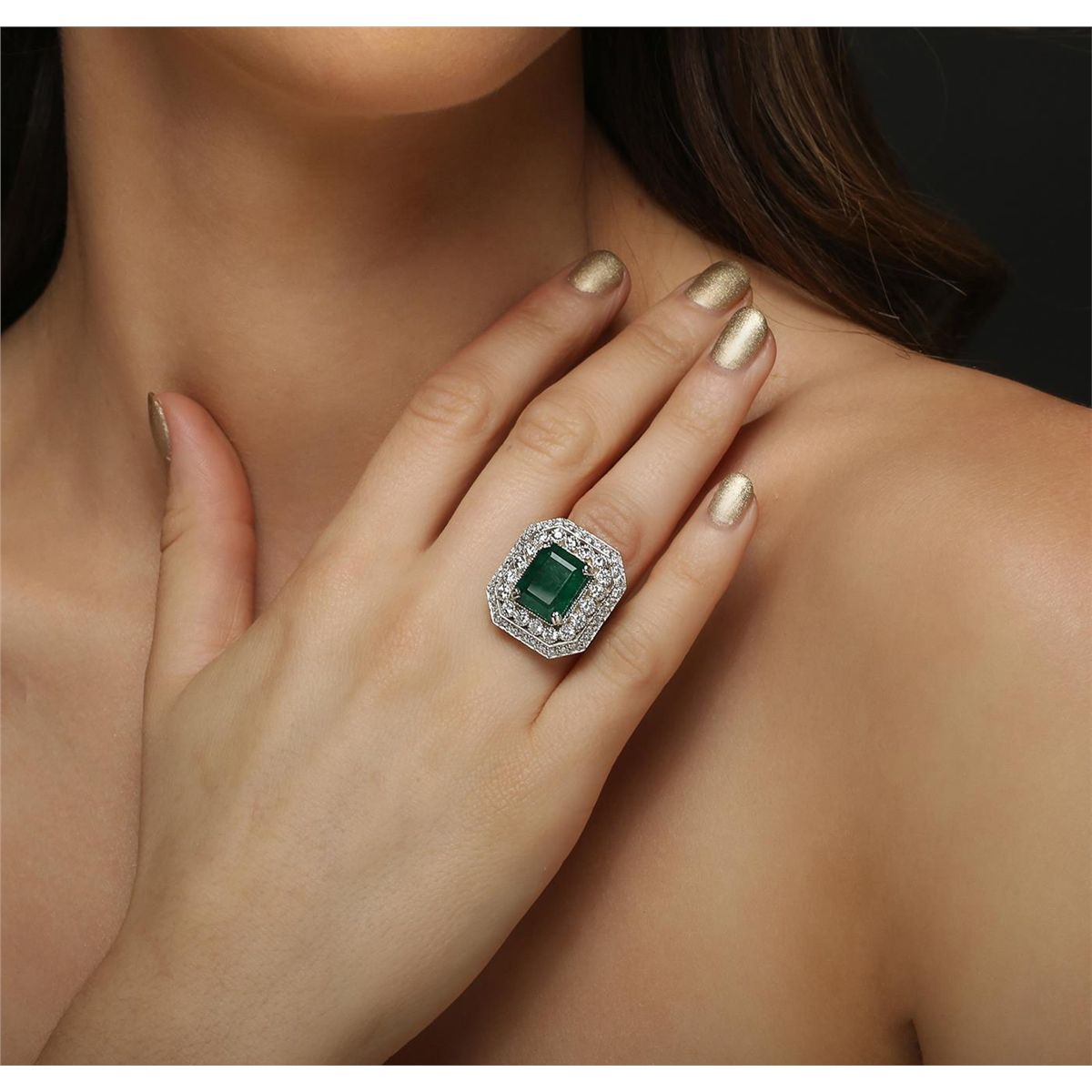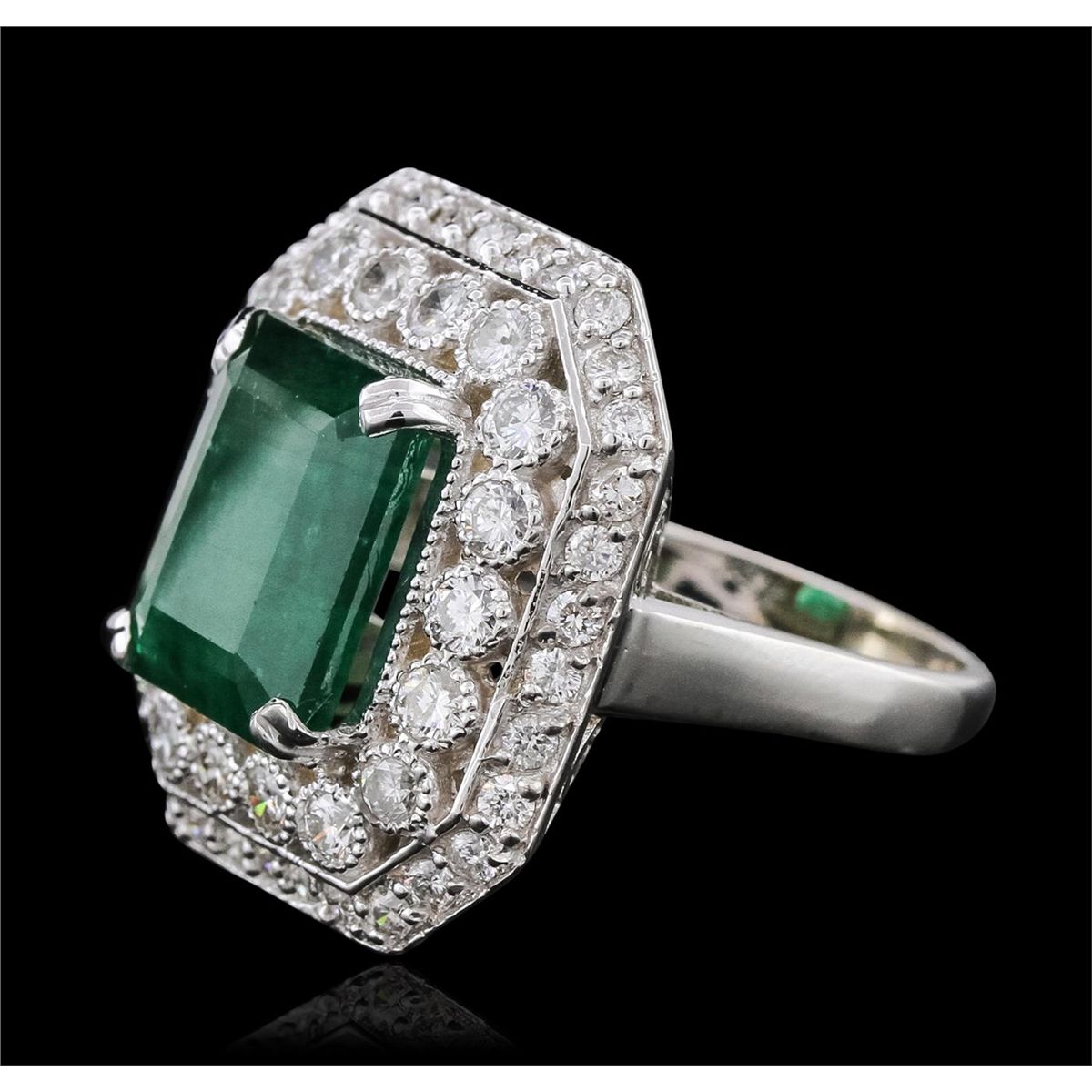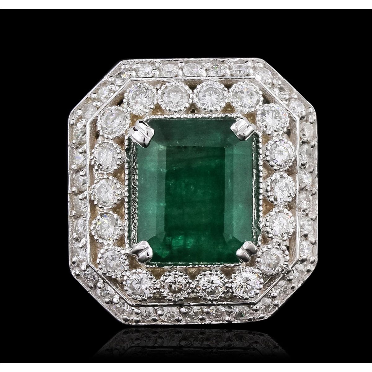 One electronically tested 14KT white gold ladies cast emerald and diamond ring. The featured emerald is set within two tiered diamond bezels, completed by a two millimeter wide band. Bright polish finish with milgrain detailing throughout. Identified with markings of "14K". Condition is new, good workmanship. Containing: One prong set rectangular step cut natural emerald, measuring 12.45 x 10.05 x 5.85mm, 6% bulge factor, approximate weight of 6.33ct., clarity is heavily included, type III, medium dark, very slightly grayish, very slightly bluish green color, (GIA vslbG 6/3), cut is good. Transmitting light somewhat diffusely, transparent to translucent. Naturally occurring internal & external characteristics are present. Colored Stone Grading Report attached, Indications of oil residue. Graded in the setting. Eighteen bezel set round brilliant cut diamonds, measuring 2.60 - 2.50 x 1.53mm (depth est.) approximate total weight of 18 Stones = 1.19ct. Graded in the setting. Clarity: SI-1 to I-1. Color: G - I Thirty-Four prong set round brilliant cut diamonds, measuring 1.90 - 1.80 x 1.11mm (depth est.) approximate total weight of 34 Stones = 0.88ct. Graded in the setting. Clarity: SI-2 to I-1. Color: G - I. Total Weight of Colored Stones 6.33ct. Total Weight of Diamonds 2.07ct. Total Weight of Ring 11.07 grams. AIG Appraised at $18,205.00.