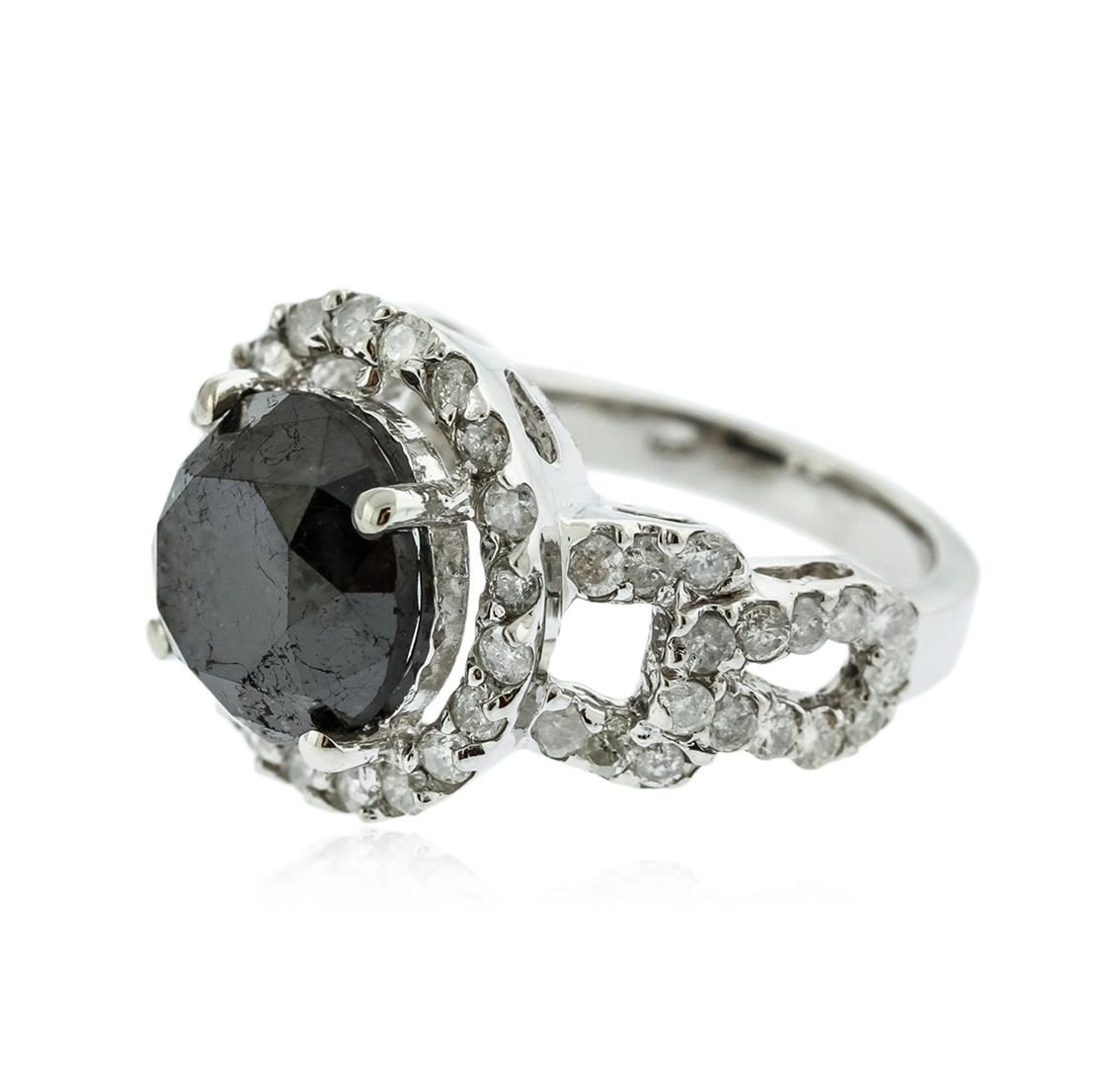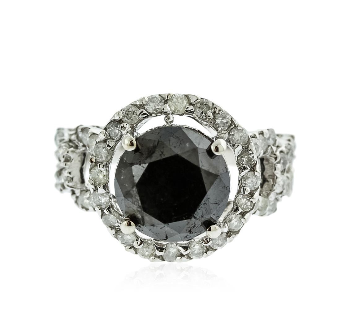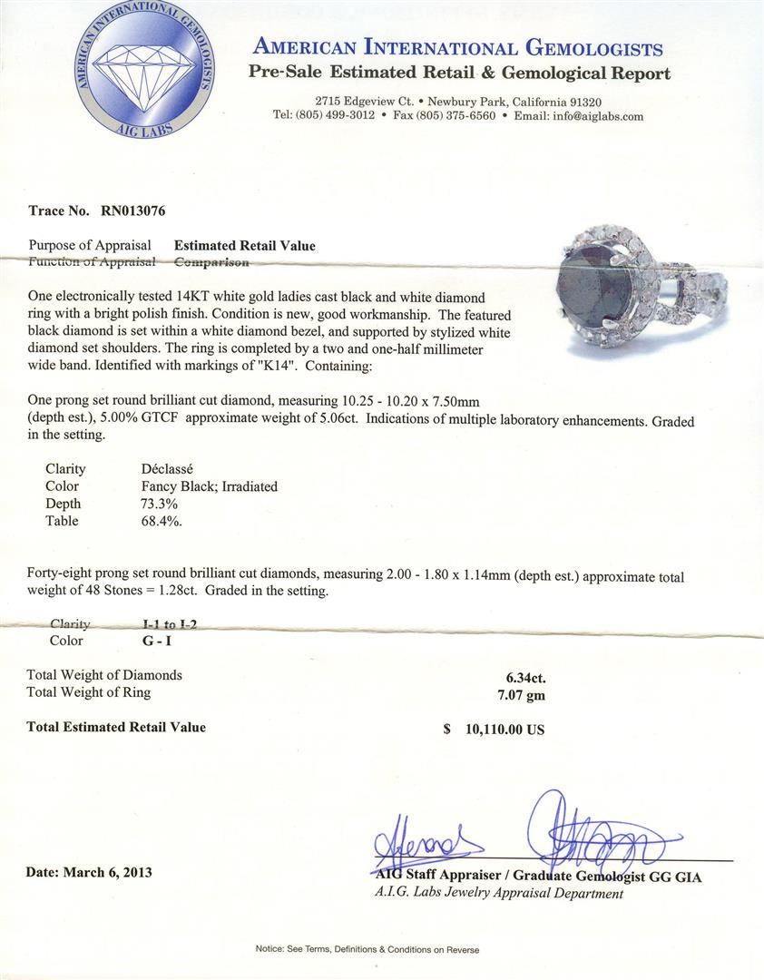 One electronically tested 14KT white gold ladies cast black and white diamond ring with a bright polish finish. The featured black diamond is set within a white diamond bezel, and supported by stylized white diamond set shoulders. The ring is completed by a two and one-half millimeter wide band. Identified with markings of "K14". Condition is new, good workmanship. Containing: One prong set round brilliant cut diamond, measuring 10.25 - 10.20 x 7.50mm (depth est.), 5.00.%. GTCF approximate weight of 5.06ct. Indications of multiple laboratory enhancements. Graded in the setting. Clarity Déclassé‚. Color: Fancy Black; Irradiated. Depth: 73.3%. Table: 68.4%. Forty-Eight prong set round brilliant cut diamonds, measuring 2.00 - 1.80 x 1.14mm (depth est.) approximate. Total Weight of 48 Stones = 1.28ct. Graded in the setting. Clarity: I-1 to I-2. Color: G - I. Total Weight of Diamonds 6.34ct. Total Weight of Ring 7.07gm. AIG Appraised at $10,110.00.