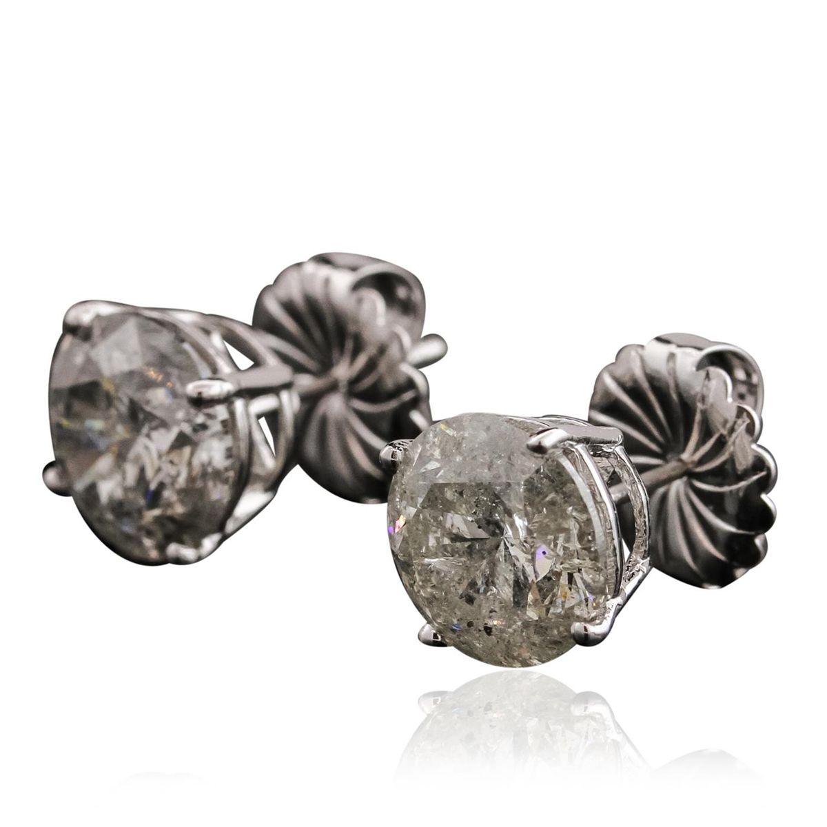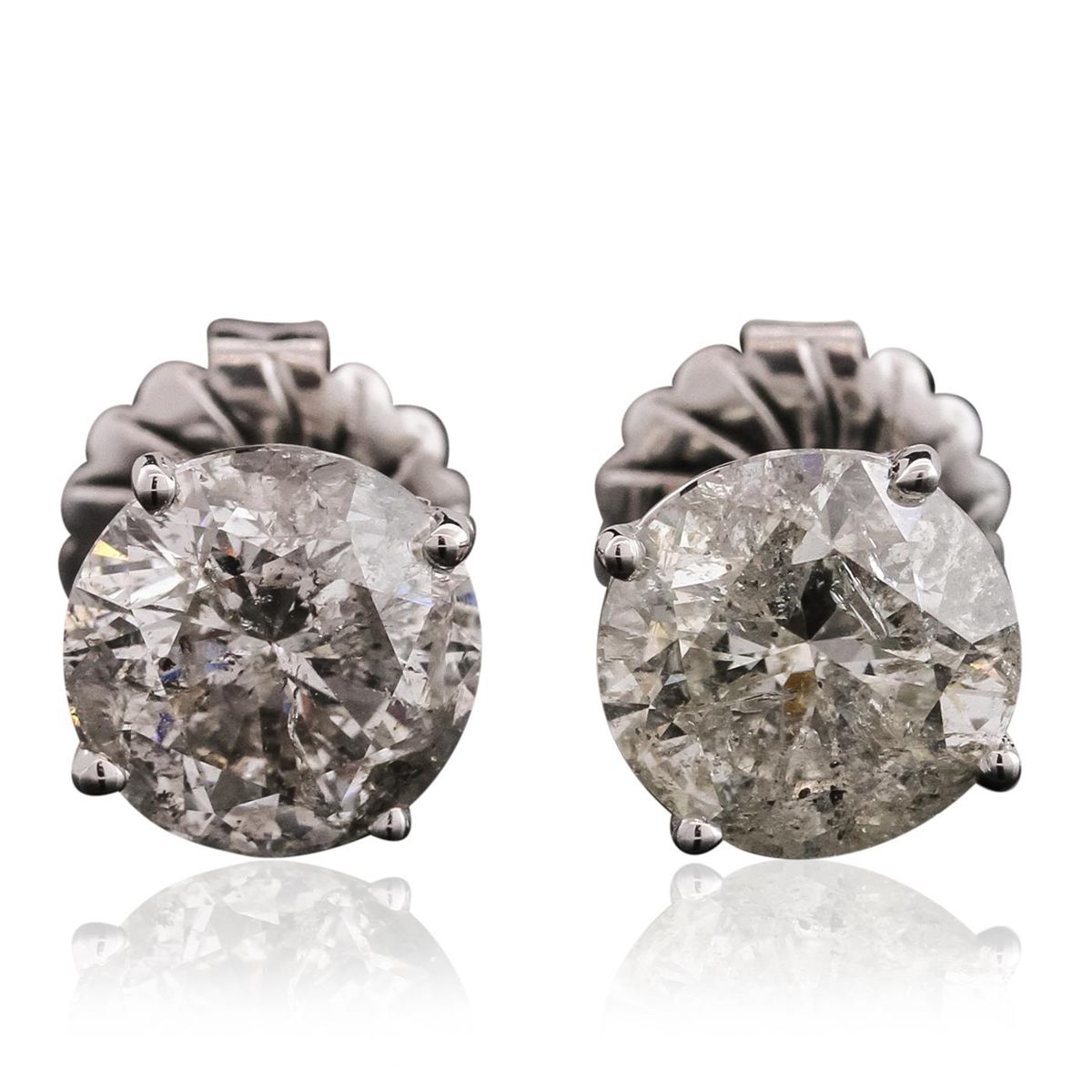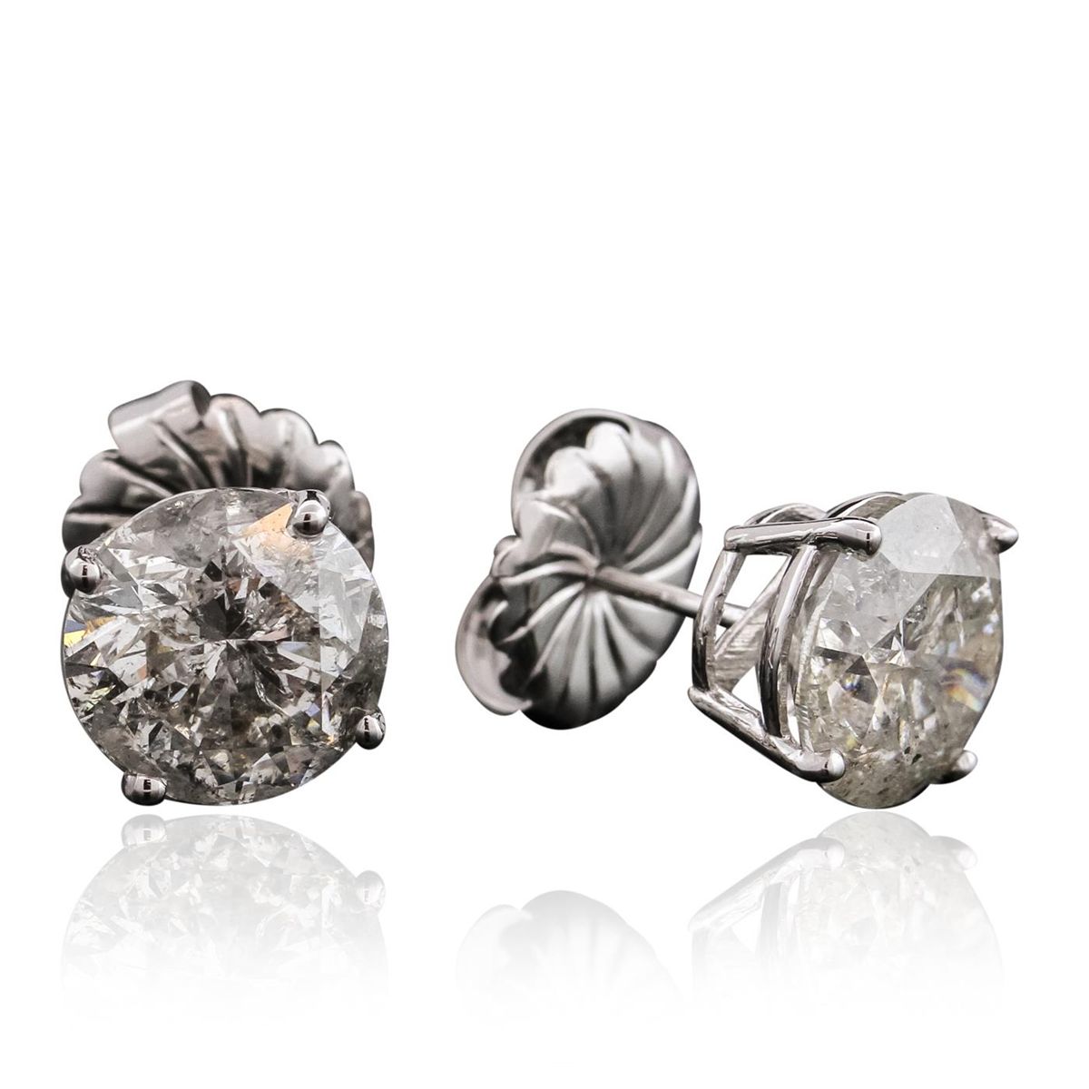 One pair electronically tested 14KT white gold cast & assembled diamond solitaire earrings with standard backs. Bright polish finish. Identified with markings of "14K". Condition is new, good workmanship. Containing: One prong set round brilliant cut diamond, measuring 9.30 - 9.25 x 5.80mm (depth est.), 3.00% GTCF approximate weight of 3.23ct. Graded in the setting. Clarity: I-2. Color: 62.5%. Table 61.4%. One prong set round brilliant cut diamond, measuring 9.29 - 9.25 x 5.56mm (depth est.), 4.00% GTCF approximate weight of 3.13ct. Graded in the setting. Clarity: I-2. Color: 60.0%. Table 58.3%. Total Weight of Diamonds 6.36ct. Total Weight of Earrings 3.04 grams. AIG Appraised at $53,765.00.