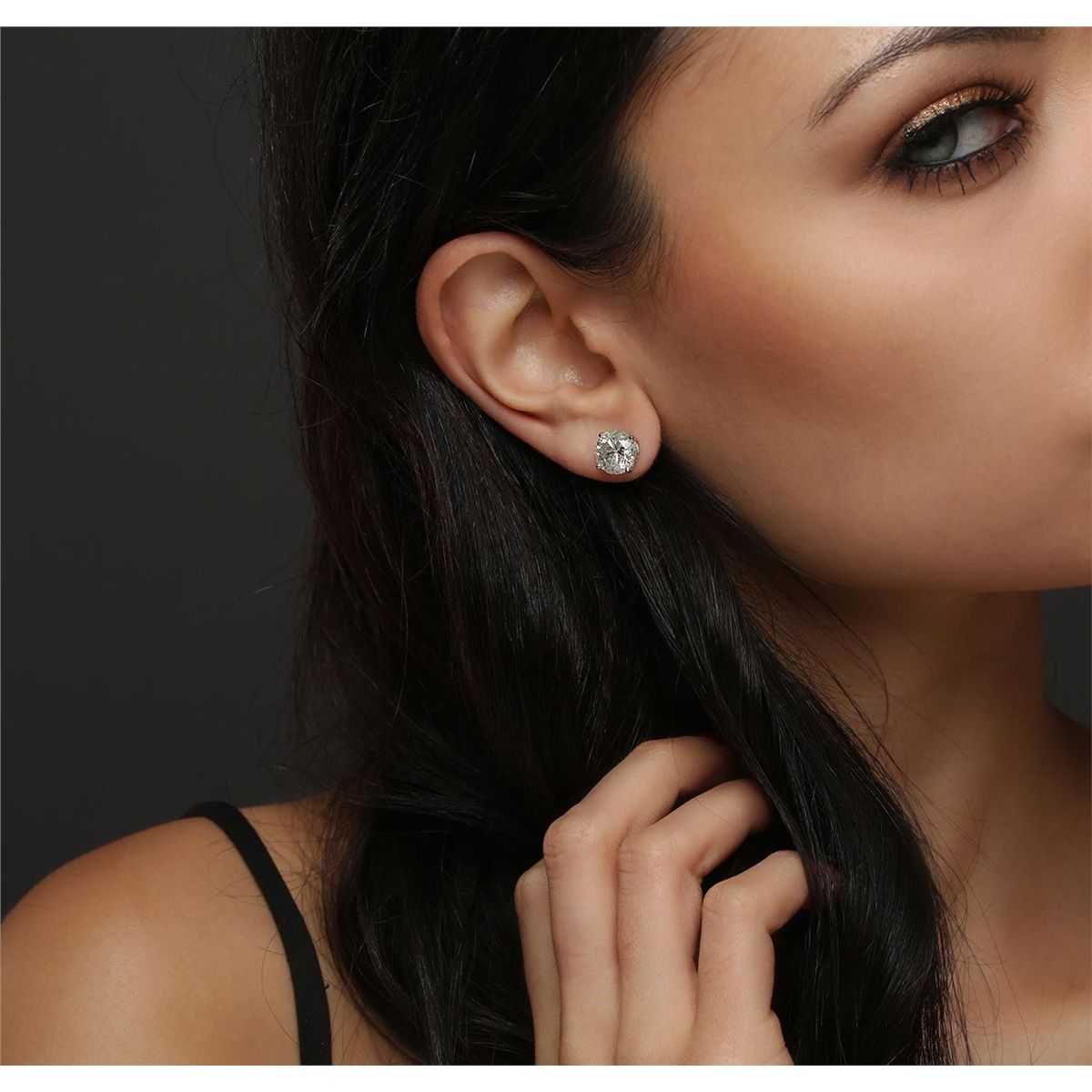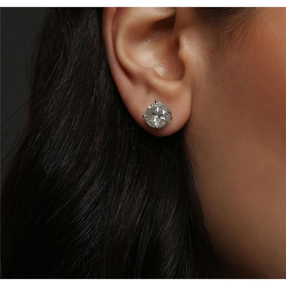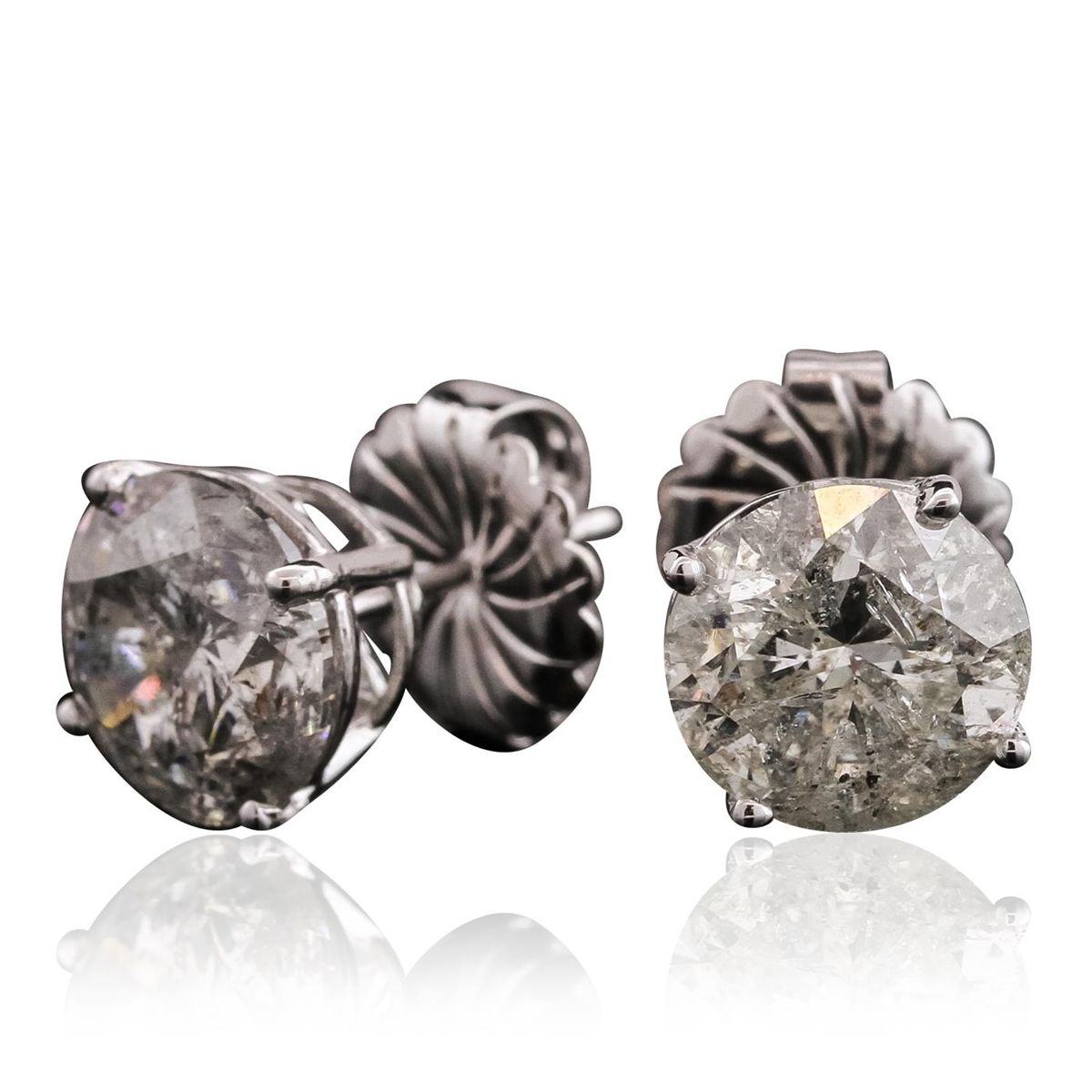 One pair electronically tested 14KT white gold cast & assembled diamond solitaire earrings with standard backs. Bright polish finish. Identified with markings of "14K". Condition is new, good workmanship. Containing: One prong set round brilliant cut diamond, measuring 9.30 - 9.25 x 5.80mm (depth est.), 3.00% GTCF approximate weight of 3.23ct. Graded in the setting. Clarity: I-2. Color: 62.5%. Table 61.4%. One prong set round brilliant cut diamond, measuring 9.29 - 9.25 x 5.56mm (depth est.), 4.00% GTCF approximate weight of 3.13ct. Graded in the setting. Clarity: I-2. Color: 60.0%. Table 58.3%. Total Weight of Diamonds 6.36ct. Total Weight of Earrings 3.04 grams. AIG Appraised at $53,765.00.