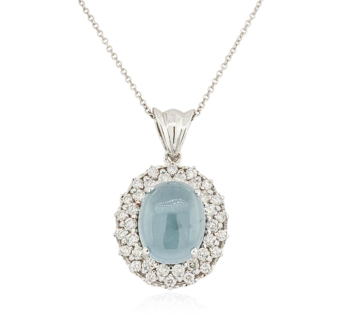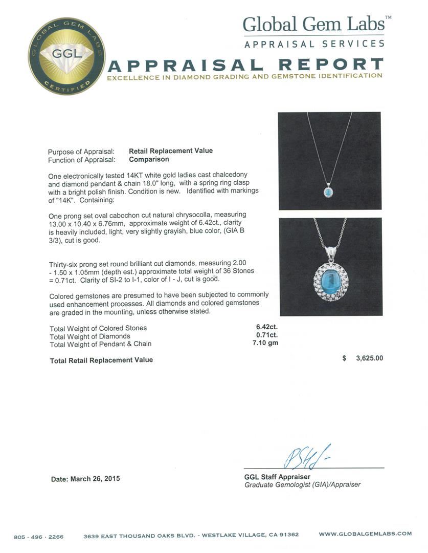 One electronically tested 14KT white gold ladies cast chalcedony and diamond pendant & chain 18.0" long, with a spring ring clasp with a bright polish finish. Identified with markings of "14K". Condition is new. Containing: One prong set oval cabochon cut natural chrysocolla, measuring 13.00 x 10.40 x 6.76mm, approximate weight of 6.42ct., clarity is heavily included, light, very slightly grayish, blue color, (GIA B 3/3), cut is good. Thirty-Six prong set round brilliant cut diamonds, measuring 2.00 - 1.50 x 1.05mm (depth est.) approximate total weight of 36 Stones = 0.71ct. Clarity: SI-2 to I-1. Color: I - J, Cut is Good. Colored gemstones are presumed to have been subjected to commonly used enhancement processes. All diamonds and colored gemstones are graded in the mounting, unless otherwise stated. Total Weight of Colored Stones 6.42ct. Total Weight of Diamonds 0.71ct. Total Weight of Pendant & Chain 7.10 grams. GGL Appraised at $3,625.00.