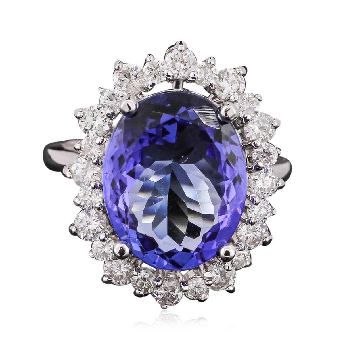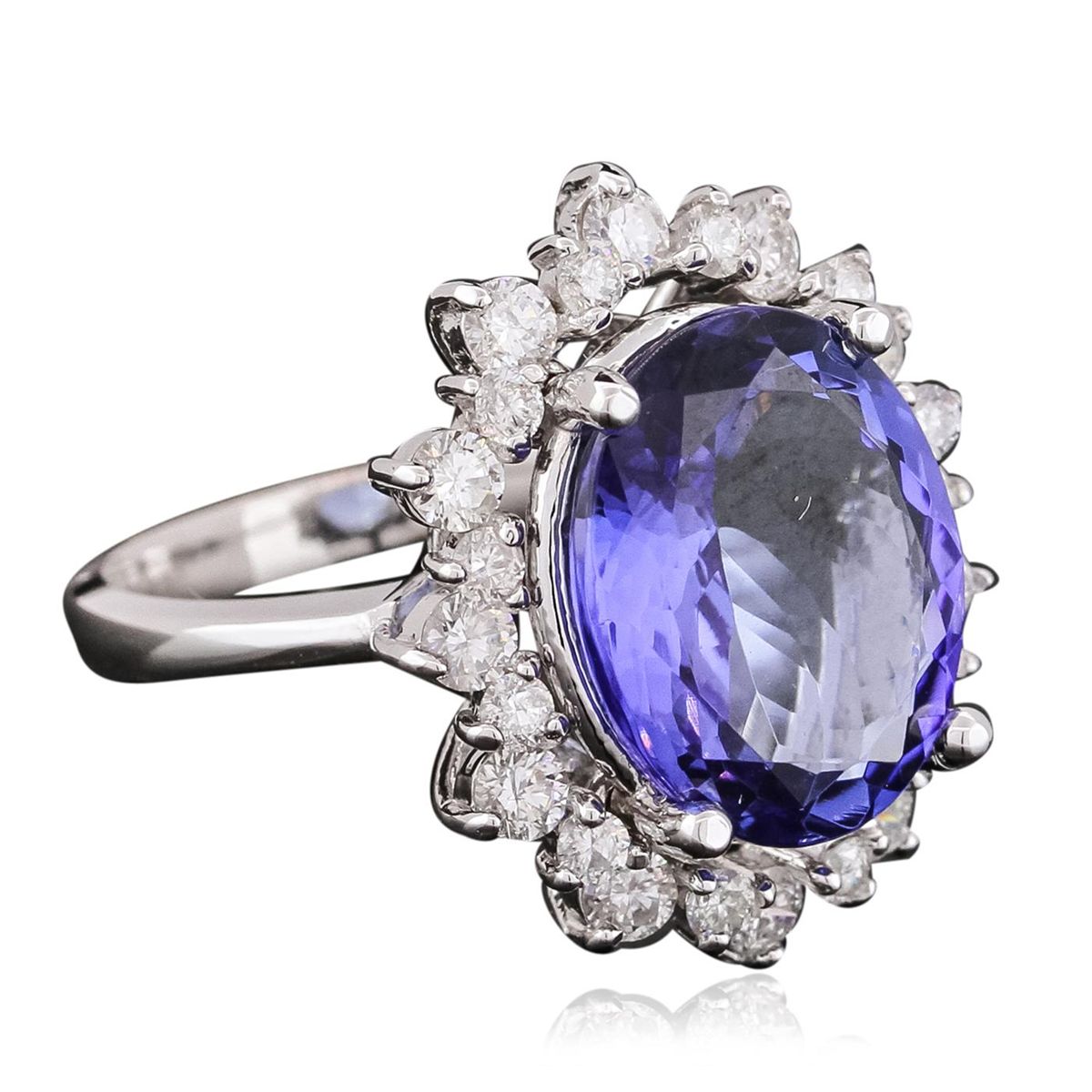 One electronically tested 14KT white gold ladies combination cast & assembled ring with a flat shank with rounded edges with a bright polish finish. Identified with markings of "K14". Condition is new. Containing: One prong set oval modified brilliant cut natural tanzanite, measuring 14.35 x 11.47 x 5.75mm, approximate weight of 6.42ct., clarity is eye clean, type I, medium, very slightly grayish, violet color, (GIA V 5/3), cut is good. Twelve prong set round brilliant cut diamonds, measuring 2.50 - 2.50 x 1.50mm (depth est.) approximate total weight of 12 Stones = 0.69ct. Clarity: SI-1 to SI-2. Color: H - J, Cut is Good. Twelve prong set round brilliant cut diamonds, measuring 1.80 - 1.80 x 1.08mm (depth est.) approximate total weight of 12 Stones = 0.26ct. Clarity: SI-2 to I-1. Color: H - J, Cut is Good. Colored gemstones are presumed to have been subjected to commonly used enhancement processes. All diamonds and colored gemstones are graded in the mounting, unless otherwise stated. Total Weight of Colored Stones 6.42ct. Total Weight of Diamonds 0.94ct. Total Weight of Ring 7.50 grams. GGL Appraised at $13,565.00.