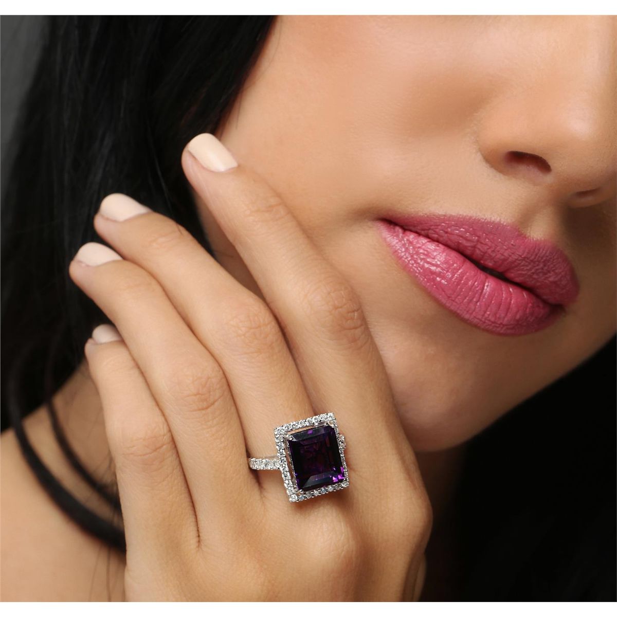 One electronically tested 14KT white gold Ladies combination cast & assembled ring with a bright polish finish. Condition is new. Identified with markings of "14K". Containing: One prong set emerald standard step cut natural amethyst, measuring 12.22 x 10.17 x 7.20mm, approximate weight of 6.43ct., clarity is eye clean, type II, medium, moderately strong, purple color, (GIA P 5/4), cut is good. Colored gemstones are presumed to have been subjected to commonly used color/clarity enhancement processes. Forty prong set round brilliant cut diamonds, measuring 2.00 - 1.50 x 1.05mm (depth est.) approximate. Total Weight of 40 Stones = 0.78ct. Clarity: I-1 to I-2. Color: H - I, Cut is Good. All grading of diamonds and colored gemstones in this piece of jewelry are graded in the mounting, unless otherwise stated. Total Weight of Colored Stones 6.43ct. Total Weight of Diamonds 0.78ct. Total Weight of Ring 4.60 grams. GGL Appraised at $4,420.00.