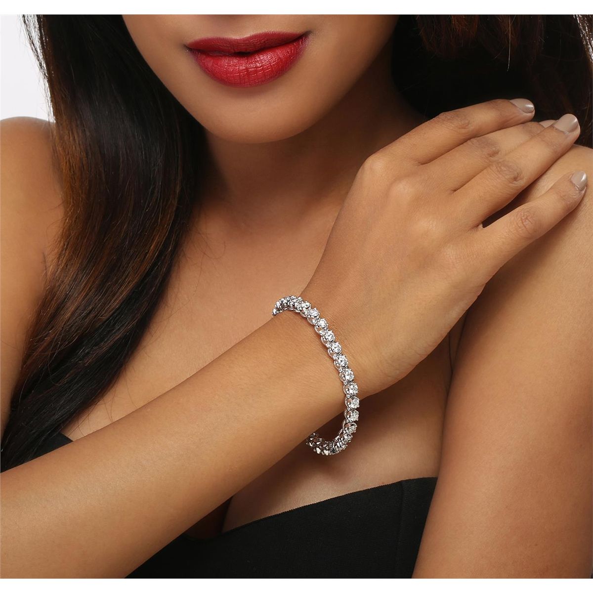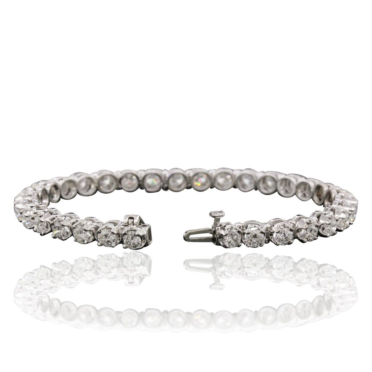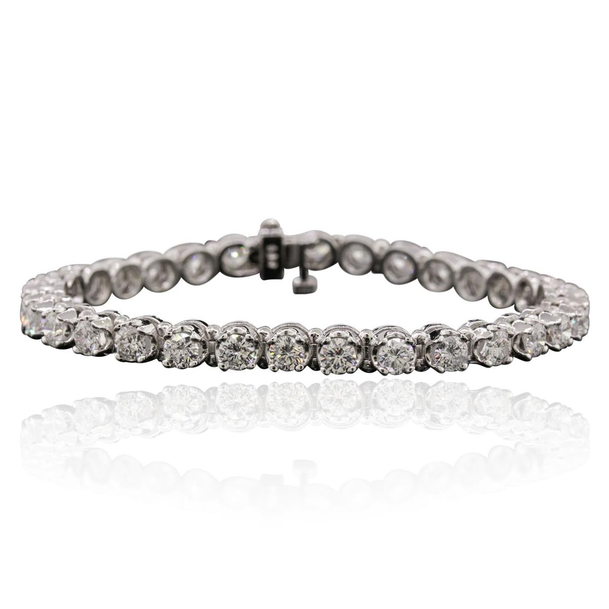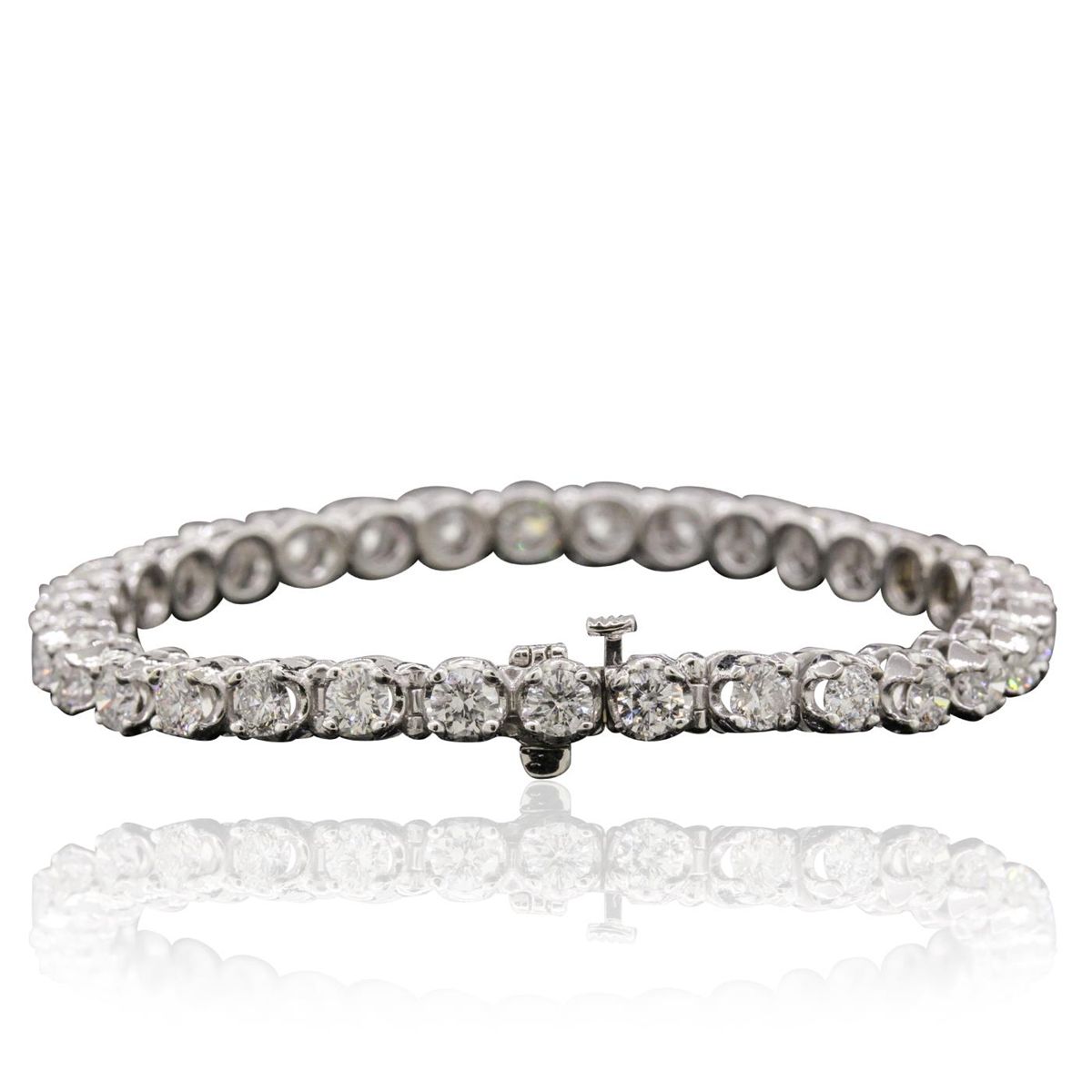 One electronically tested 14KT white gold ladies combination cast & assembled tennis bracelet with a hidden box clasp with a bright polish finish. Condition is new. Measurements: 7" in length. Identified with markings of "14K". Containing: Thirty-Two prong set round brilliant cut diamonds, measuring 3.80 - 3.80 x 2.28mm (depth est.) approximate total weight of 32 Stones = 6.43ct. Clarity: SI-1 to I-1. Color: I - J, Cut is Good. All diamonds are graded in the mounting, unless otherwise stated. Total Weight of Diamonds 6.43ct. Total Weight of Bracelet 18.10 grams. GGL Appraised at $27,740.00.