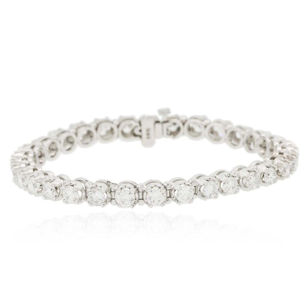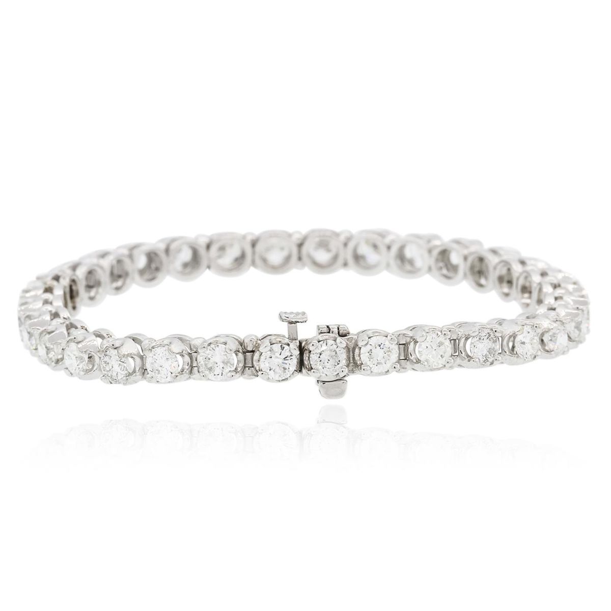 One electronically tested 14KT white gold ladies combination cast & assembled tennis bracelet with a hidden box clasp with a bright polish finish. Condition is new. Measurements: 7" in length. Identified with markings of "14K". Containing: Thirty-Two prong set round brilliant cut diamonds, measuring 3.80 - 3.80 x 2.28mm (depth est.) approximate total weight of 32 Stones = 6.43ct. Clarity: SI-1 to I-1. Color: I - J, Cut is Good. All diamonds are graded in the mounting, unless otherwise stated. Total Weight of Diamonds 6.43ct. Total Weight of Bracelet 18.10 grams. GGL Appraised at $27,740.00.