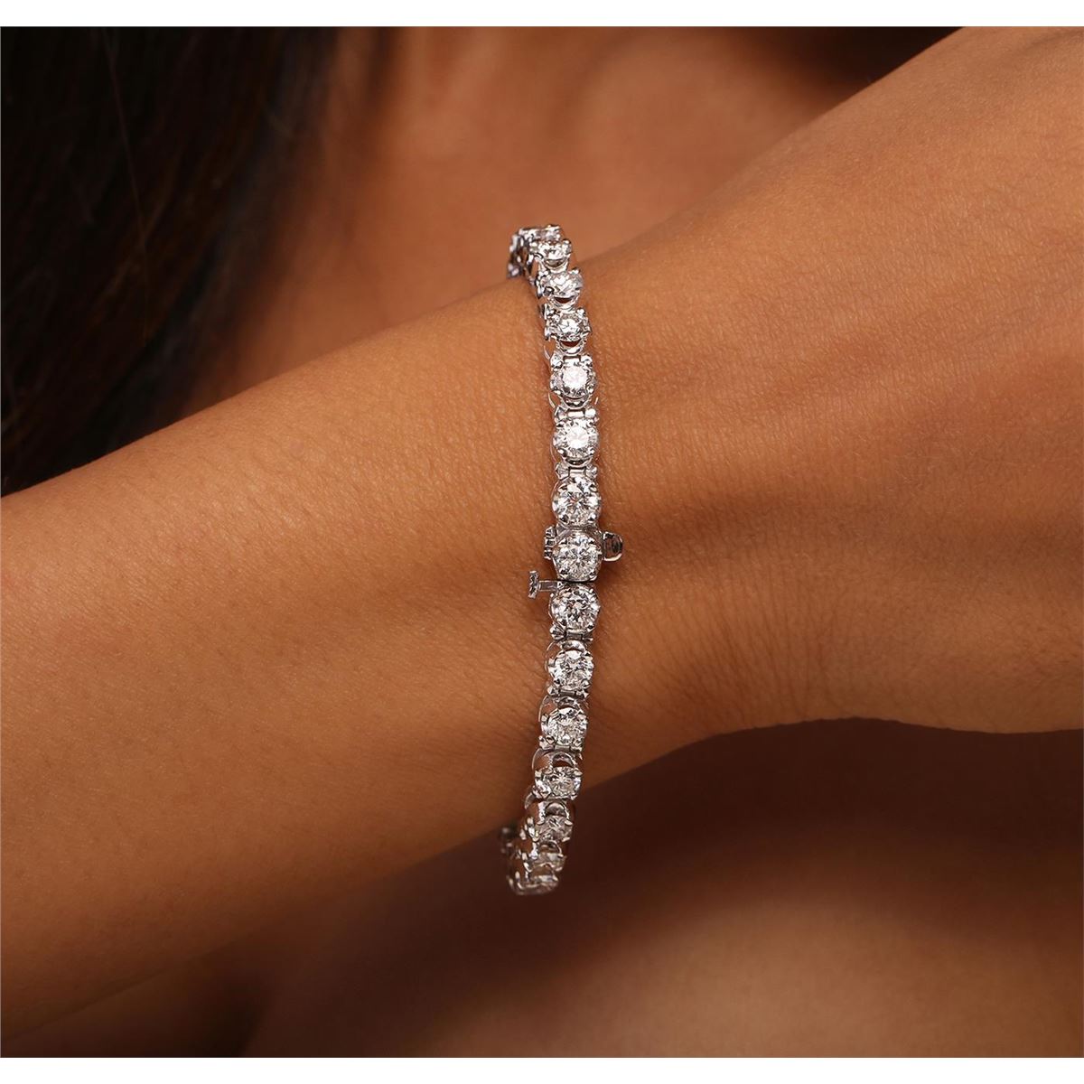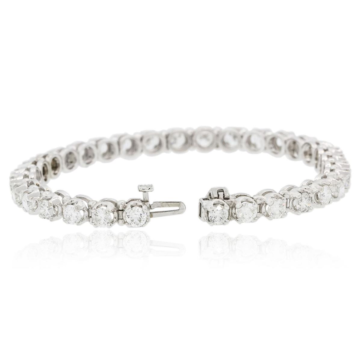 One electronically tested 14KT white gold ladies combination cast & assembled tennis bracelet with a hidden box clasp with a bright polish finish. Condition is new. Measurements: 7" in length. Identified with markings of "14K". Containing: Thirty-Two prong set round brilliant cut diamonds, measuring 3.80 - 3.80 x 2.28mm (depth est.) approximate total weight of 32 Stones = 6.43ct. Clarity: SI-1 to I-1. Color: I - J, Cut is Good. All diamonds are graded in the mounting, unless otherwise stated. Total Weight of Diamonds 6.43ct. Total Weight of Bracelet 18.10 grams. GGL Appraised at $27,740.00.