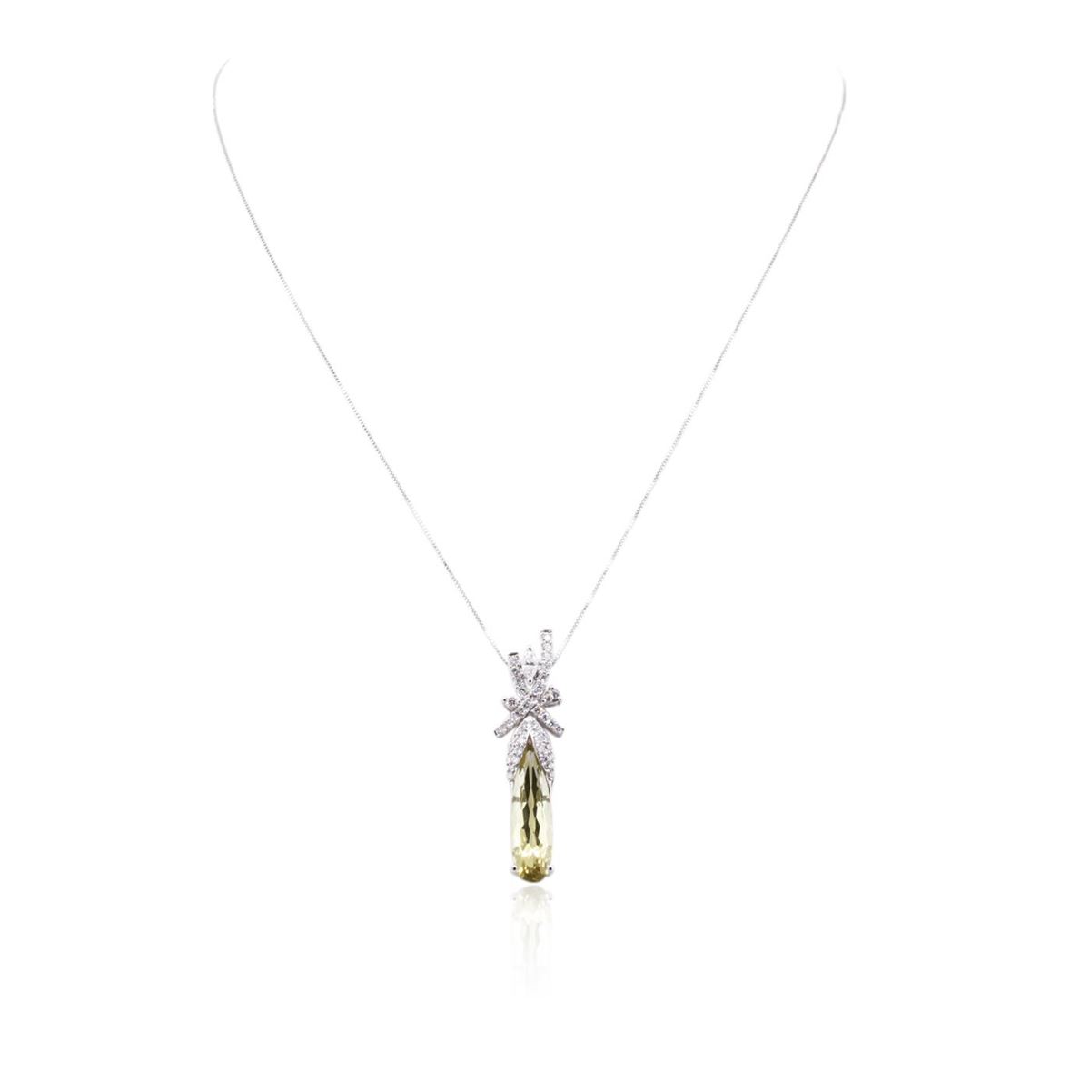 One electronically tested 14KT white gold ladies combination cast & assembled citrine and diamond pendant & chain 16.0" long, box link with a spring ring clasp with a bright polish finish. Identified with markings of "14K". Condition is new. Containing: One prong set pear modified mixed cut natural citrine quartz, measuring 28.00. x 7.09 x 6.10mm, approximate weight of 6.44ct., clarity is eye clean, type I, medium light, brownish, green color, (GIA yO 4/3), cut is good. Forty-Three prong set round brilliant cut diamonds, measuring 1.80 - 1.30 x 0.93mm (depth est.) approximate total weight of 43 Stones = 0.59ct. Clarity: SI-1 to SI-2. Color: I - J, Cut is Good. One prong set marquise shaped cut diamond, measuring 5.00. x 2.50 x 1.58mm (depth est.) approximate weight of 0.12ct. Clarity: SI-1. Color: I, Cut is Good. One prong set pear shaped cut diamond, measuring 3.00. x 2.50 x 1.58mm (depth est.) approximate weight of 0.07ct. Clarity: SI-1. Color: I, Cut is Good. Colored gemstones are presumed to have been subjected to commonly used enhancement processes. All diamonds and colored gemstones are graded in the mounting, unless otherwise stated. Total Weight of Colored Stones 6.44ct. Total Weight of Diamonds 0.77ct. Total Weight of Pendant & Chain 6.40 grams. GGL Appraised at $3,465.00.