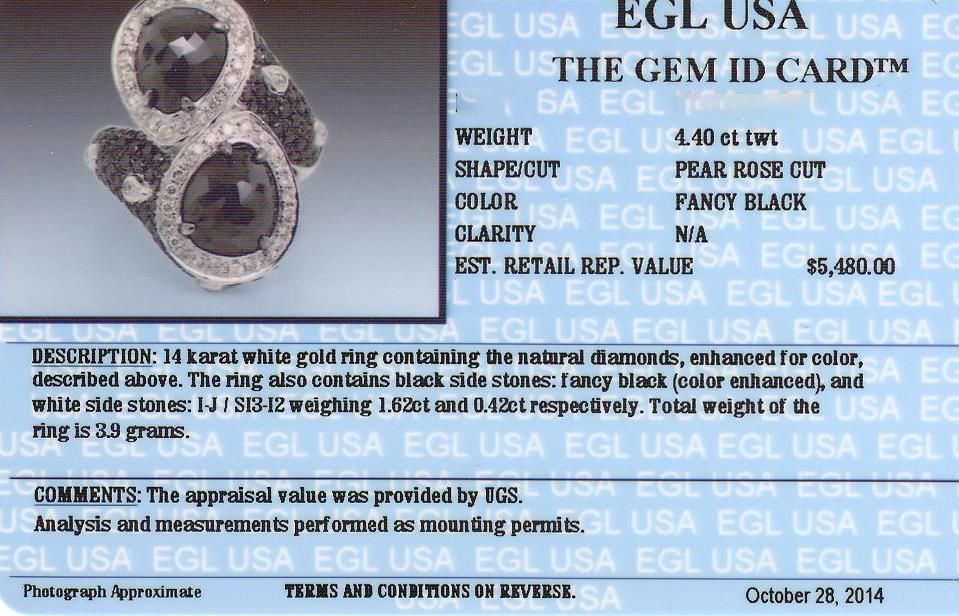 One 14KT white gold ring containing natural pear rose cut fancy black diamonds, enhanced for color, with a total weight of 4.40ct. The ring also contains black side stones: fancy black (color enhanced), and white side stones: I-J / SI3-I2 weighing 1.62ct and 0.42ct respectively. Total weight of the ring is 3.90 grams. EGL Appraised at $5,480.00.