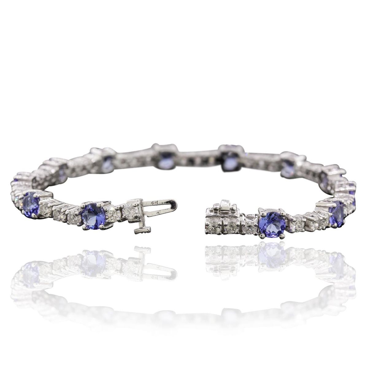 One electronically tested 14KT white gold ladies combination cast & assembled bracelet with a hidden box clasp with a bright polish finish. Condition is new. Measurements: 7" in length. Identified with markings of "14K". Containing: Twelve prong set round modified brilliant cut natural tanzanites, measuring 5.00 - 5.00 x 3.25 mm, approximate total weight of 6.48ct., clarity is eye clean, type I, medium light, moderately strong, bluish violet color, (GIA bV 4/4), cut is good. Thirty-Eight prong set round brilliant cut diamonds, measuring 3.00 - 2.90 x 1.77mm (depth est.) approximate total weight of 38 Stones = 3.57ct. Clarity: SI-2 to I-1. Color: J, Cut is Good. Colored gemstones are presumed to have been subjected to commonly used enhancement processes. All diamonds and colored gemstones are graded in the mounting, unless otherwise stated. Total Weight of Colored Stones 6.48ct. Total Weight of Diamonds 3.57ct. Total Weight of Bracelet 15.10 grams. GGL Appraised at $23,720.00.