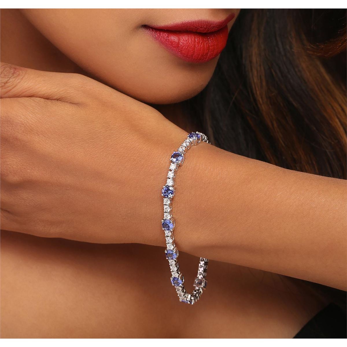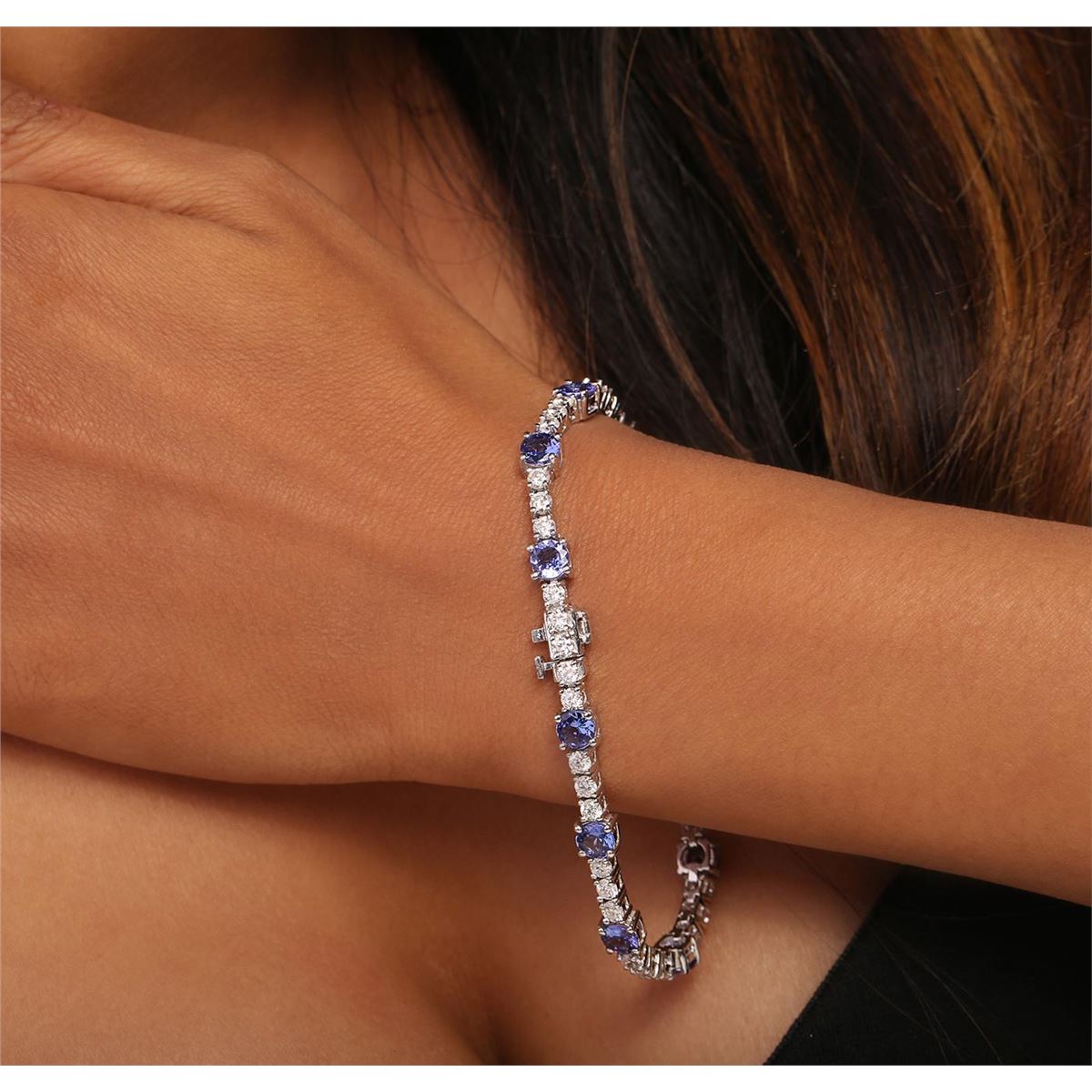 One electronically tested 14KT white gold ladies combination cast & assembled bracelet with a hidden box clasp with a bright polish finish. Condition is new. Measurements: 7" in length. Identified with markings of "14K". Containing: Twelve prong set round modified brilliant cut natural tanzanites, measuring 5.00 - 5.00 x 3.25 mm, approximate total weight of 6.48ct., clarity is eye clean, type I, medium light, moderately strong, bluish violet color, (GIA bV 4/4), cut is good. Thirty-Eight prong set round brilliant cut diamonds, measuring 3.00 - 2.90 x 1.77mm (depth est.) approximate total weight of 38 Stones = 3.57ct. Clarity: SI-2 to I-1. Color: J, Cut is Good. Colored gemstones are presumed to have been subjected to commonly used enhancement processes. All diamonds and colored gemstones are graded in the mounting, unless otherwise stated. Total Weight of Colored Stones 6.48ct. Total Weight of Diamonds 3.57ct. Total Weight of Bracelet 15.10 grams. GGL Appraised at $23,720.00.