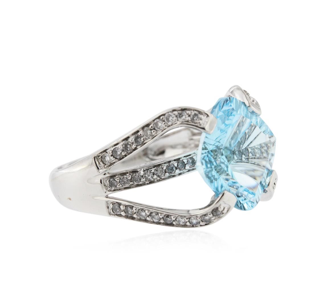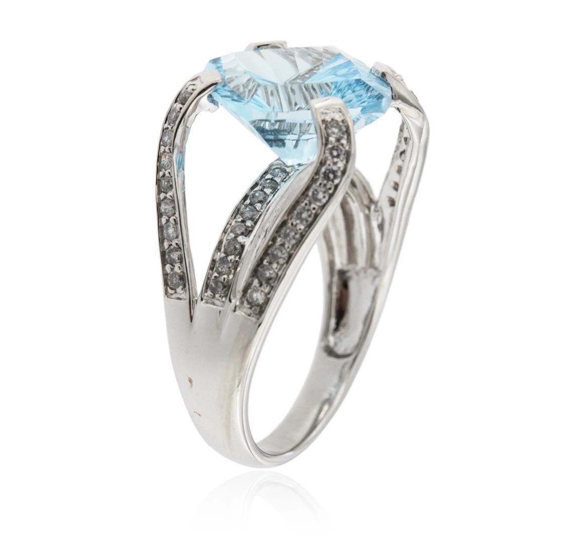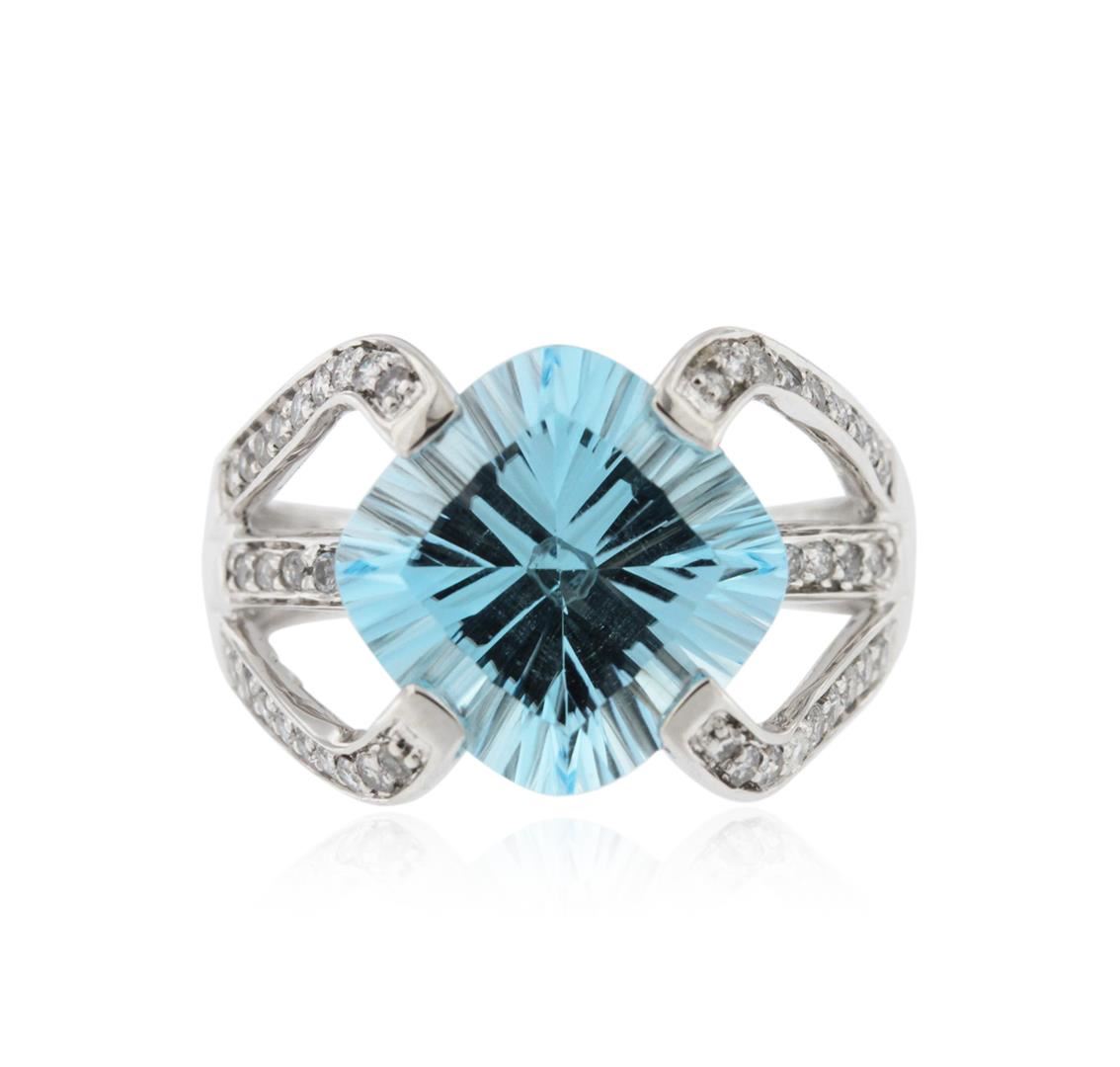 One ring featuring: 14KT white gold weighing 6.23 grams containing one princess cut blue topaz weighing 6.50ct and round cut diamonds weighing a total of 0.46ct.