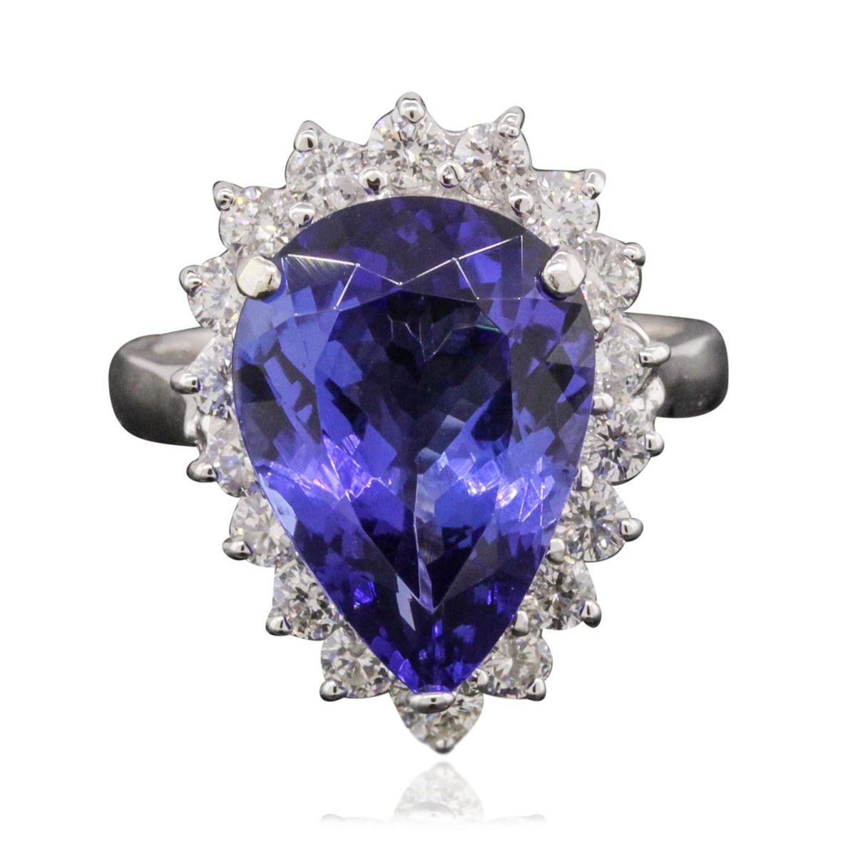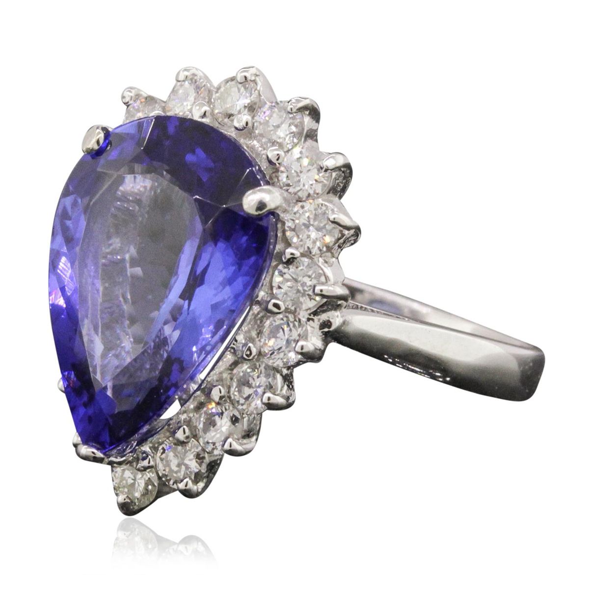 One electronically tested 14KT white gold ladies combination cast & assembled ring with a bright polish finish. Condition is new. Identified with markings of "K14". Containing: One prong set pear modified brilliant cut natural tanzanite, measuring 14.67 x 10.91 x 6.07mm, approximate weight of 6.51ct., clarity is eye clean, type I, medium, moderately strong, violetish blue color, (GIA vB 5/4), cut is good. Eighteen prong set round brilliant cut diamonds, measuring 2.20 - 2.20 x 1.32mm (depth est.) approximate. Total Weight of 18 Stones = 0.70ct. Clarity: SI-2 to I-1. Color: J - K, Cut is Good. Colored gemstones are presumed to have been subjected to commonly used enhancement processes. All diamonds and colored gemstones are graded in the mounting, unless otherwise stated. Total Weight of Colored Stones 6.51ct. Total Weight of Diamonds 0.70ct. Total Weight of Ring 6.60 grams. GGL Appraised at $12,150.00.