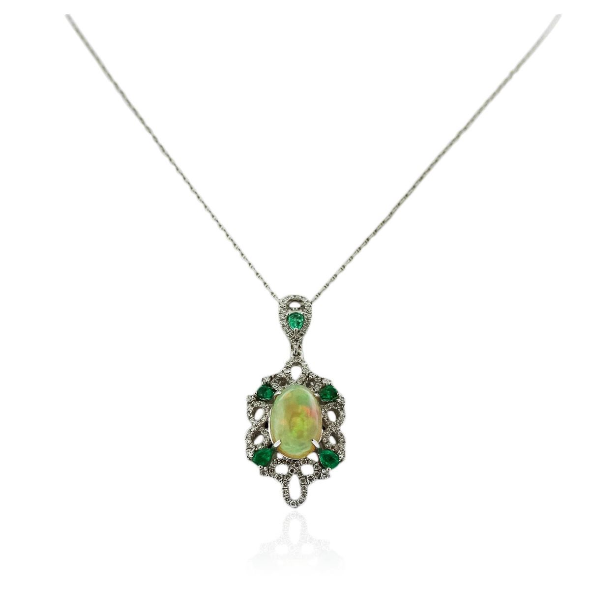 One electronically tested 14KT white gold ladies cast opal, emerald and diamond pendant & chain 18.0" long, cable link with a spring ring clasp with a bright polish finish. Identified with markings of "14K". Condition is new. Containing: One opal that is cut in a oval shaped cabochon and is prong set, measuring 14.00. mm long x 9.40 mm wide, and 8.00. mm thick and the approximate weight is 6.56 carats. The opal has a somewhat bright, multicolor play of color (fire) in a flashfire pattern; a high dome; a good cut; no inclusions; slight variation in base in its brightness and pattern; and is somewhat directional. Five prong set pear modified brilliant cut natural emeralds, measuring 4.00. x 2.50 x 1.63mm, approximate total weight of 0.45ct., clarity is slightly included, type III, medium, moderately strong, green color, (GIA G 5/4), cut is good. One Hundred Two prong set round brilliant cut diamonds, measuring 1.30 - 1.30 x 0.78mm (depth est.) approximate total weight of 102 Stones = 0.82ct. Clarity: SI-1 to SI-2. Color: I - J, Cut is Good. Colored gemstones are presumed to have been subjected to commonly used enhancement processes. All diamonds and colored gemstones are graded in the mounting, unless otherwise stated. Total Weight of Colored Stones 7.01ct. Total Weight of Diamonds 0.82ct. Total Weight of Pendant & Chain 6.90 grams. GGL Appraised at $4,595.00.