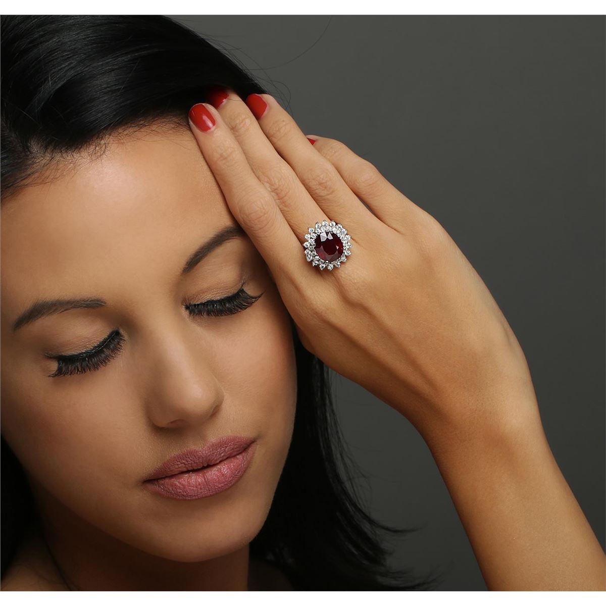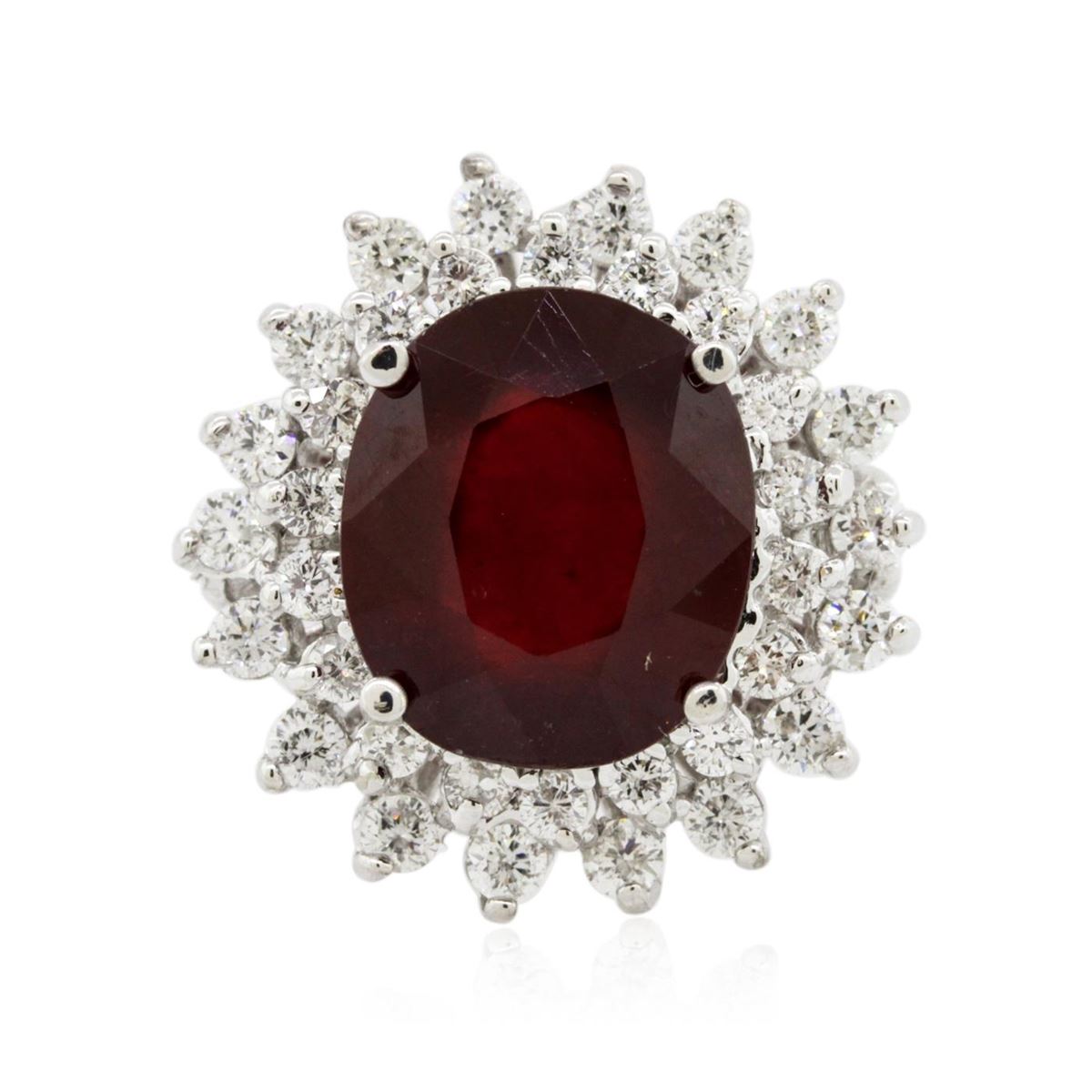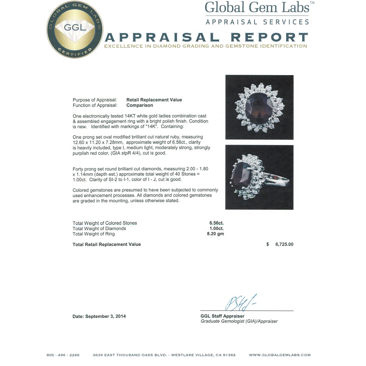One electronically tested 14KT white gold ladies combination cast & assembled engagement ring with a bright polish finish. Identified with markings of "14K". Condition is new. Containing: One prong set oval modified brilliant cut natural ruby, measuring 12.60 x 11.20 x 7.28mm, approximate weight of 6.56ct., clarity is heavily included, type I, medium light, moderately strong, strongly purplish red color, (GIA stpR 4/4), cut is good. Forty prong set round brilliant cut diamonds, measuring 2.00 - 1.80 x 1.14mm (depth est.) approximate total weight of 40 Stones = 1.00ct. Clarity: SI-2 to I-1. Color: I - J, Cut is Good. Colored gemstones are presumed to have been subjected to commonly used enhancement processes. All diamonds and colored gemstones are graded in the mounting, unless otherwise stated. Total Weight of Colored Stones 6.56ct. Total Weight of Diamonds 1.00ct. Total Weight of Ring 8.20 grams. GGL Appraised at $6,725.00.