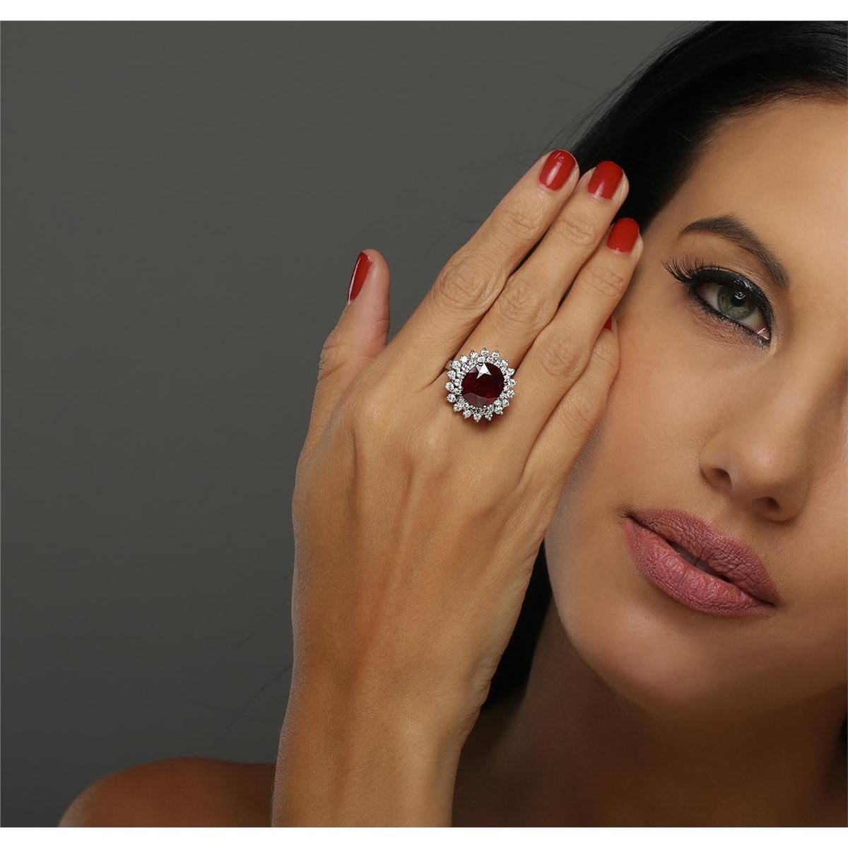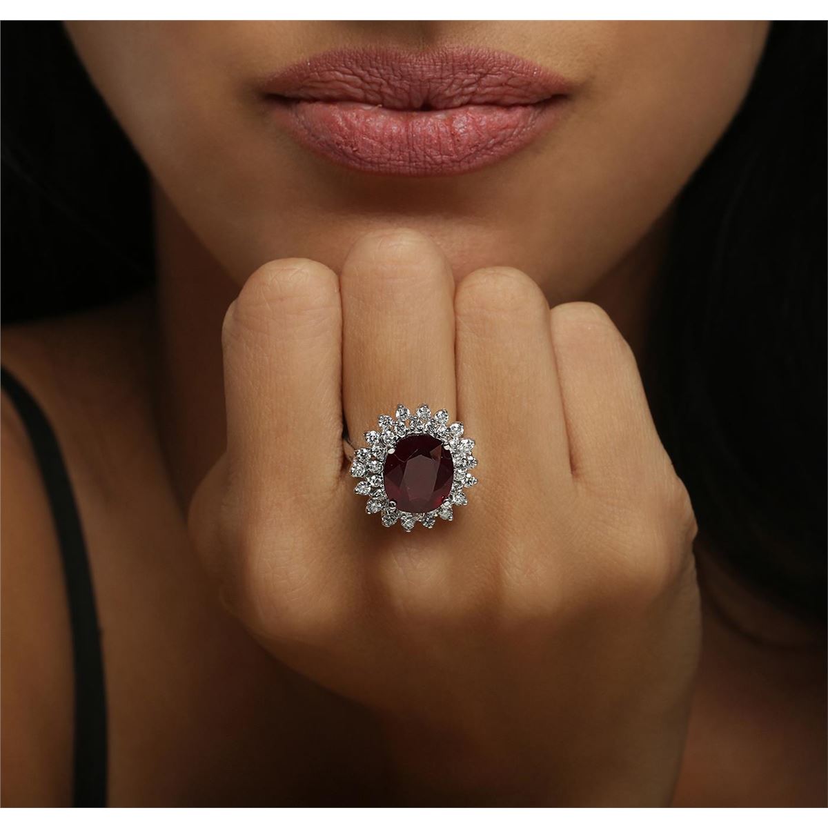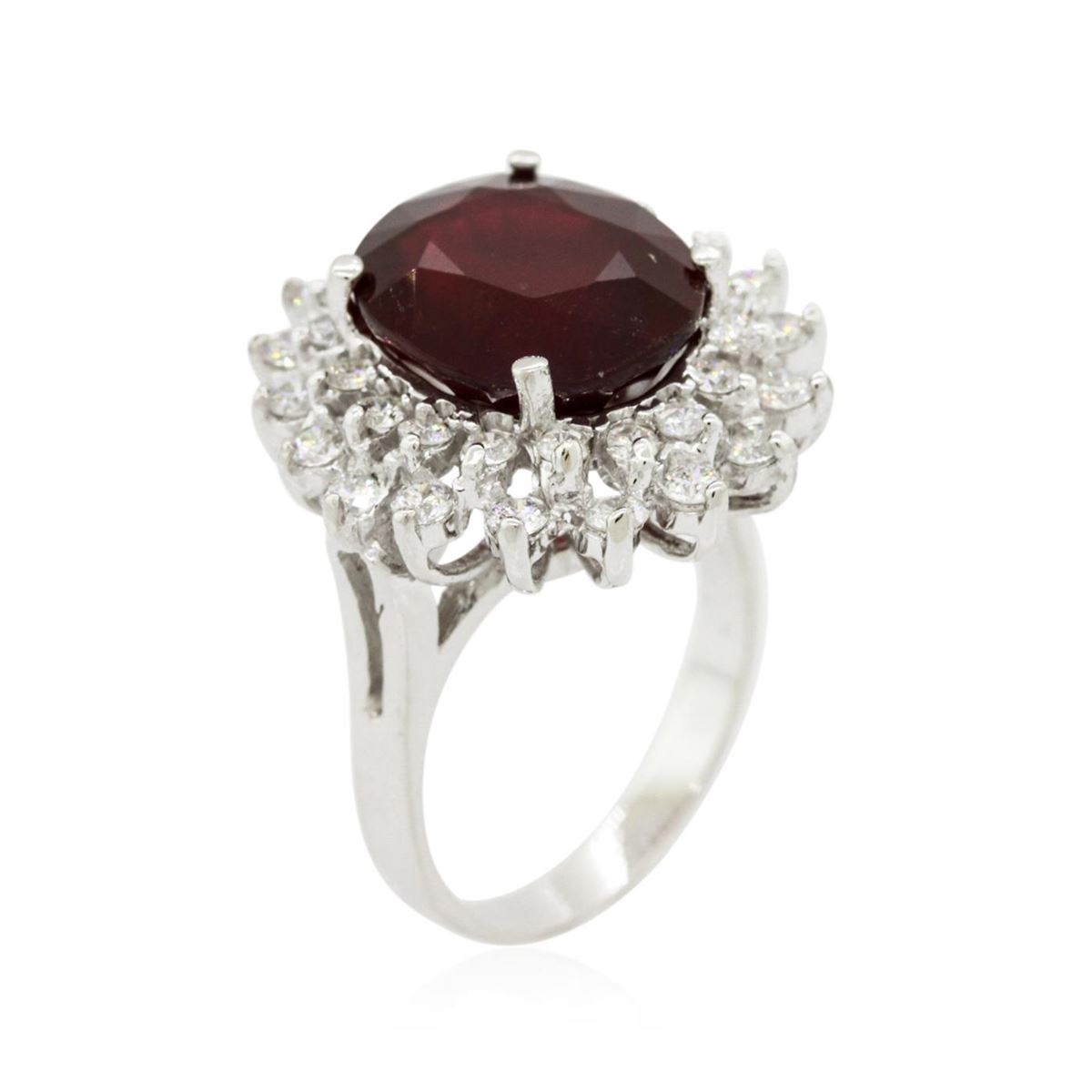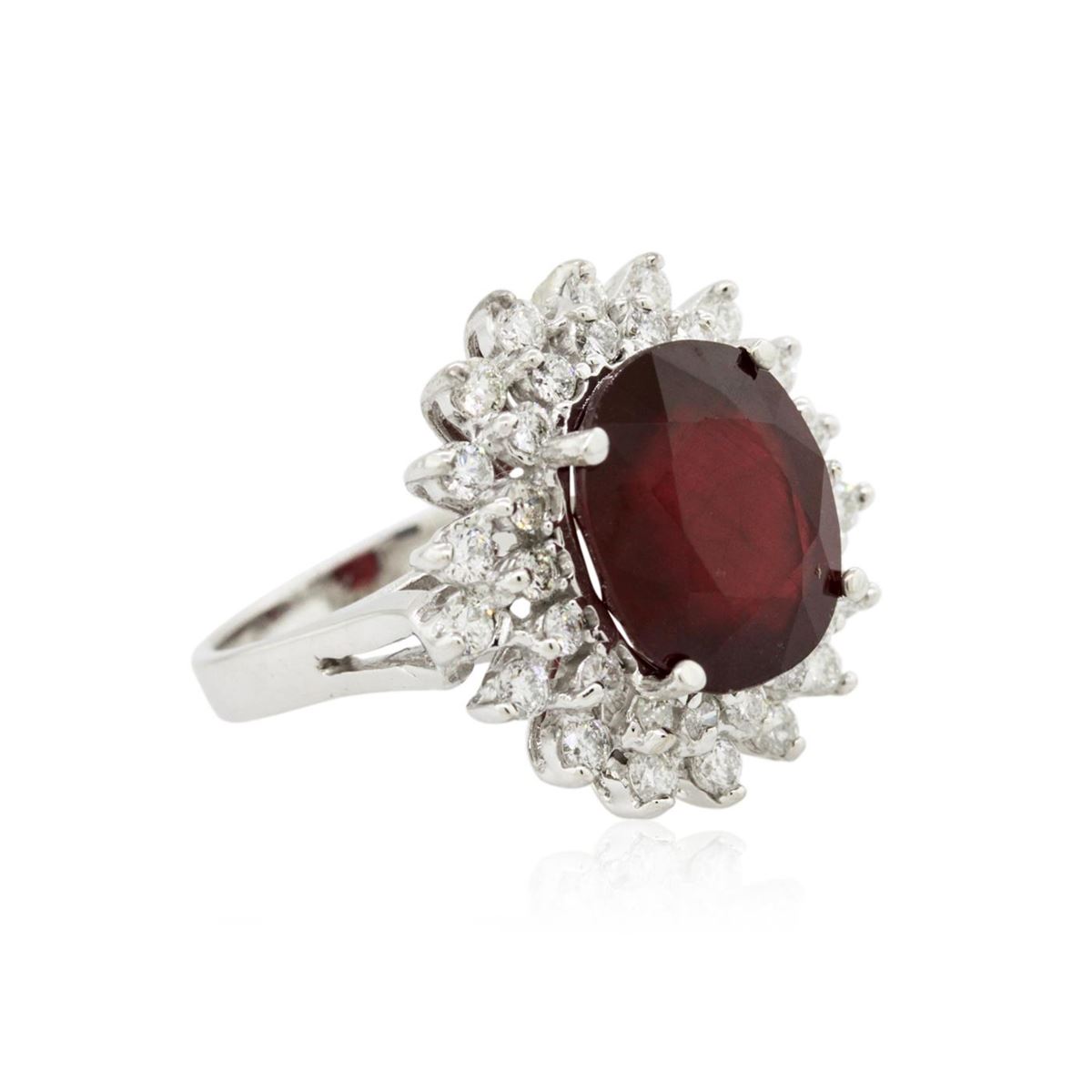 One electronically tested 14KT white gold ladies combination cast & assembled engagement ring with a bright polish finish. Identified with markings of "14K". Condition is new. Containing: One prong set oval modified brilliant cut natural ruby, measuring 12.60 x 11.20 x 7.28mm, approximate weight of 6.56ct., clarity is heavily included, type I, medium light, moderately strong, strongly purplish red color, (GIA stpR 4/4), cut is good. Forty prong set round brilliant cut diamonds, measuring 2.00 - 1.80 x 1.14mm (depth est.) approximate total weight of 40 Stones = 1.00ct. Clarity: SI-2 to I-1. Color: I - J, Cut is Good. Colored gemstones are presumed to have been subjected to commonly used enhancement processes. All diamonds and colored gemstones are graded in the mounting, unless otherwise stated. Total Weight of Colored Stones 6.56ct. Total Weight of Diamonds 1.00ct. Total Weight of Ring 8.20 grams. GGL Appraised at $6,725.00.