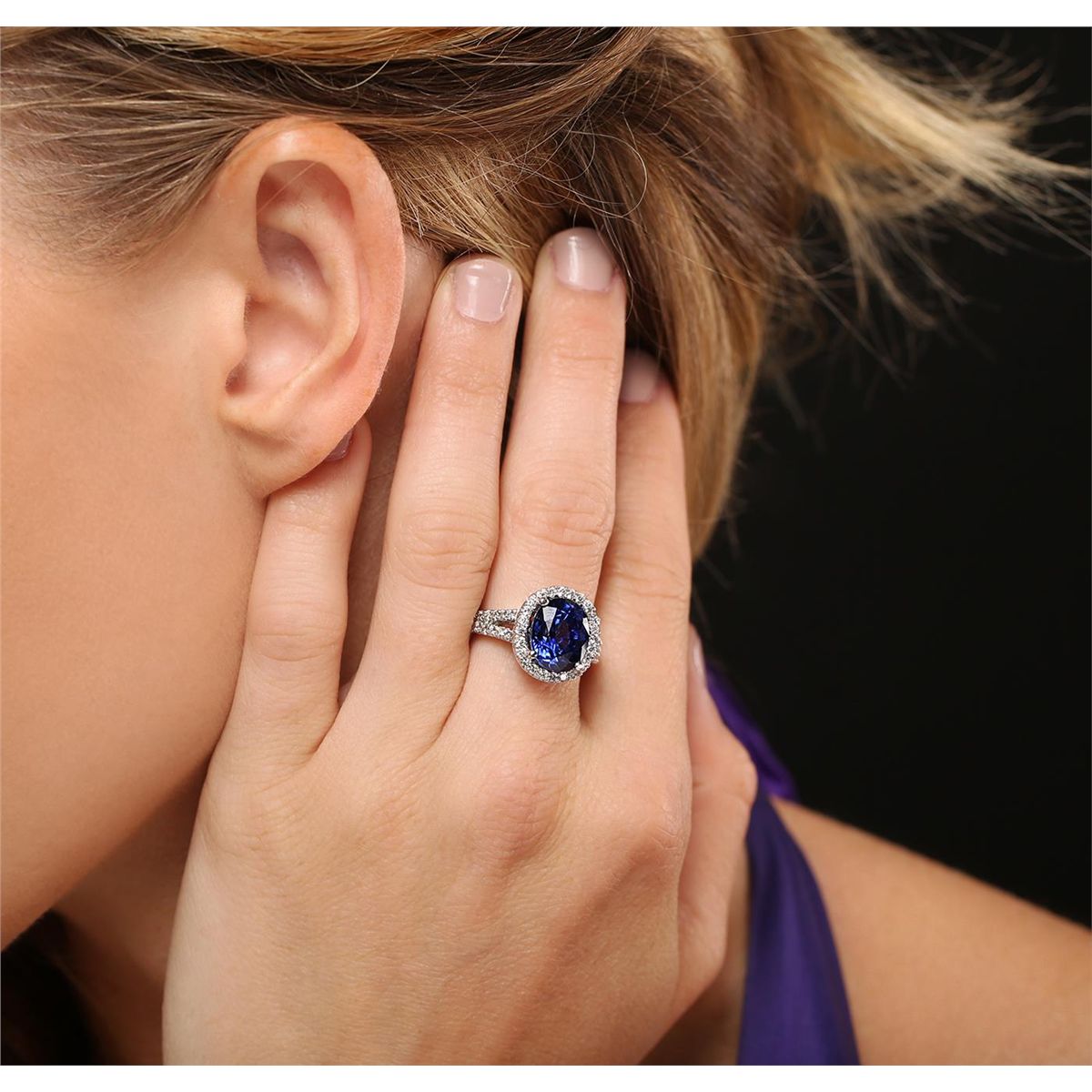 One electronically tested 14KT white gold Ladies combination cast & assembled fancy ring with a bright polish finish. Identified with markings of "14K". Condition is excellent. Containing: One prong set oval modified brilliant cut natural blue sapphire, measuring 11.10 x 9.10 x 6.50mm, approximate weight of 6.64ct., clarity is eye clean, type II, cut is very good. Colored gemstones are presumed to have been subjected to commonly used and possible undetectable color/clarity enhancement processes. Forty-Eight prong set round brilliant cut diamonds, measuring 1.60 x 0.96mm (depth est.) approximate total weight of 48 Stones = 0.78ct. Clarity of SI-1 to SI-2, Color of J - K, Cut is Good. Total Weight of Colored Stones 6.64ct. Total Weight of Diamonds 0.78ct. Total Weight of Ring 8.90gm. GGL Appraised at $17,645.00.