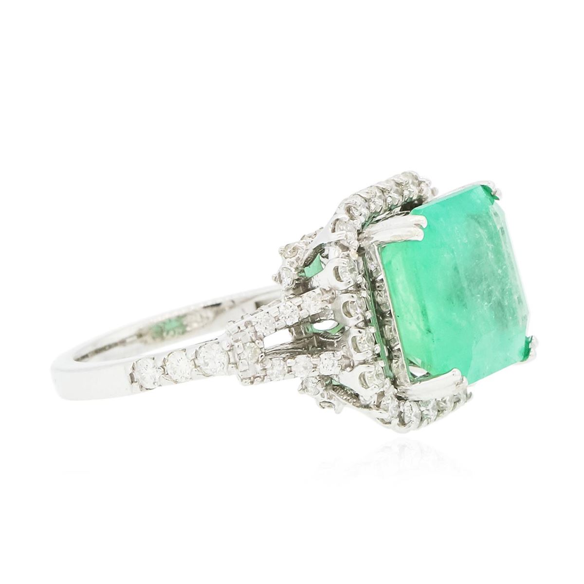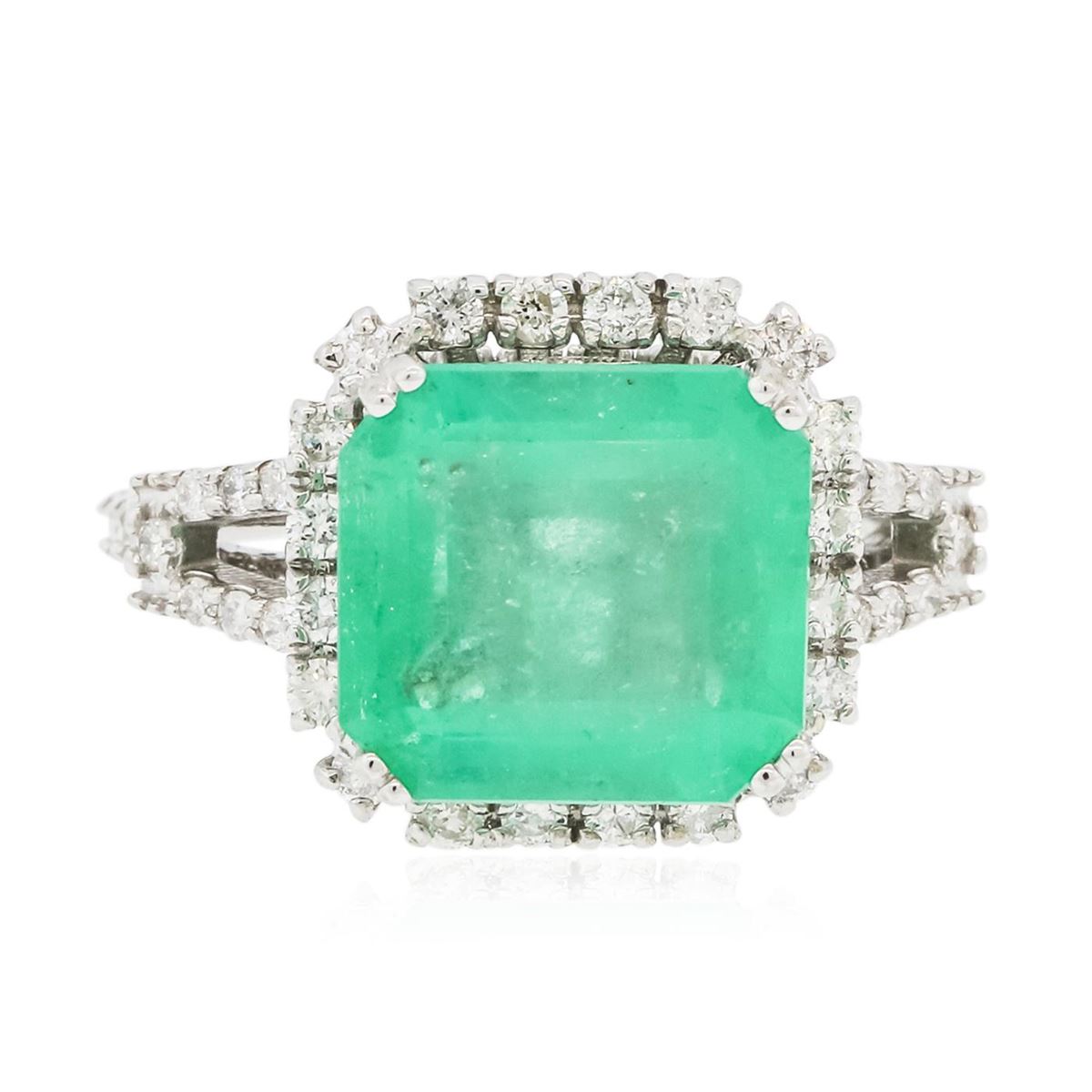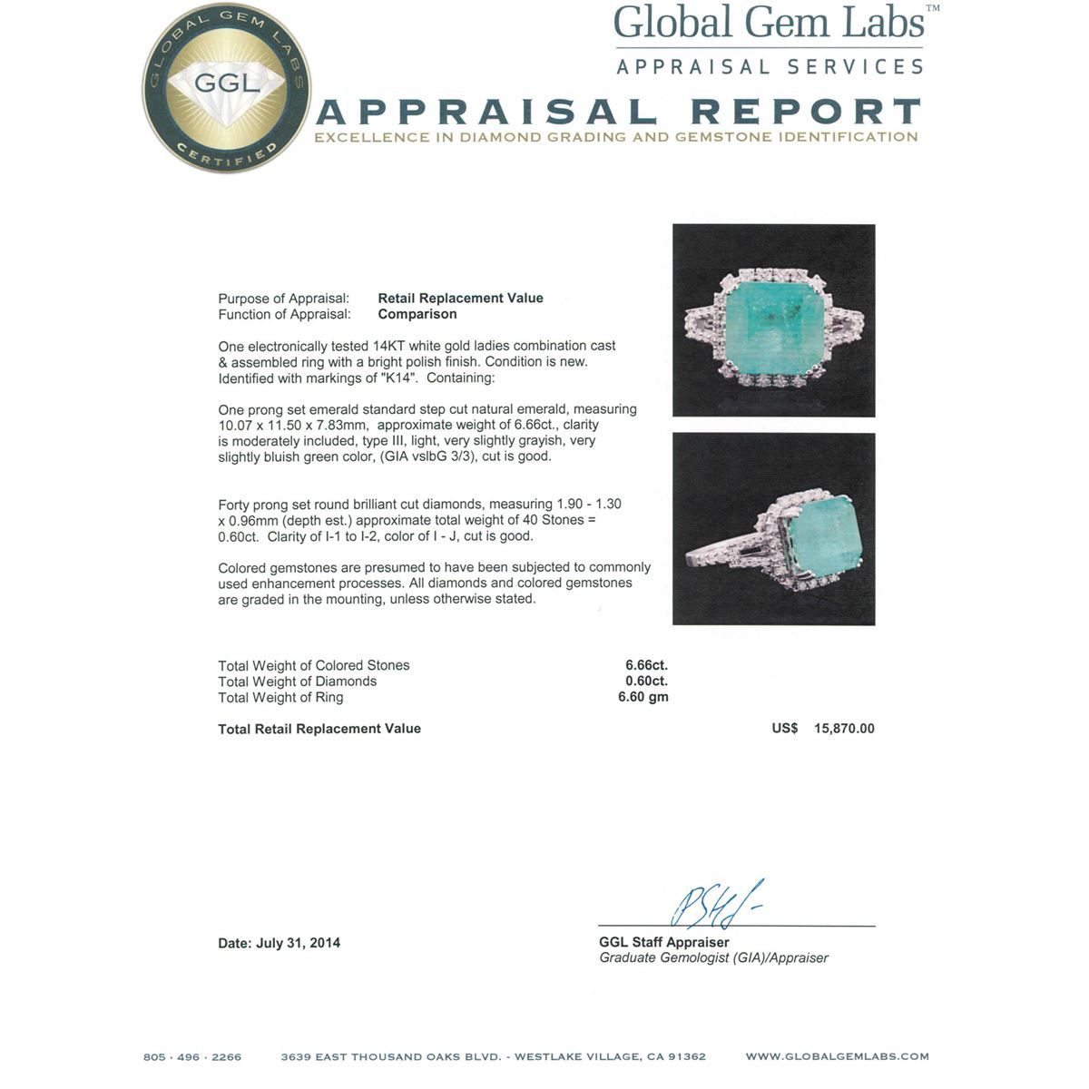 One electronically tested 14KT white gold ladies combination cast & assembled ring with a bright polish finish. Condition is new. Identified with markings of "K14". Containing: One prong set emerald standard step cut natural emerald, measuring 10.07 x 11.50 x 7.83mm, approximate weight of 6.66ct., clarity is moderately included, type III, light, very slightly grayish, very slightly bluish green color, (GIA vslbG 3/3), cut is good. Forty prong set round brilliant cut diamonds, measuring 1.90 - 1.30 x 0.96mm (depth est.) approximate. Total Weight of 40 Stones = 0.60ct. Clarity: I-1 to I-2. Color: I - J, Cut is Good. Colored gemstones are presumed to have been subjected to commonly used enhancement processes. All diamonds and colored gemstones are graded in the mounting, unless otherwise stated. Total Weight of Colored Stones 6.66ct. Total Weight of Diamonds 0.60ct. Total Weight of Ring 6.60 grams. GGL Appraised at $15,870.00.