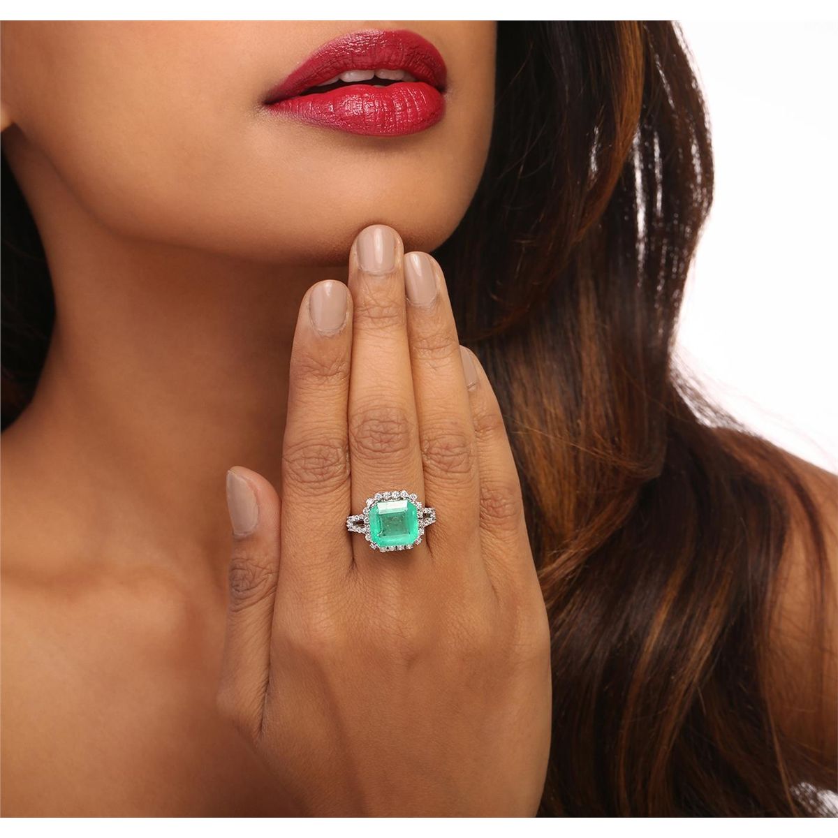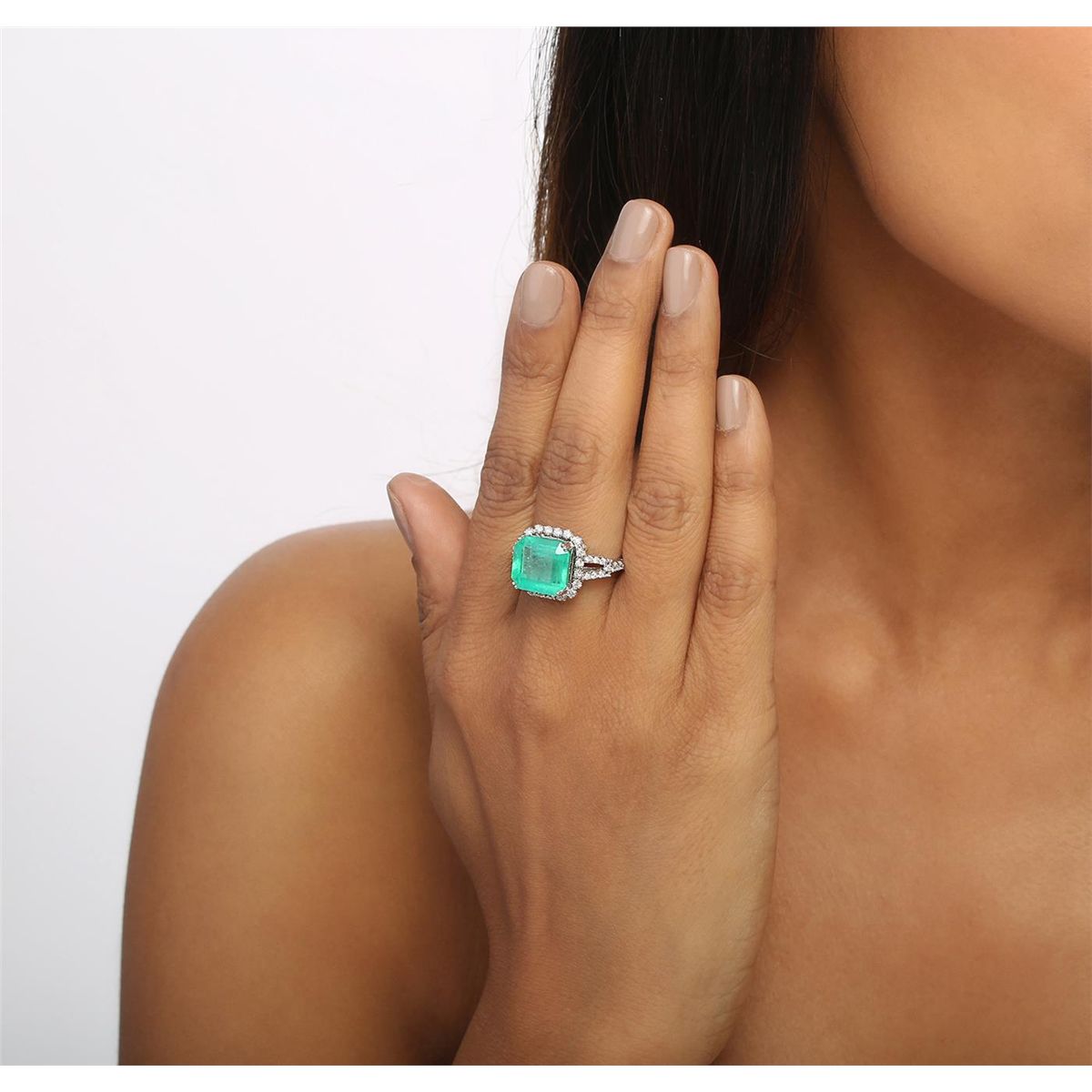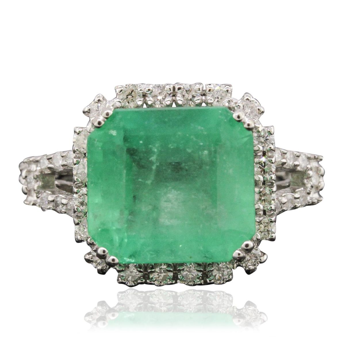 One electronically tested 14KT white gold ladies combination cast & assembled ring with a bright polish finish. Condition is new. Identified with markings of "K14". Containing: One prong set emerald standard step cut natural emerald, measuring 10.07 x 11.50 x 7.83mm, approximate weight of 6.66ct., clarity is moderately included, type III, light, very slightly grayish, very slightly bluish green color, (GIA vslbG 3/3), cut is good. Forty prong set round brilliant cut diamonds, measuring 1.90 - 1.30 x 0.96mm (depth est.) approximate. Total Weight of 40 Stones = 0.60ct. Clarity: I-1 to I-2. Color: I - J, Cut is Good. Colored gemstones are presumed to have been subjected to commonly used enhancement processes. All diamonds and colored gemstones are graded in the mounting, unless otherwise stated. Total Weight of Colored Stones 6.66ct. Total Weight of Diamonds 0.60ct. Total Weight of Ring 6.60 grams. GGL Appraised at $15,870.00.