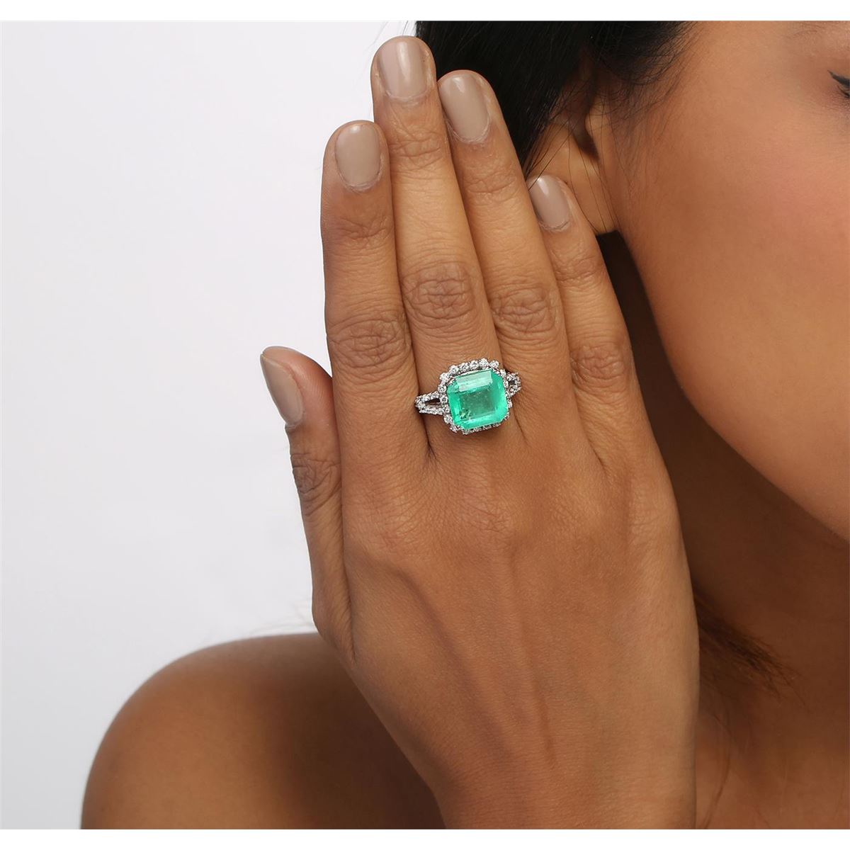 One electronically tested 14KT white gold ladies combination cast & assembled ring with a bright polish finish. Condition is new. Identified with markings of "K14". Containing: One prong set emerald standard step cut natural emerald, measuring 10.07 x 11.50 x 7.83mm, approximate weight of 6.66ct., clarity is moderately included, type III, light, very slightly grayish, very slightly bluish green color, (GIA vslbG 3/3), cut is good. Forty prong set round brilliant cut diamonds, measuring 1.90 - 1.30 x 0.96mm (depth est.) approximate. Total Weight of 40 Stones = 0.60ct. Clarity: I-1 to I-2. Color: I - J, Cut is Good. Colored gemstones are presumed to have been subjected to commonly used enhancement processes. All diamonds and colored gemstones are graded in the mounting, unless otherwise stated. Total Weight of Colored Stones 6.66ct. Total Weight of Diamonds 0.60ct. Total Weight of Ring 6.60 grams. GGL Appraised at $15,870.00.