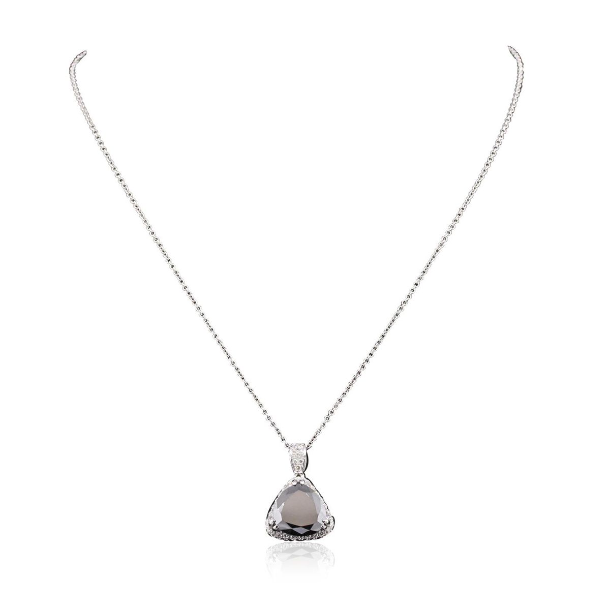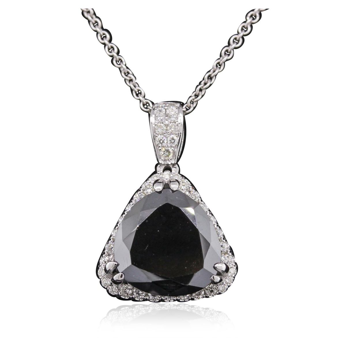 One electronically tested 14KT white gold ladies cast & assembled black and white diamond pendant with chain. Condition is new, good workmanship. The pendant features a black diamond set within a white diamond bezel, completed by a white diamond set bail. The pendant is supported by an eighteen inch length 14KT white gold designer style chain, terminating in a lobster claw clasp. Bright polish finish. Identified with markings of ""14K"". Containing: One prong set triangle cut diamond, measuring 13.00 x 12.90 x 5.80mm (depth est.), 8.00% GTCF approximate weight of 6.08ct. Indications of multiple laboratory enhancements. The specific gravity of black diamond is 3.120 to 3.165. Diamond tester results are non reactive. Graded in the setting. Clarity Déclassé‚ Color Fancy Black; Irradiated Depth 45.0% Table 72.8%. Twenty-Three prong set round brilliant cut diamonds, measuring 1.60 - 1.50 x 0.93mm (depth est.) approximate total weight of 23 Stones = 0.41ct. Graded in the setting. Clarity VS-1 to SI-1 Color G - I Seventeen prong set round brilliant cut diamonds, measuring 1.30 - 1.20 x 0.75mm (depth est.) approximate total weight of 17 Stones = 0.19ct. Graded in the setting. Clarity VS-1 to SI-1 Color G - I Total Weight of Diamonds 6.68 ct. Total Weight of Pendant With Chain 8.21 grams. AIG Appraised at $10,685.00.