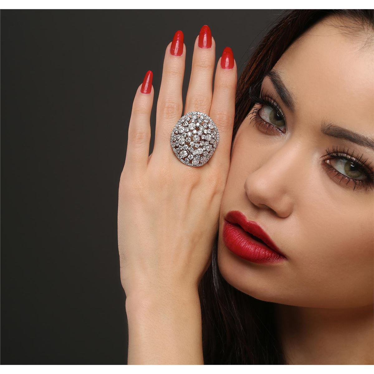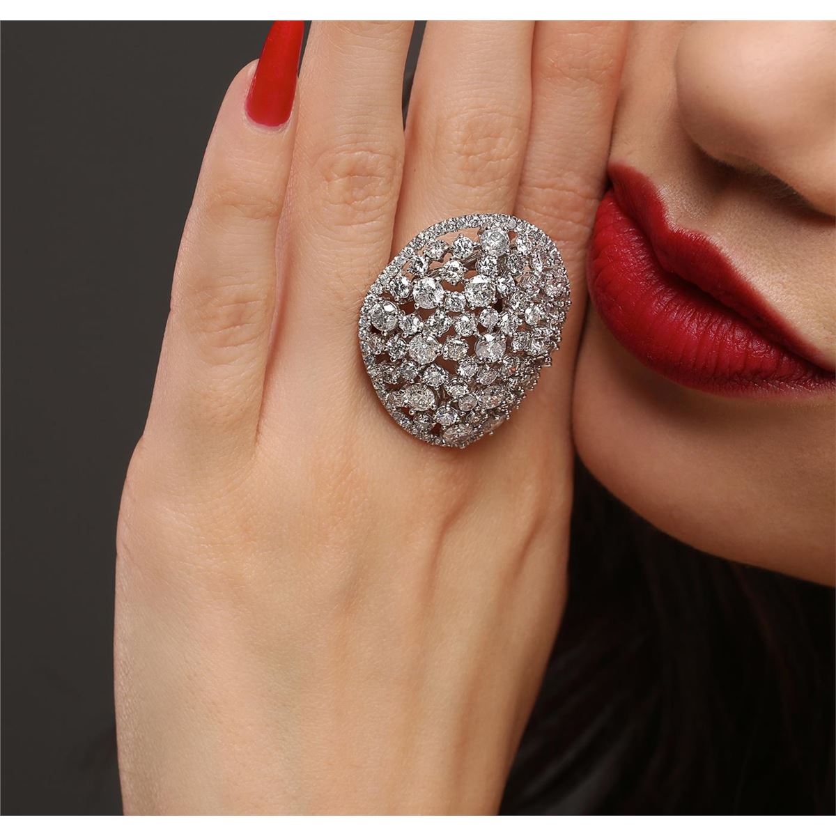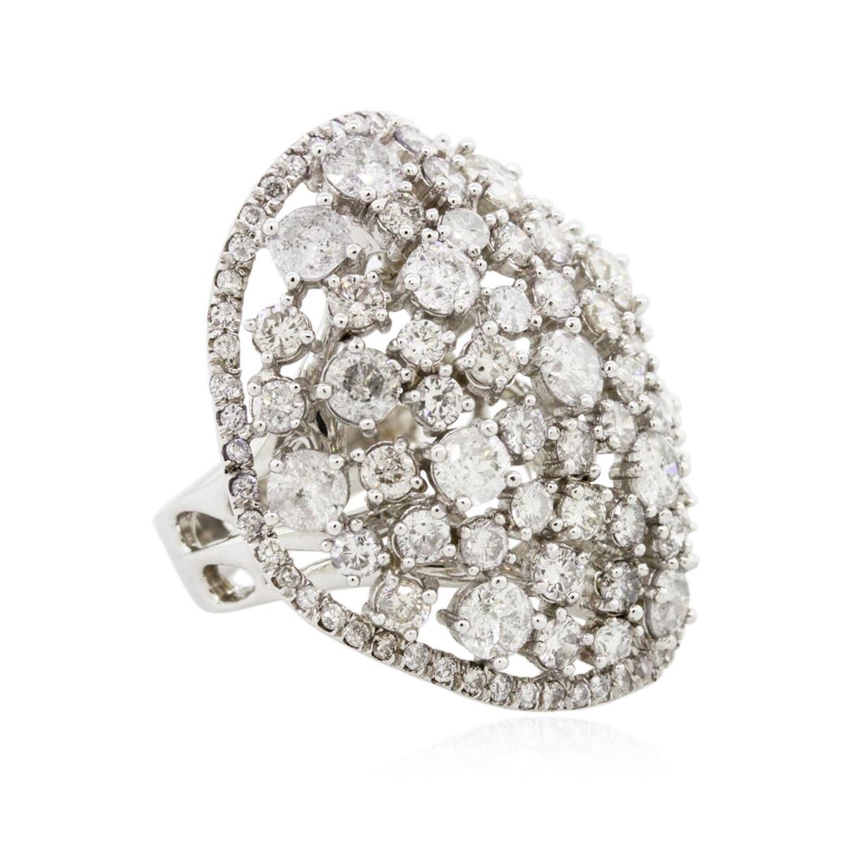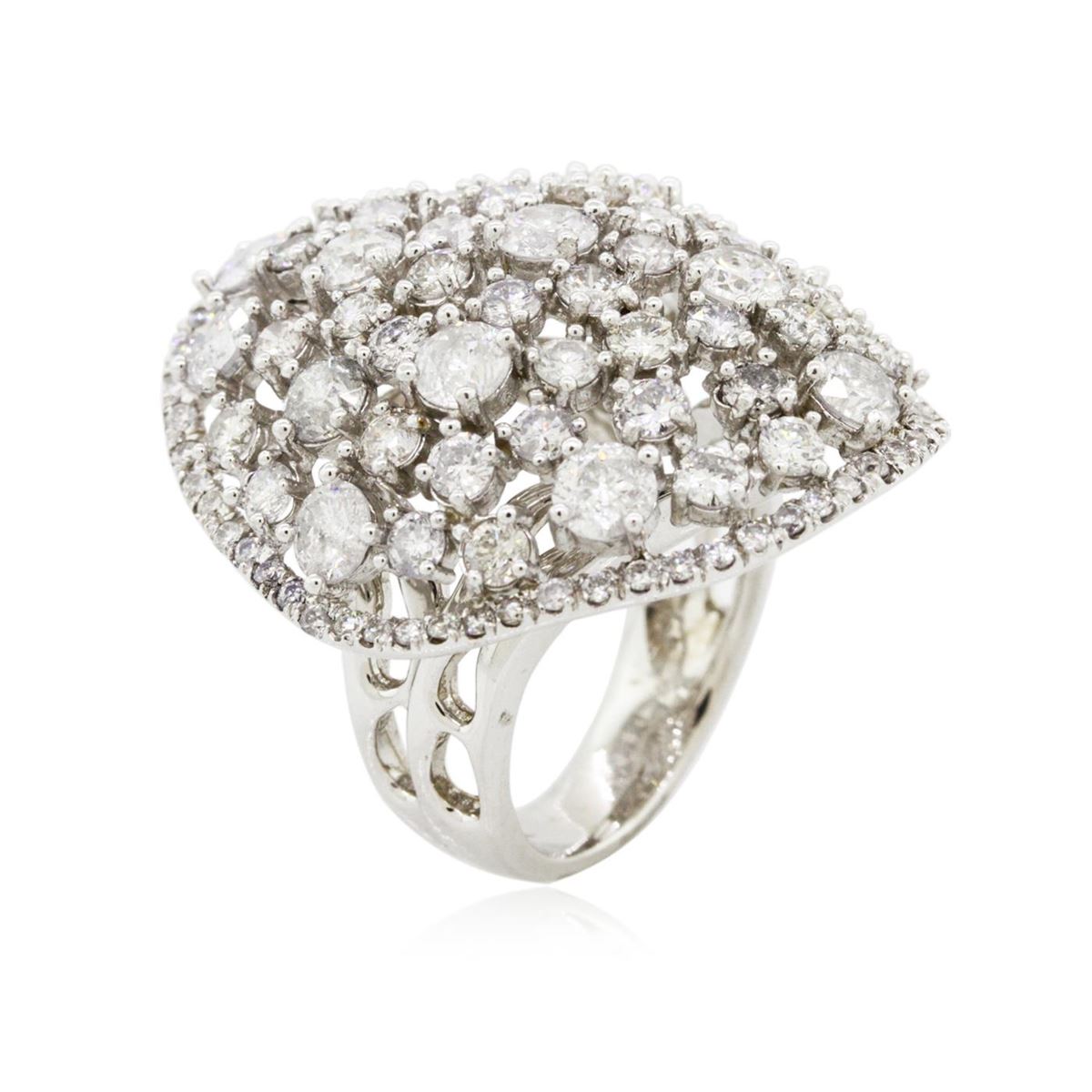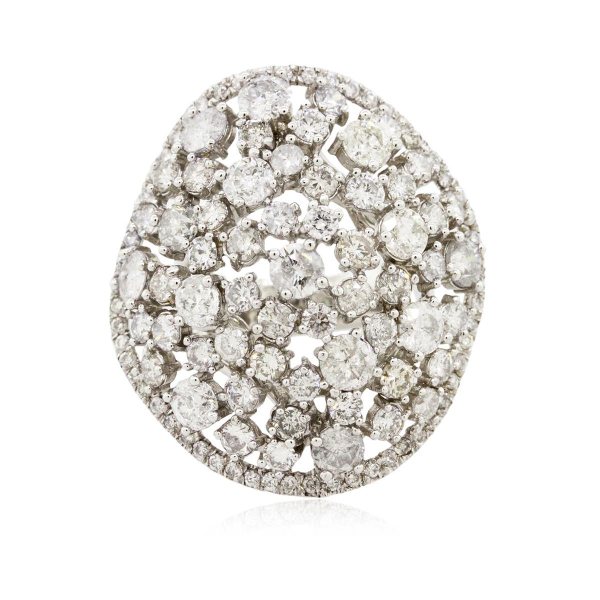 One electronically tested 14KT white gold Ladies combination cast & assembled ring with a bright polish finish. Condition is new. Identified with markings of "14K". Containing: Fifty-Seven prong set round brilliant cut diamonds, measuring 1.40 - 1.40 x 0.84mm (depth est.) approximate. Total Weight of 57 Stones = 0.57ct. Clarity: I-1 to I-2. Color: H - I, Cut is Good. Forty-Five prong set round brilliant cut diamonds, measuring 2.70 - 2.50 x 1.56mm (depth est.) approximate. Total Weight of 45 Stones = 2.89ct. Clarity: SI-2 to I-2. Color: I - J. Fourteen prong set round brilliant cut diamonds, measuring 4.00 - 4.00 x 2.40mm (depth est.) approximate. Total Weight of 14 Stones = 3.28ct. Clarity: I-1 to I-3. Color: I - K. Total Weight of Diamonds 6.74ct. Total Weight of Ring 19.10 grams. GGL Appraised at $20,535.00.